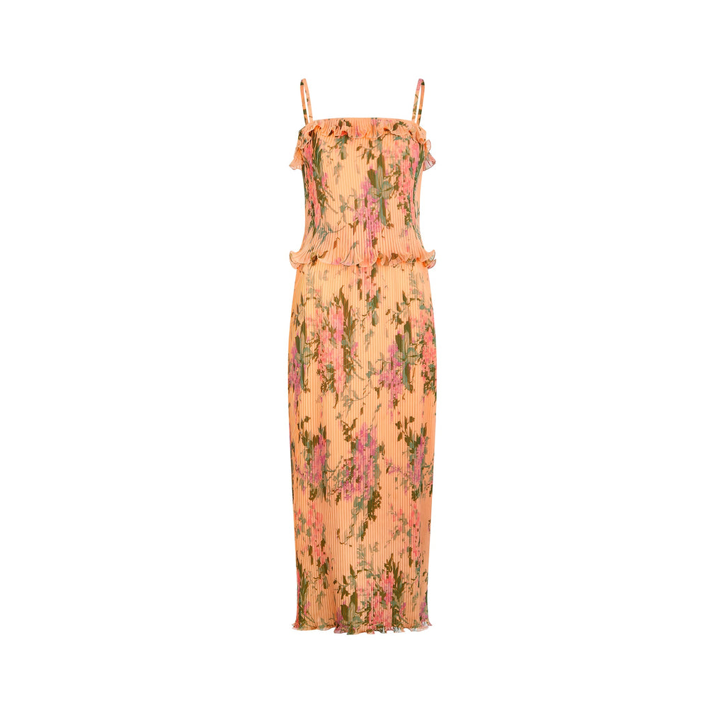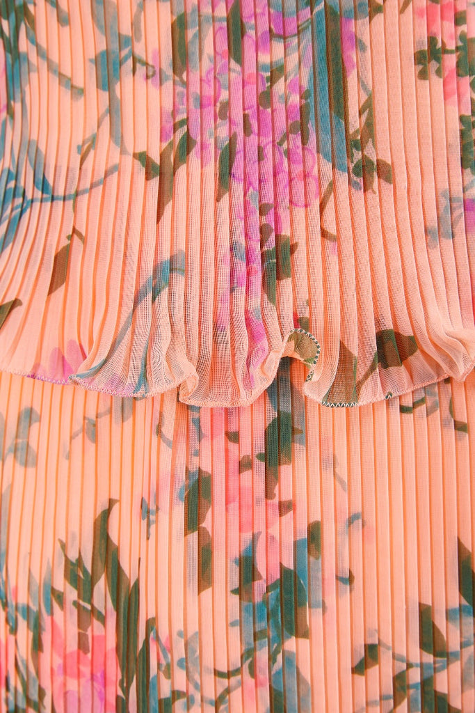 1970s Peach Accordion Pleat Floral Print Maxi Dress