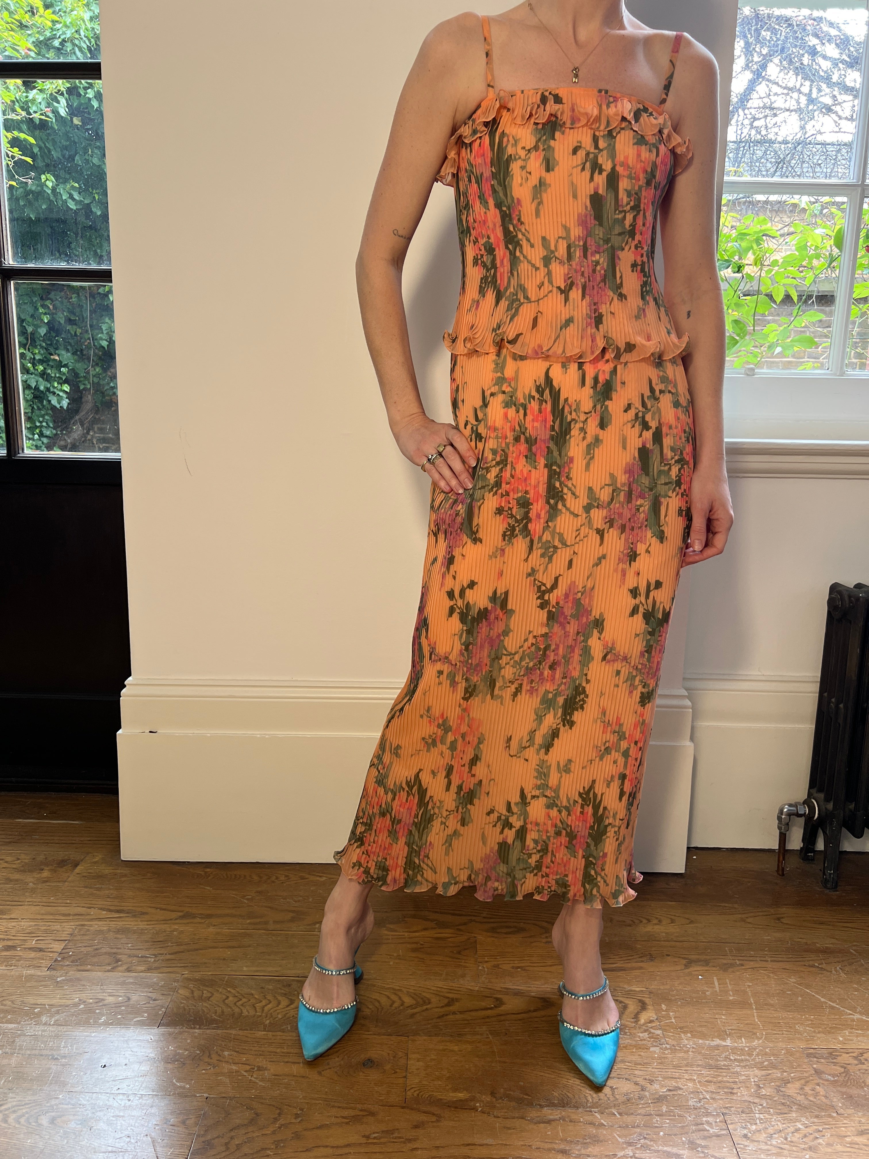 This 1970s maxi dress was bought in Paris and is crafted from man-made peach chiffon splashed with bold lilac and pink florals. Pleated all over with an innovative technique that ensures the folds remain when wet or washed, it has a playful ruffle finish at the bust, waist and bottom hem. The delicate spaghetti straps are in coordinating fabric and it is lined in pale apricot acetate / viscose. A tonal peach zip closes the back. This dress is unlabelled but of excellent manufactured quality and shimmies with a beautiful rippling movement as the wearer walks. It would make a very special occasion dress or even an alterative wedding dress. In superb vintage condition with no flaws of any note and suitable for sizes up to a UK 10 or US 6. This dress fit our model well, she is a UK 8-10 and 5ft 11in / 180 cm.