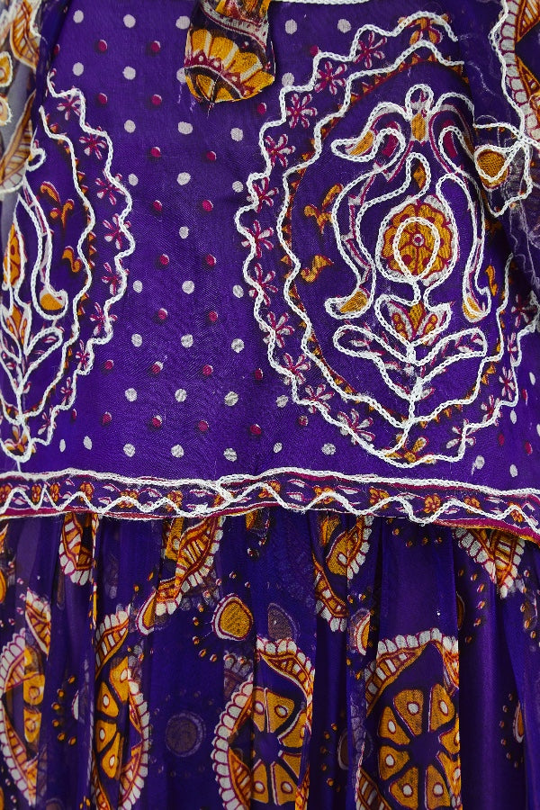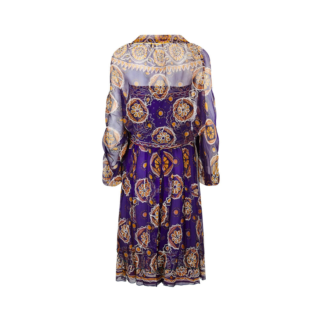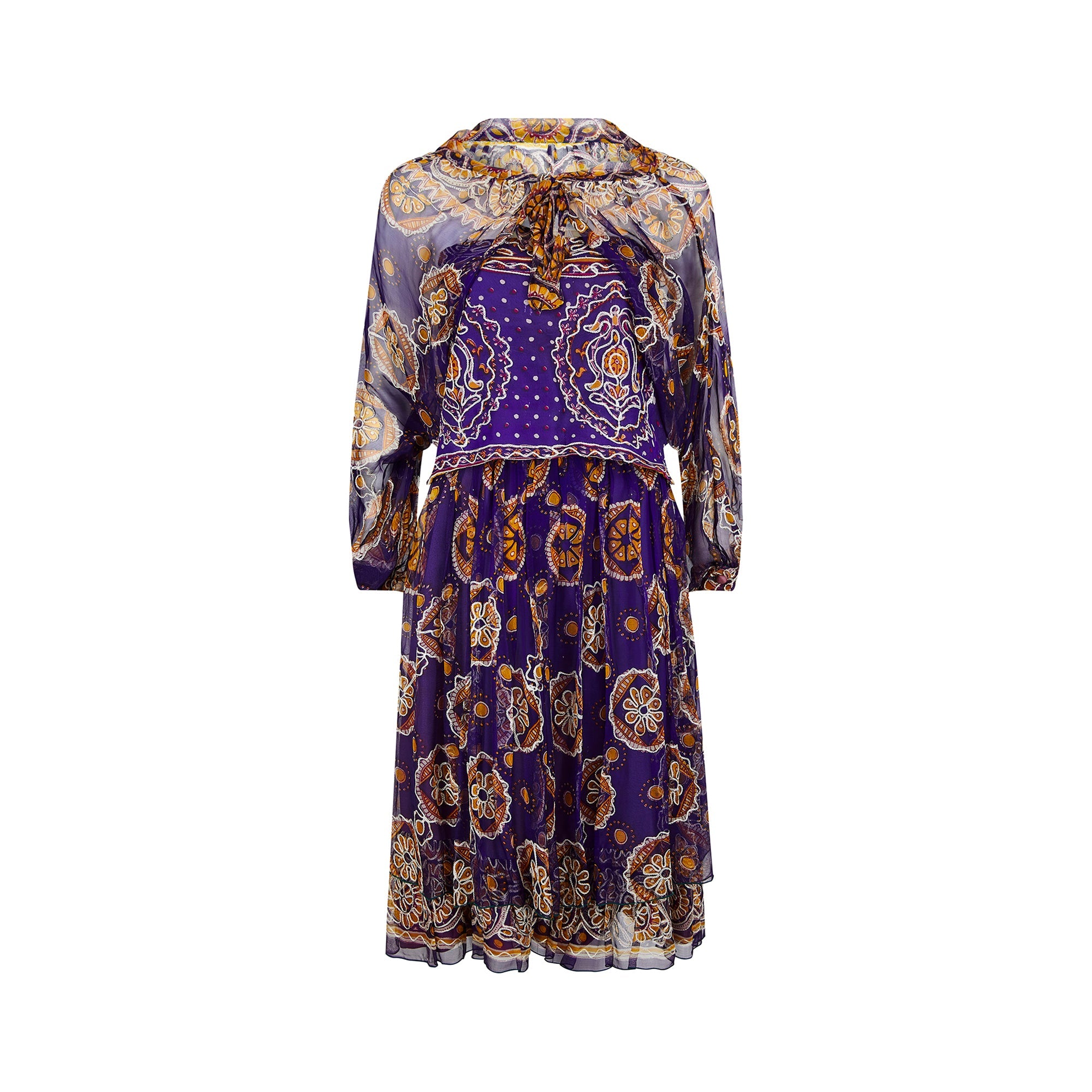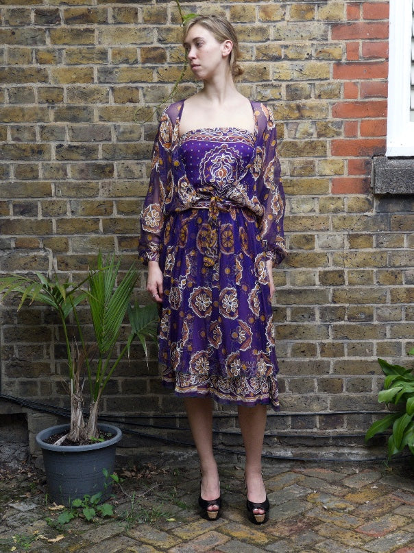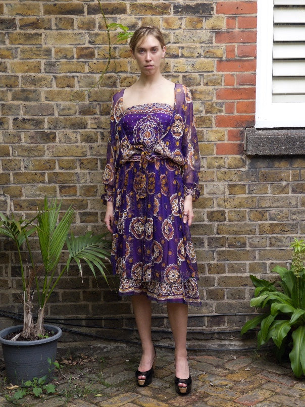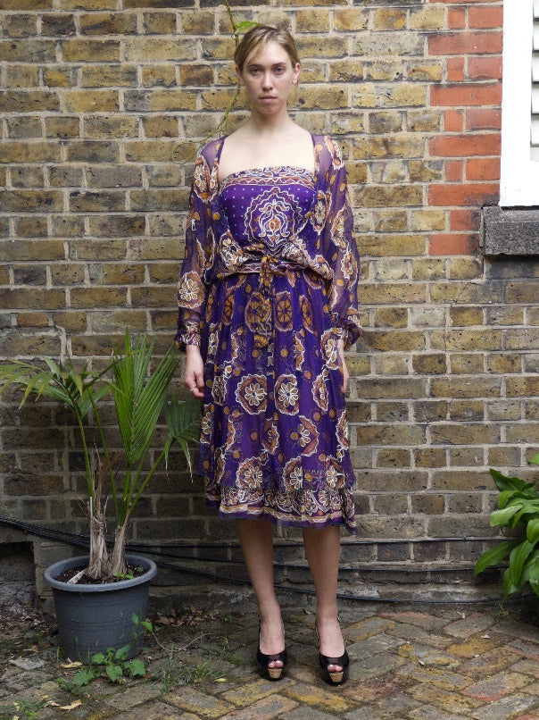 This decadent 1970s three piece ensemble is crafted from vivacious purple chiffon. The set is composed of a strapless crop-top, midi-skirt and sheer shirt. Printed with psychedelic florals in mustard-yellow, bright fuchsia then overlaid with white embroidery, this is an unusually detailed design. The fully lined top is tailored in a bandeau style with small slits on the bottom hem at each side. The swirling, full-skirt has a softly pleated waistband. It is high-waisted and lined in purple cloth and is fastened at the rear with a hidden zip and a single button. The overshirt is lightweight and floaty, with bell-shaped sleeves adding an ethereal feel to this look. It is secured loosely at the neck with a coordinating tie - adding a hint of glam-rock appeal.