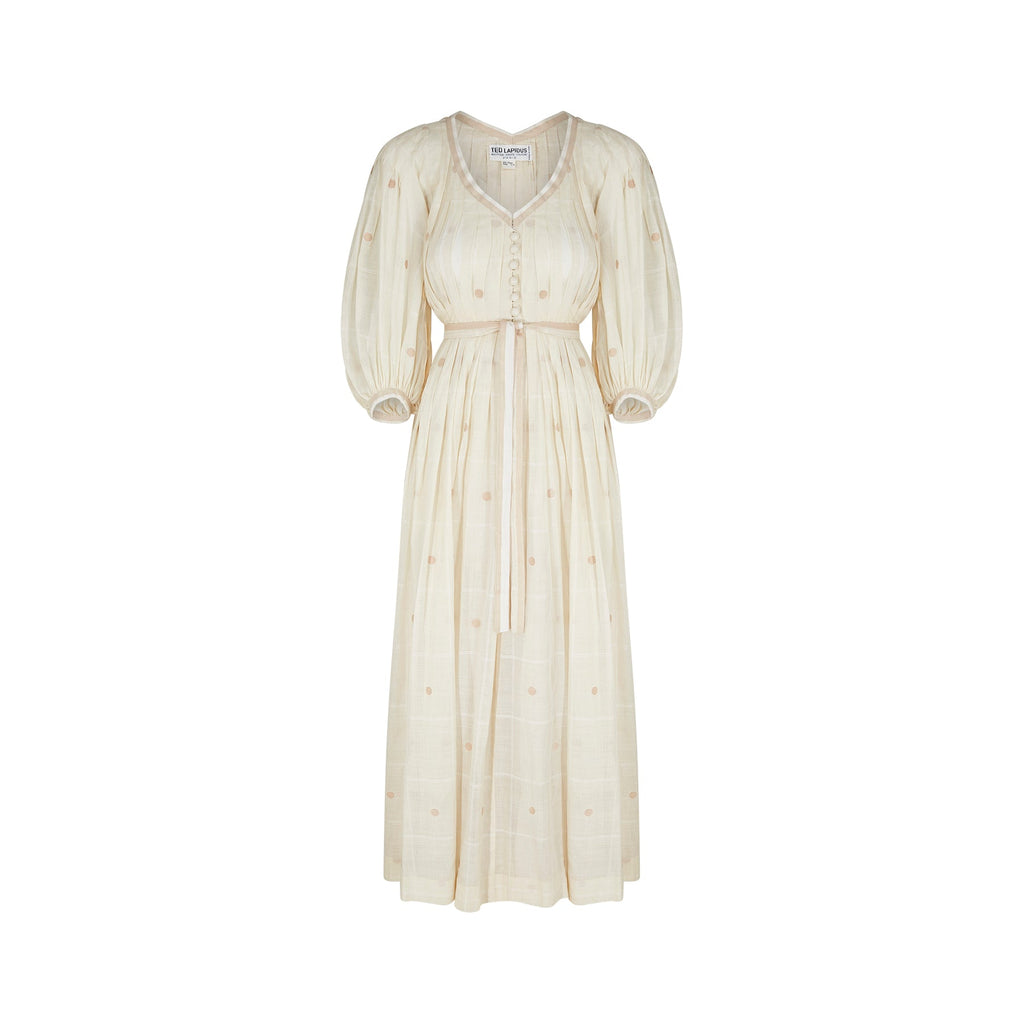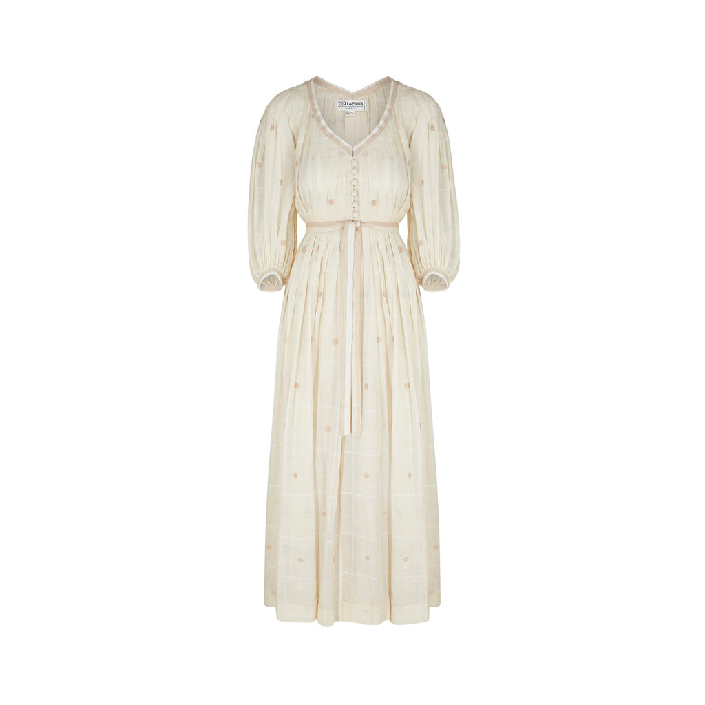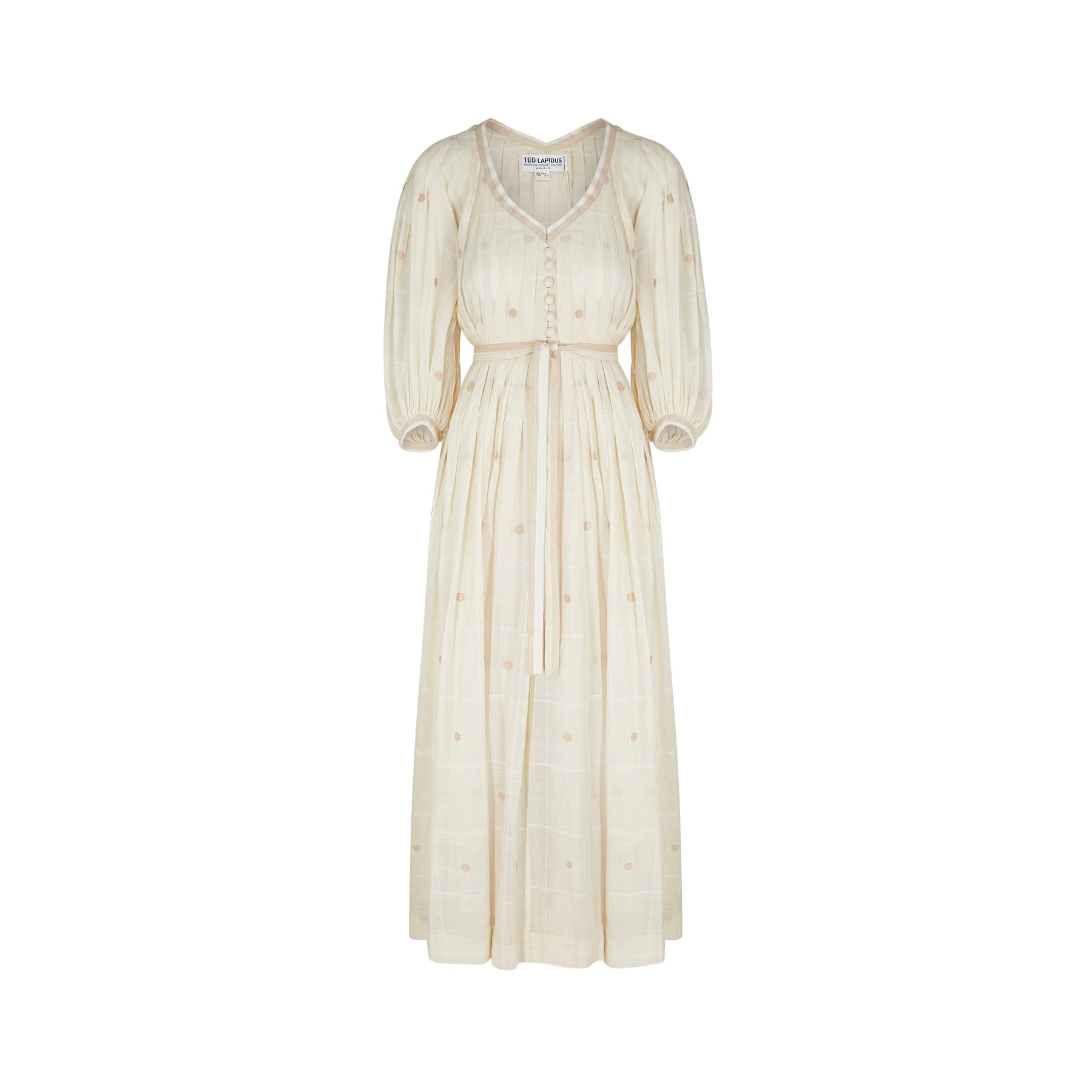 This 1970s dress is a phenomenal design piece from Ted Lapidus and from his flagship boutique line in Paris. It would have almost certainly been made by the same team as the haute couture collections and is in a wonderful cream checked muslin that features large embroidered Swiss dots. The dress is a v neck shirtwaister design with fabric covered buttons down to the upper-waist. The gathered skirt reaches to the floor. The dress features romantic, poet style, three-quarter length sleeves. To give greater volume to the piece, there is a cream muslin petticoat retained and original to this ensemble. This is not attached to the dress; therefore, the dress could be worn with or without to suit the wearer's taste. A ribbon belt which matches the V neck and arm trims is also included.