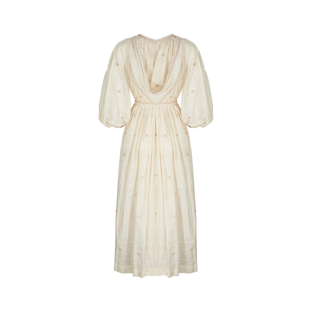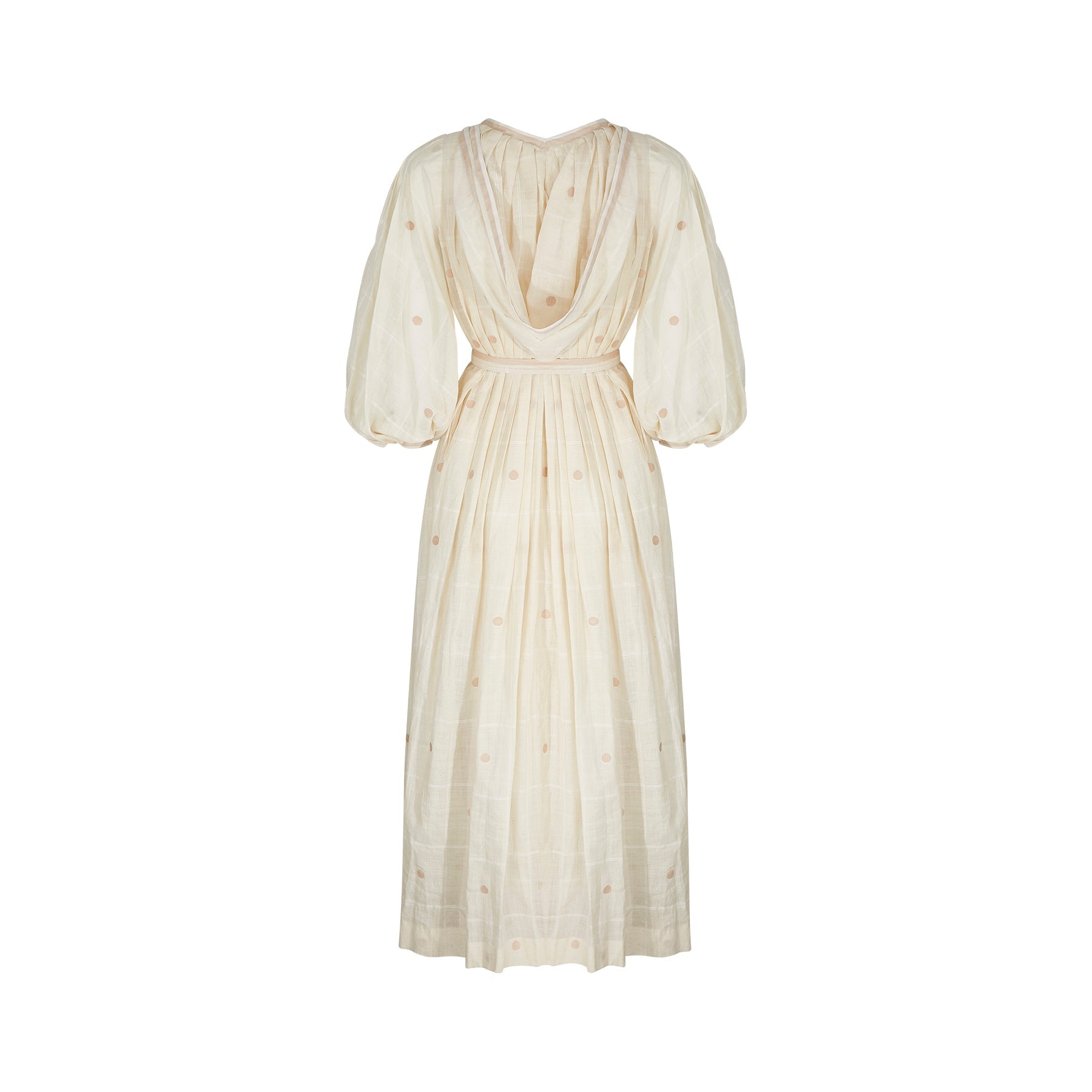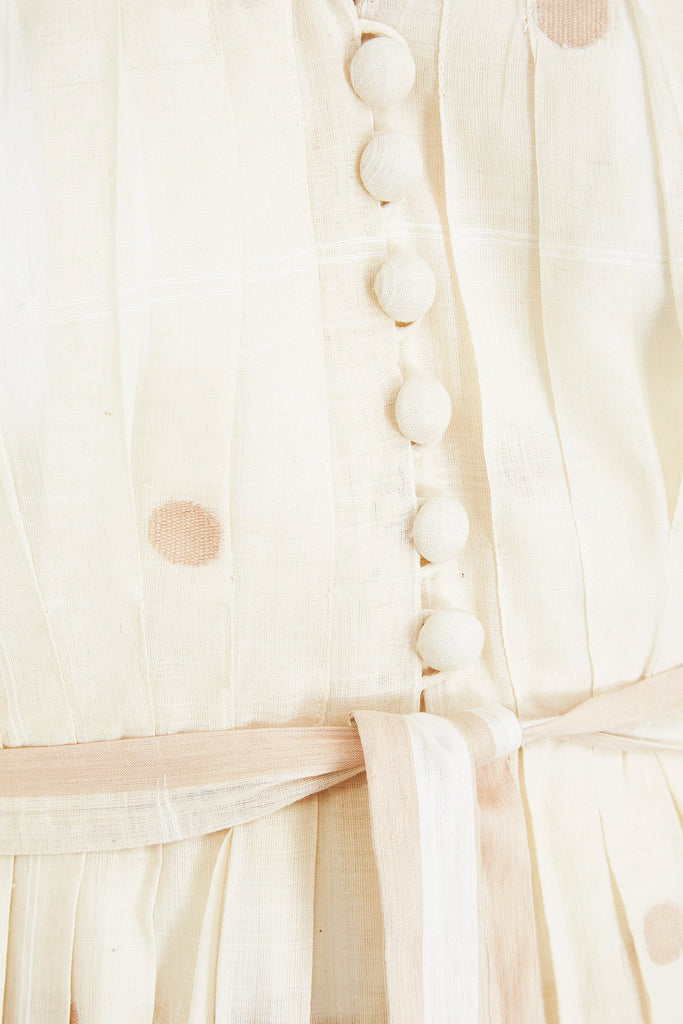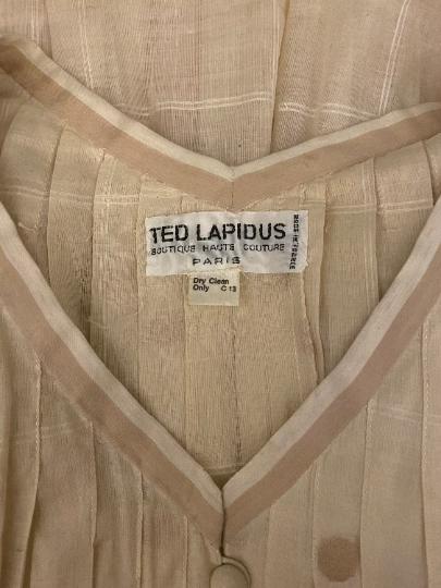 This 1970s dress is a phenomenal design piece from Ted Lapidus and from his flagship boutique line in Paris. It would have almost certainly been made by the same team as the haute couture collections and is in a wonderful cream checked muslin that features large embroidered Swiss dots. The dress is a v neck shirtwaister design with fabric covered buttons down to the upper-waist. The gathered skirt reaches to the floor. The dress features romantic, poet style, three-quarter length sleeves. To give greater volume to the piece, there is a cream muslin petticoat retained and original to this ensemble. This is not attached to the dress; therefore, the dress could be worn with or without to suit the wearer's taste. A ribbon belt which matches the V neck and arm trims is also included.