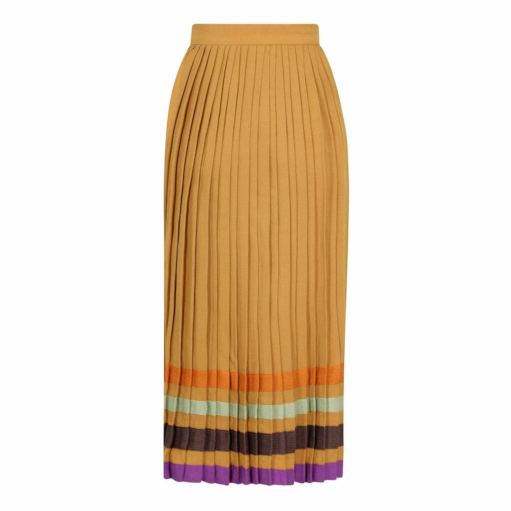 An extremely wearable late 1970s Bill Gibb mainline wool accordion pleat skirt. This piece is in a rich warm tone of ochre adorned with four horizontal bands that form the lower section of the skirt in an array of contrasting colours - orange, lime green, chocolate and purple. This skirt would have been part of a knitwear ensemble and possibly from the Beehive Collection. The designer revisited this design a number of times over his career and we have referenced this in one of our photographs with different fabric swatches.