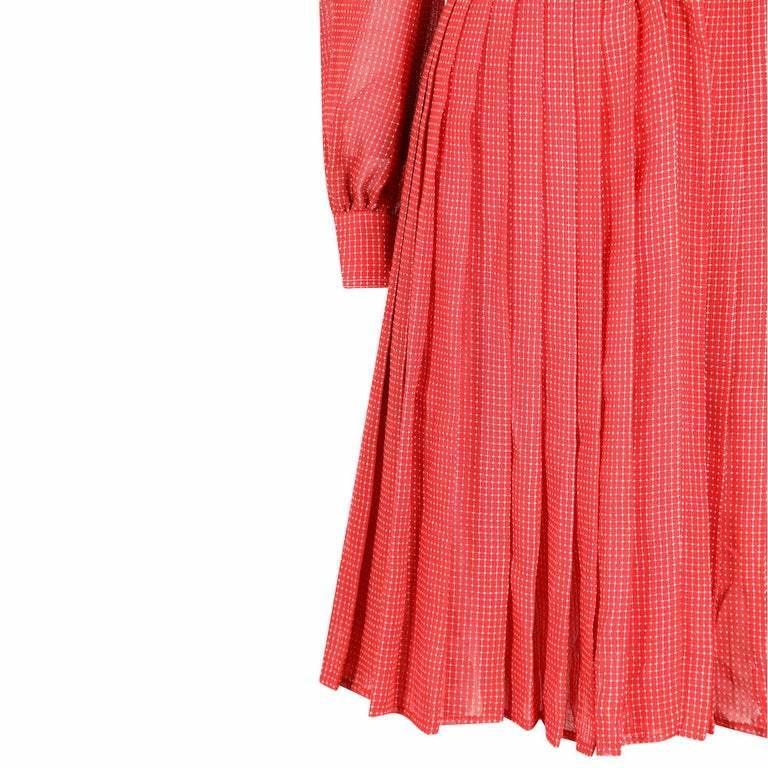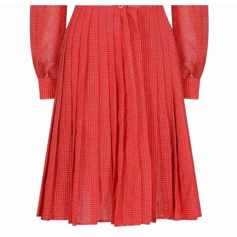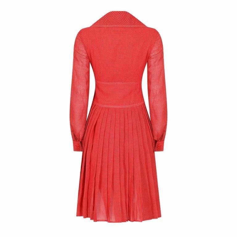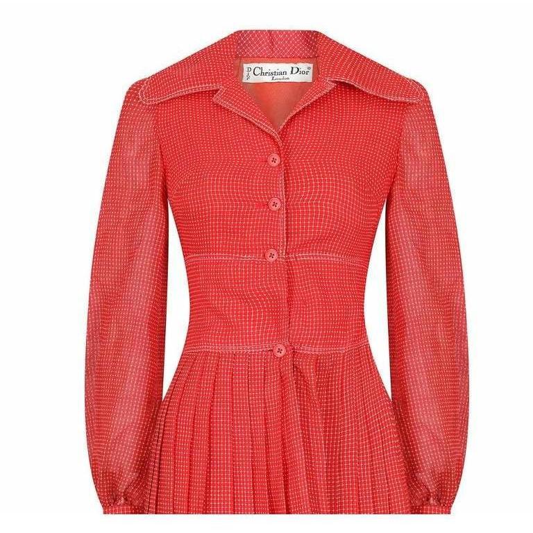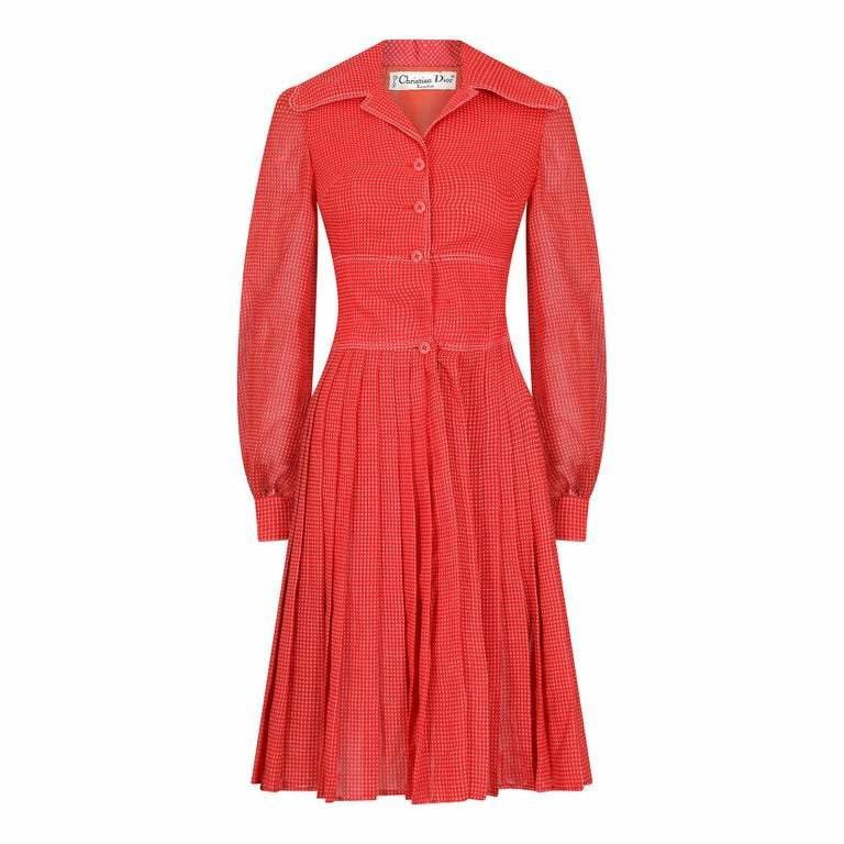 A great example of early 1970s daywear and by one of the most revered fashion houses of all time. The dress is a classic front-fastening shirtwaister design with wide lapel collar and three buttons leading down to the wide waistband. This middle portion of the dress does up with three hook and eyes while the skirt portion of the dress is comprised of neat box pleats and a slightly flared design. The last button is placed at the bottom of the waistband. The sleeves are typical of the era - voluminous with a neat buttoned cuff. The arms are not lined which gives just the faintest hint of skin underneath. The dress is lined in a quality acetate fabric while the buttons are plastic. The waistband is backed with a thick cream grosgrain fabric. Below the waistband the dress has a further 4 popper fastenings to allow full access.