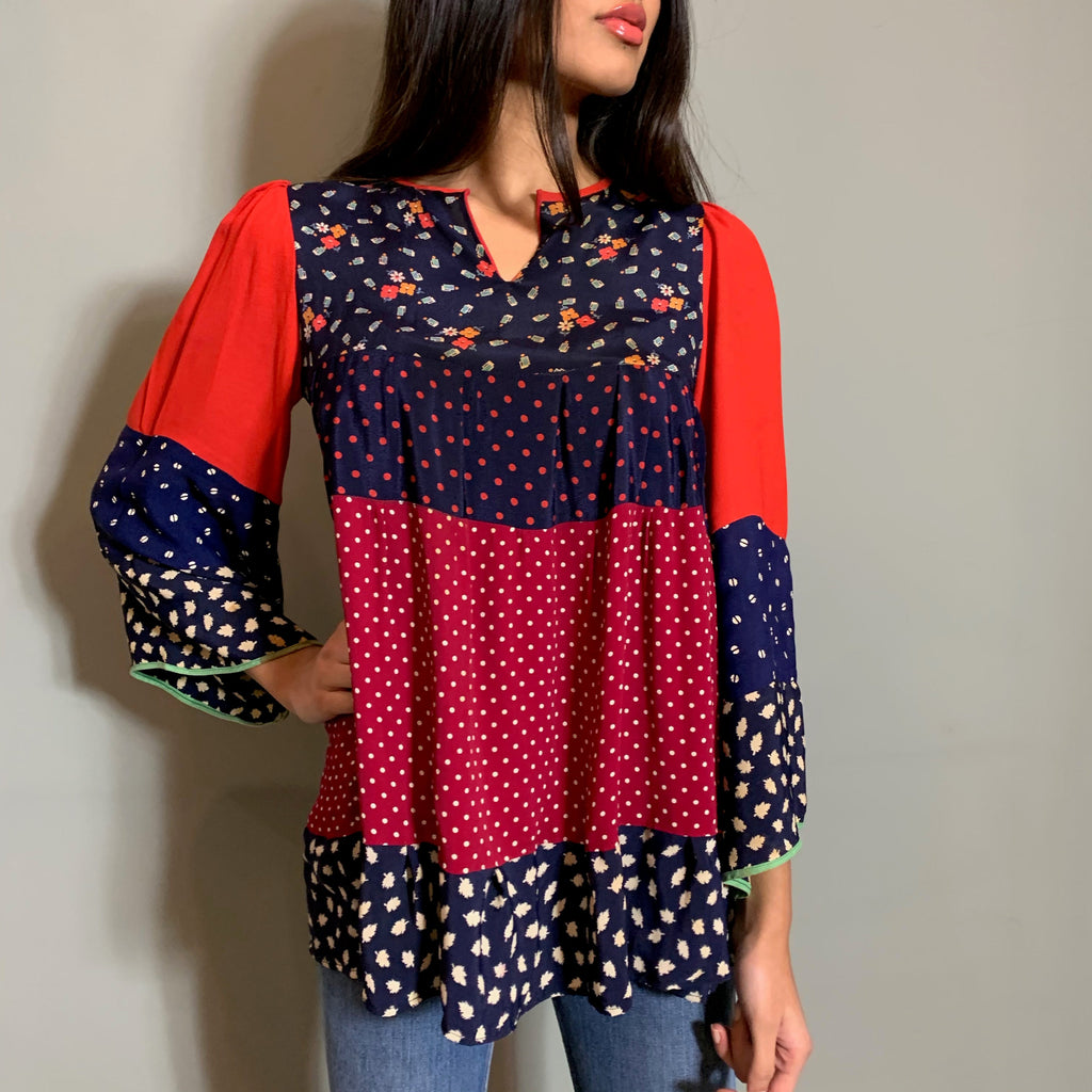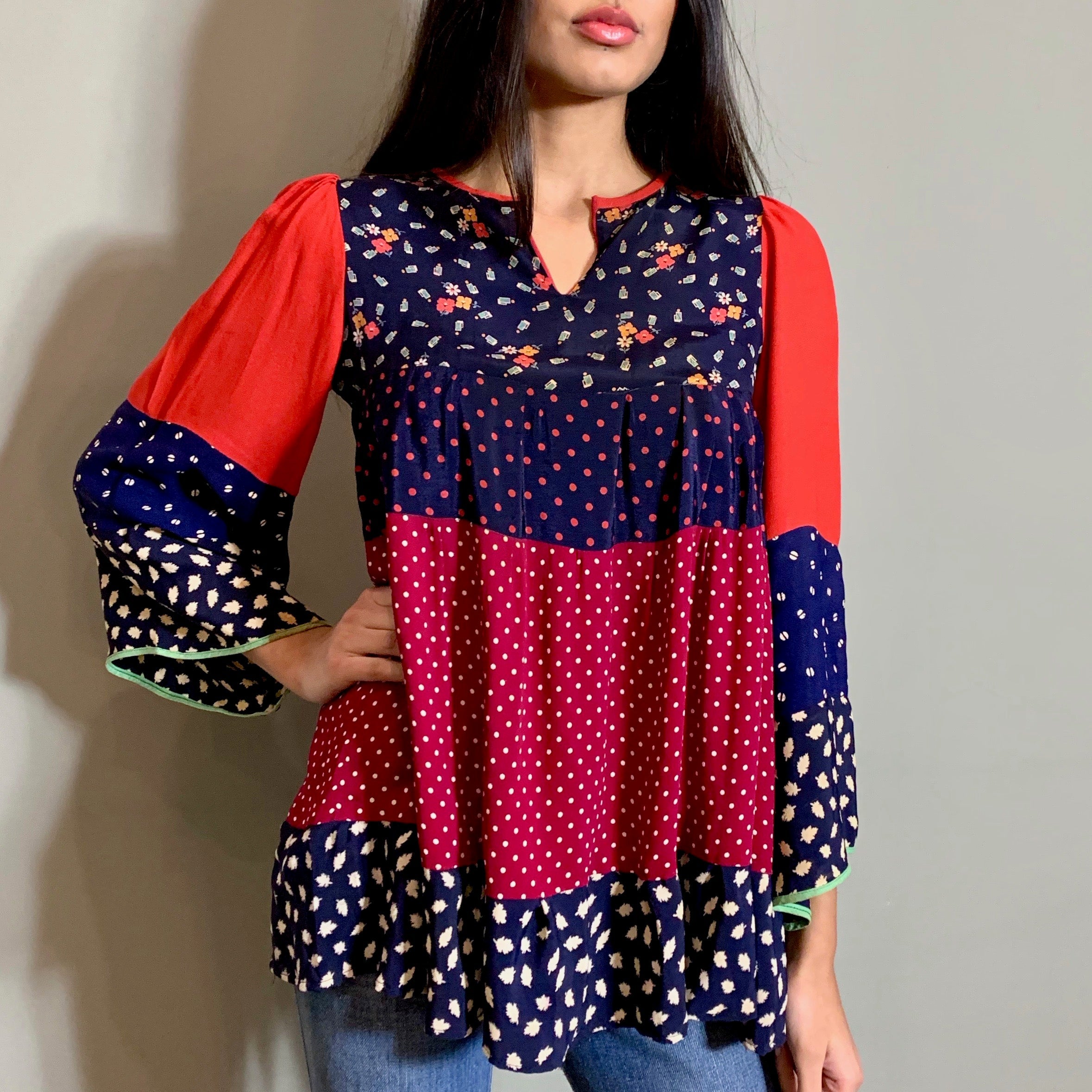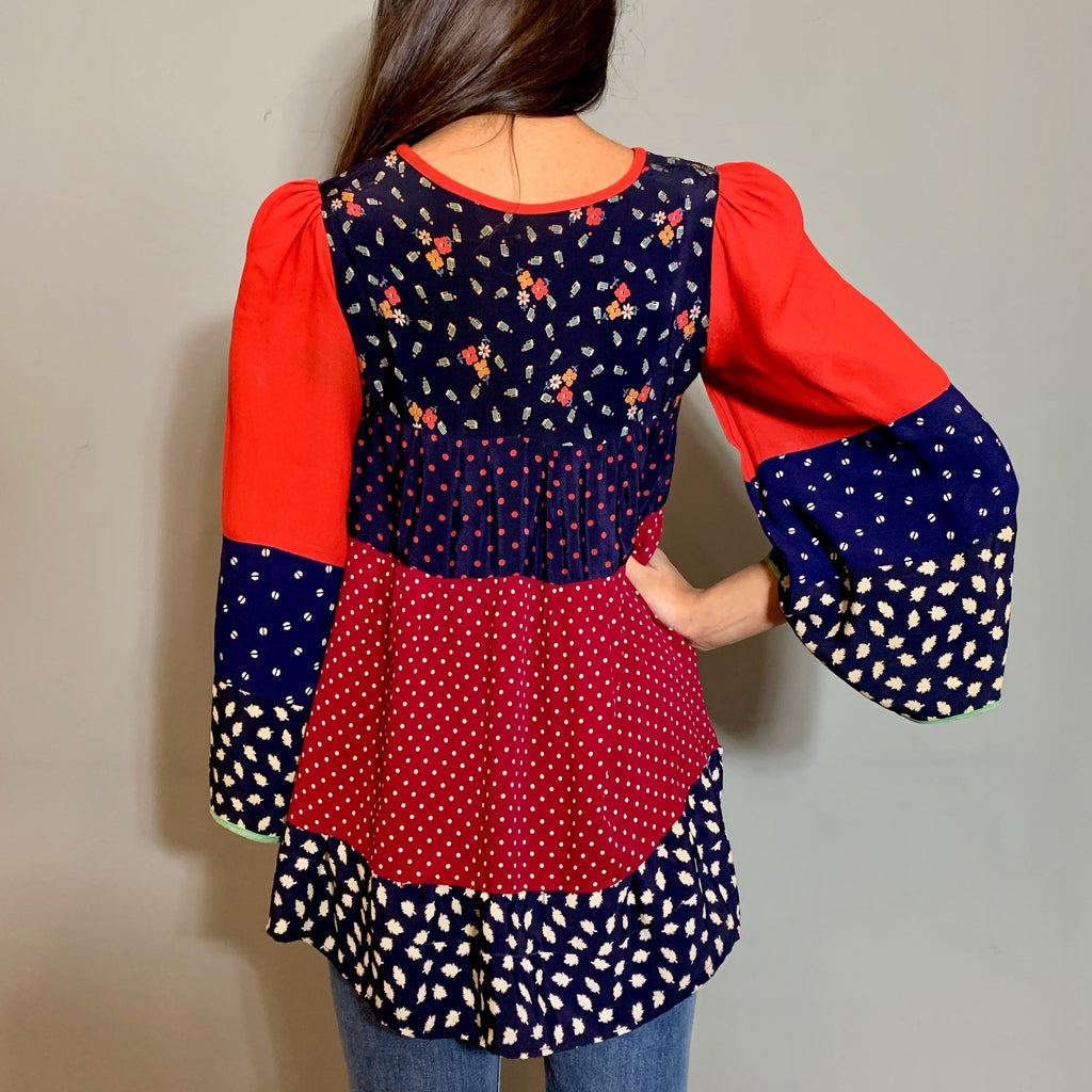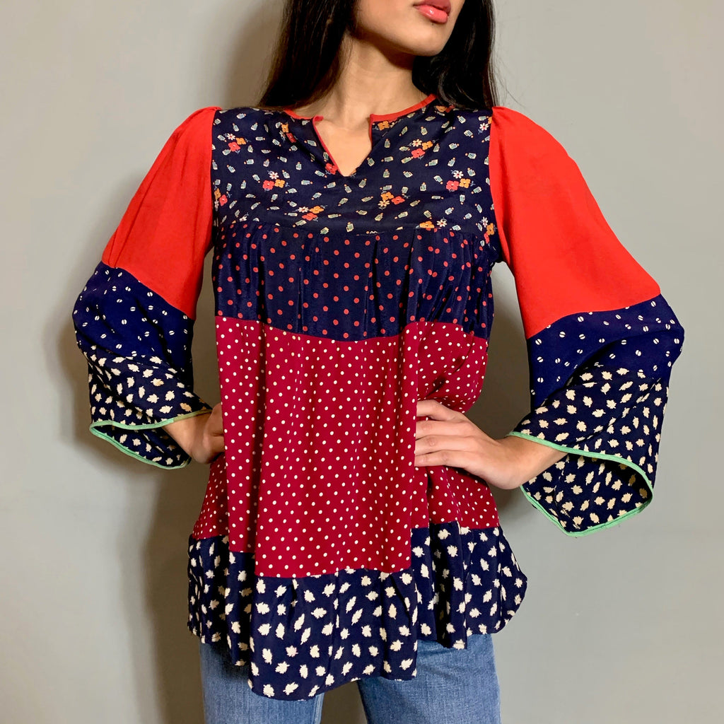 The perfect red and 70s mixed print hippie top. Pair it with all denim and even looks fab belted! Has a loose fit and flared sleeves. The prints are silk and crepe. A perfect  vintage blouse.