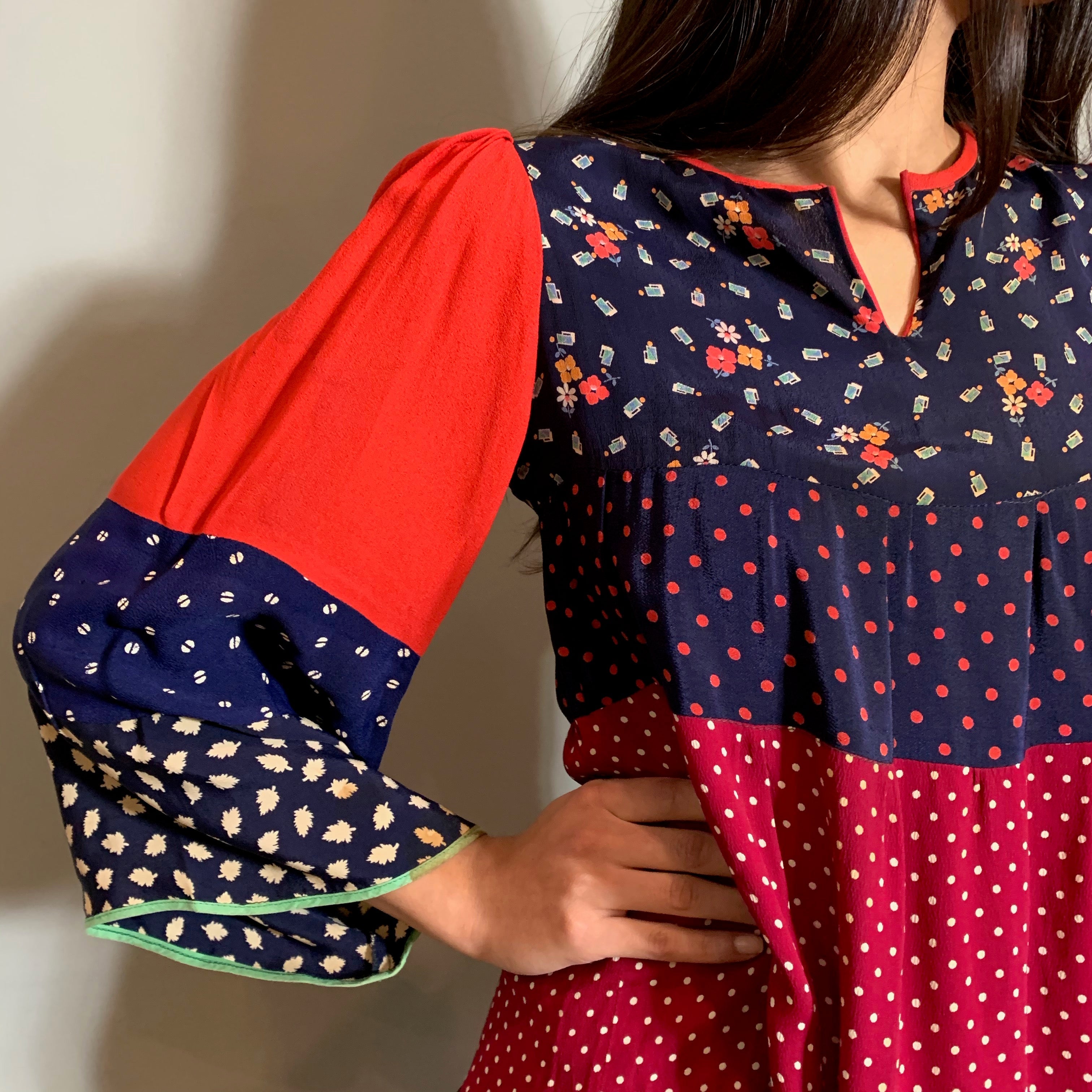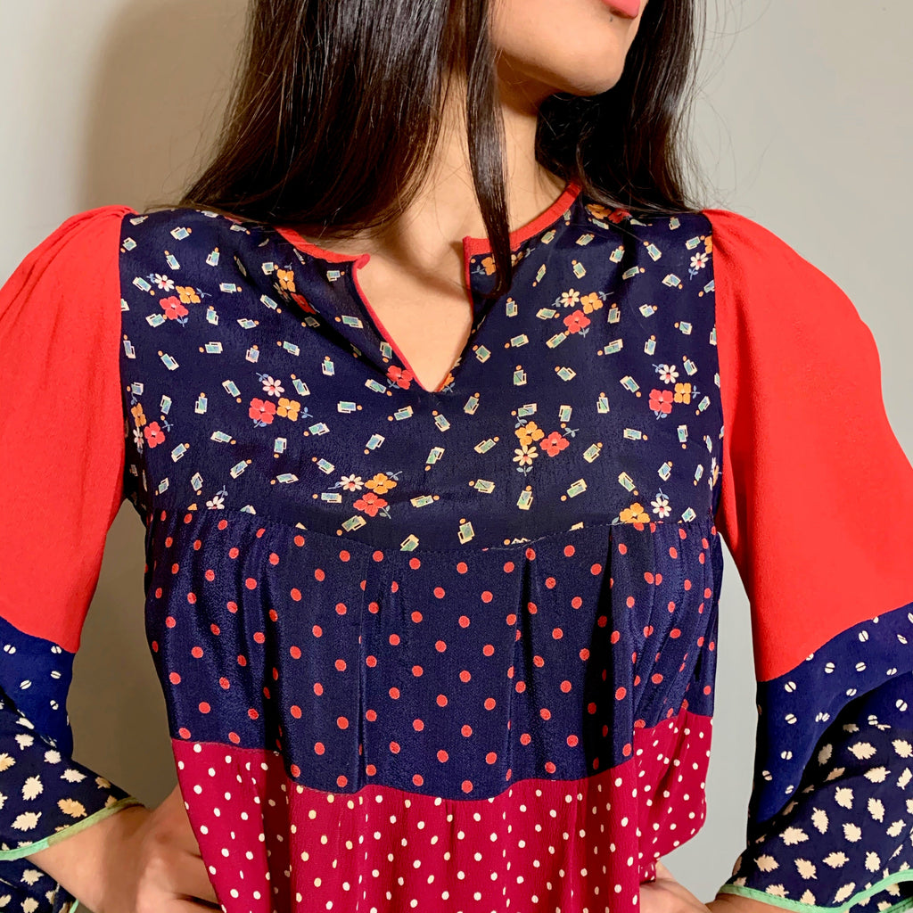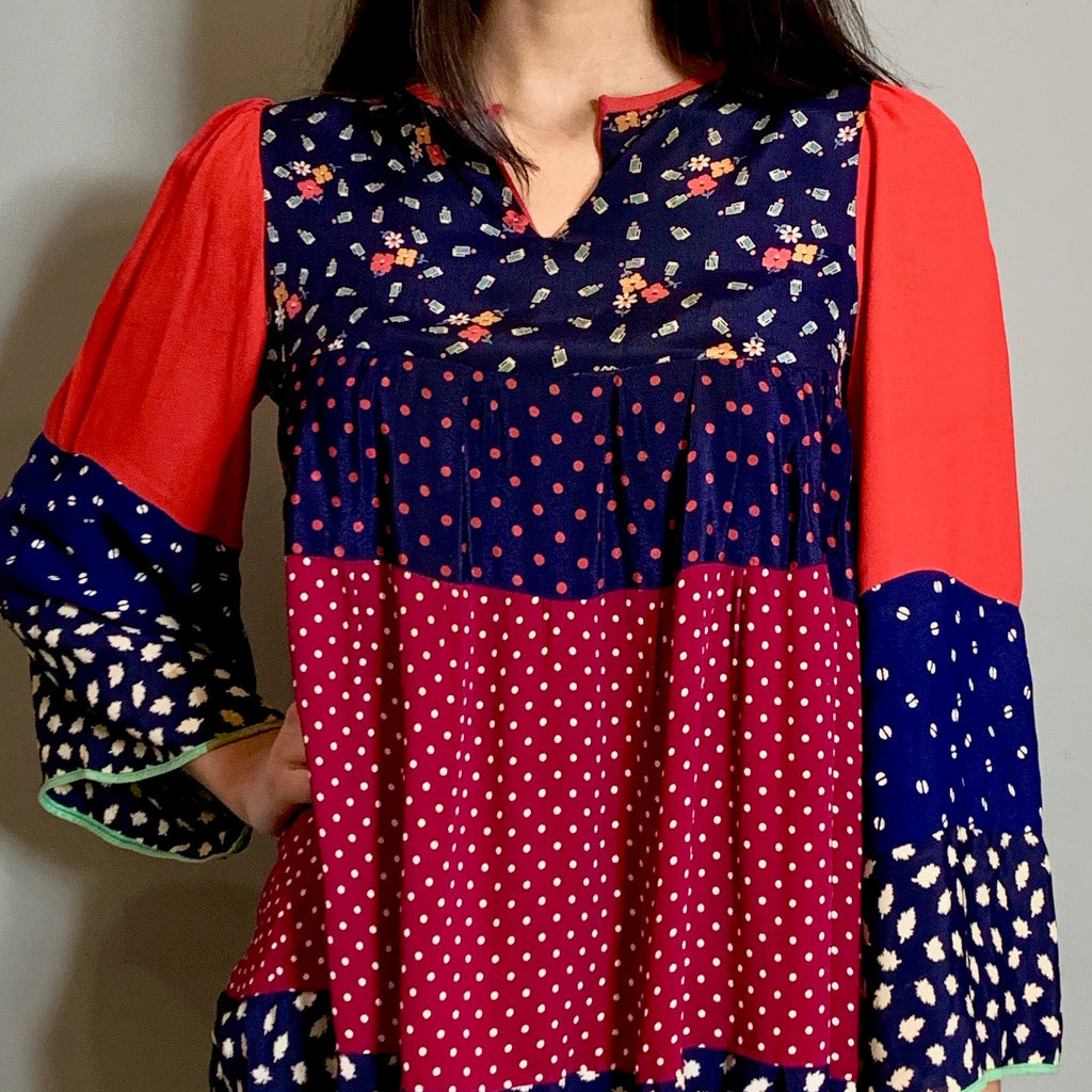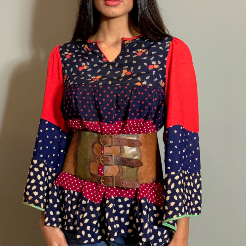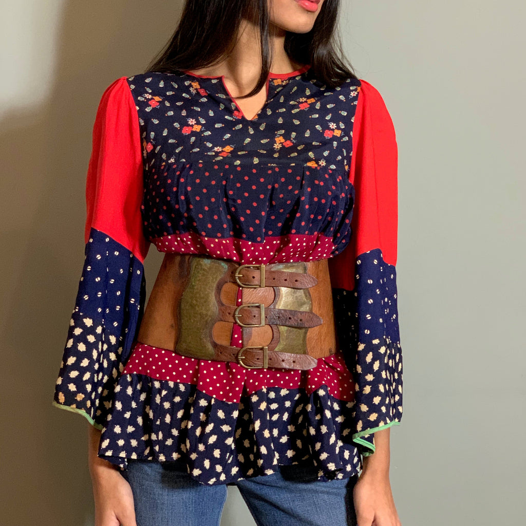 The perfect red and 70s mixed print hippie top. Pair it with all denim and even looks fab belted! Has a loose fit and flared sleeves. The prints are silk and crepe. A perfect  vintage blouse.