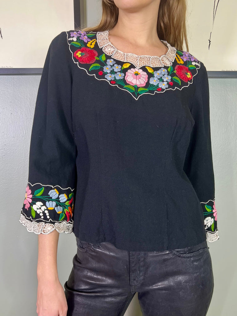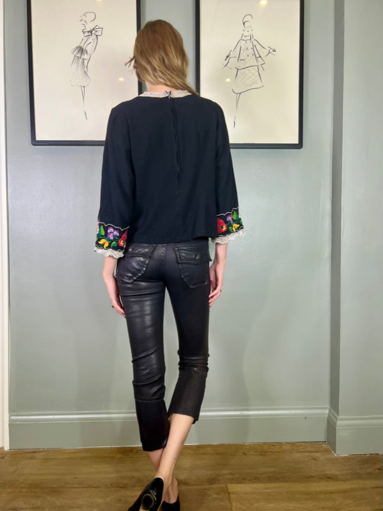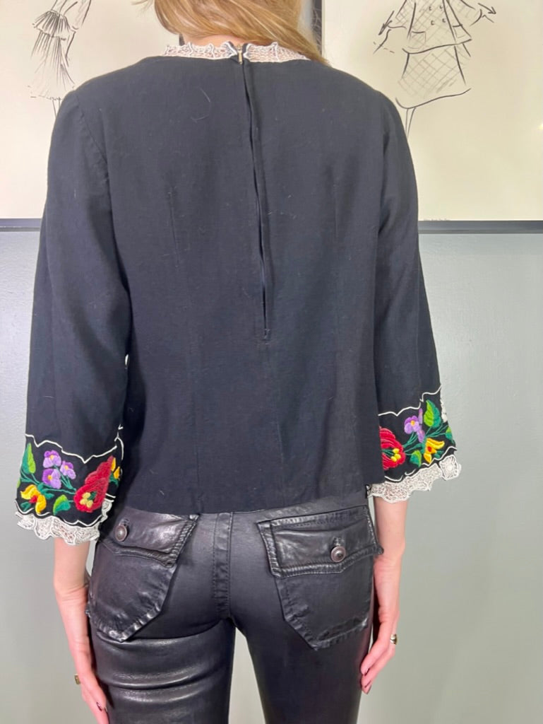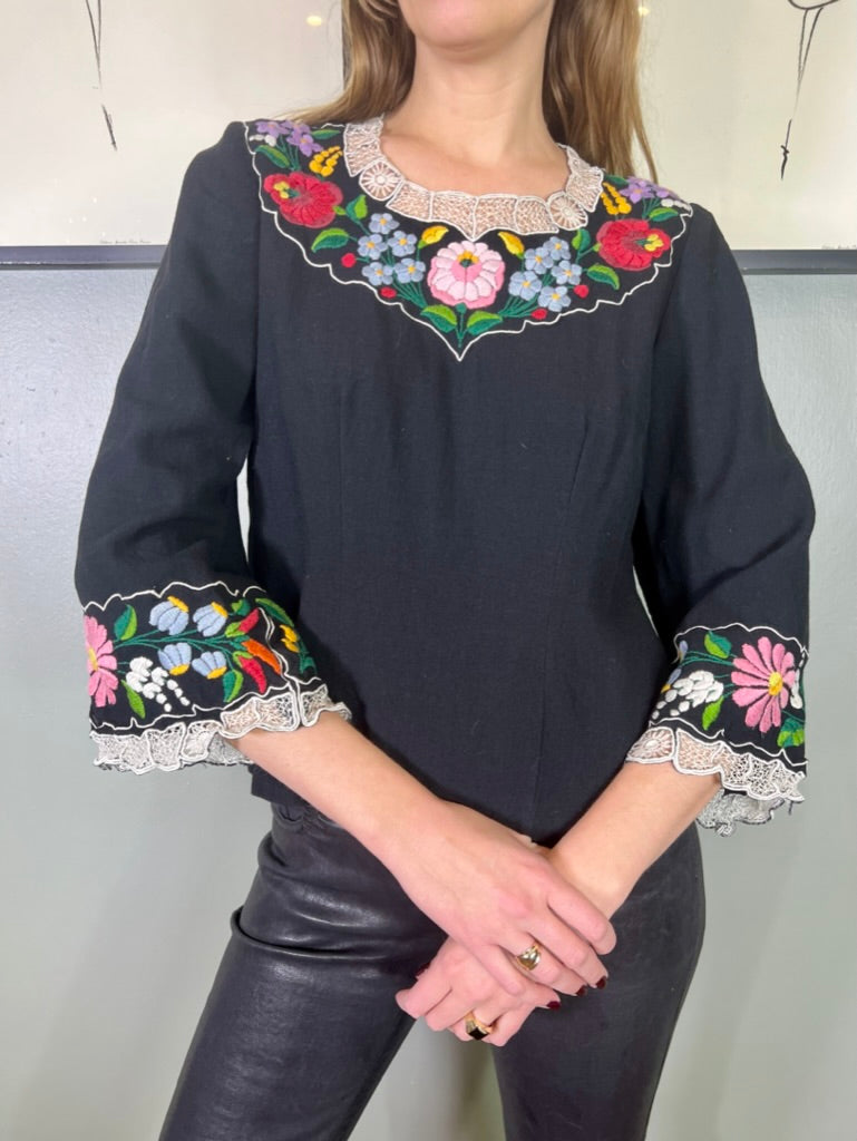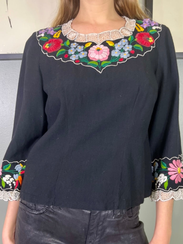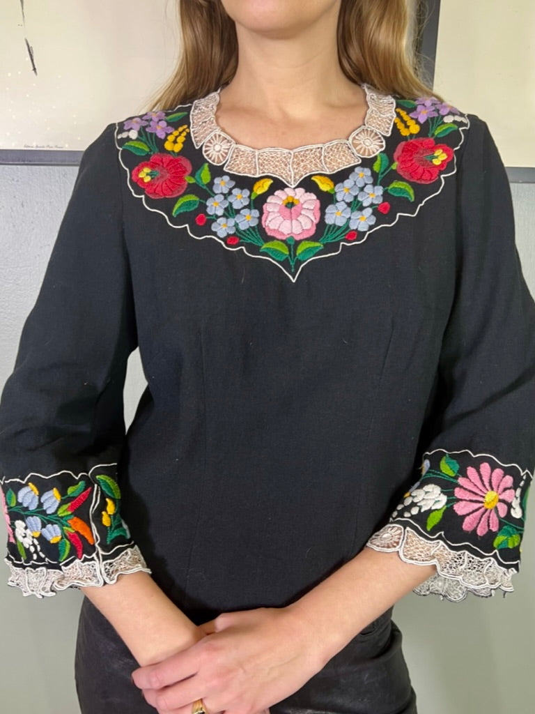 Easy to wear and super useful vintage blouse made from black cotton. Has a round neck with pretty floral embroidery around neckline and arm cuffs. Has a back zip and slightly tailored on the waist.