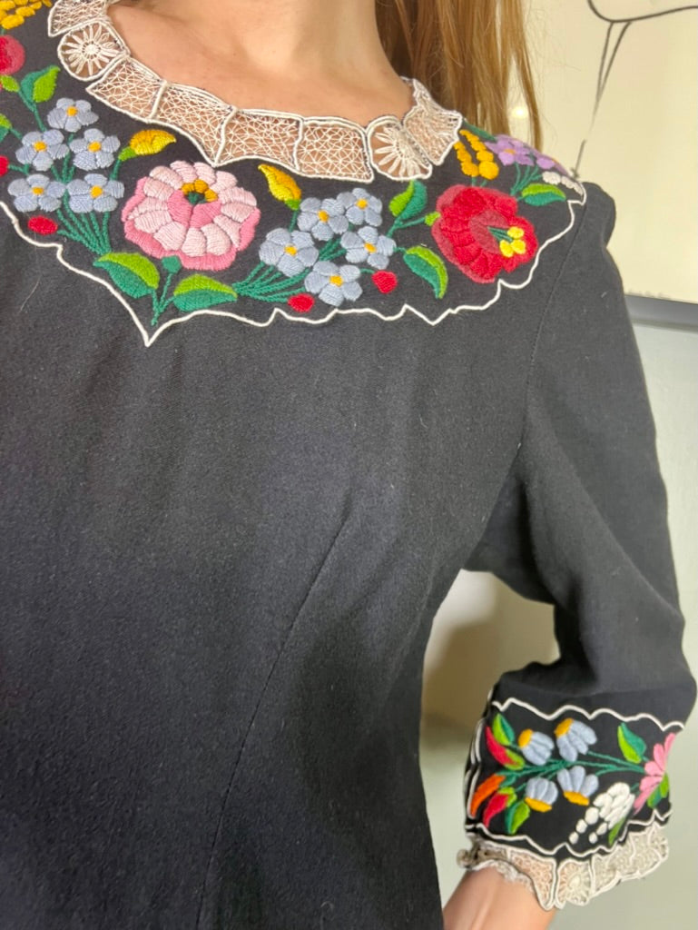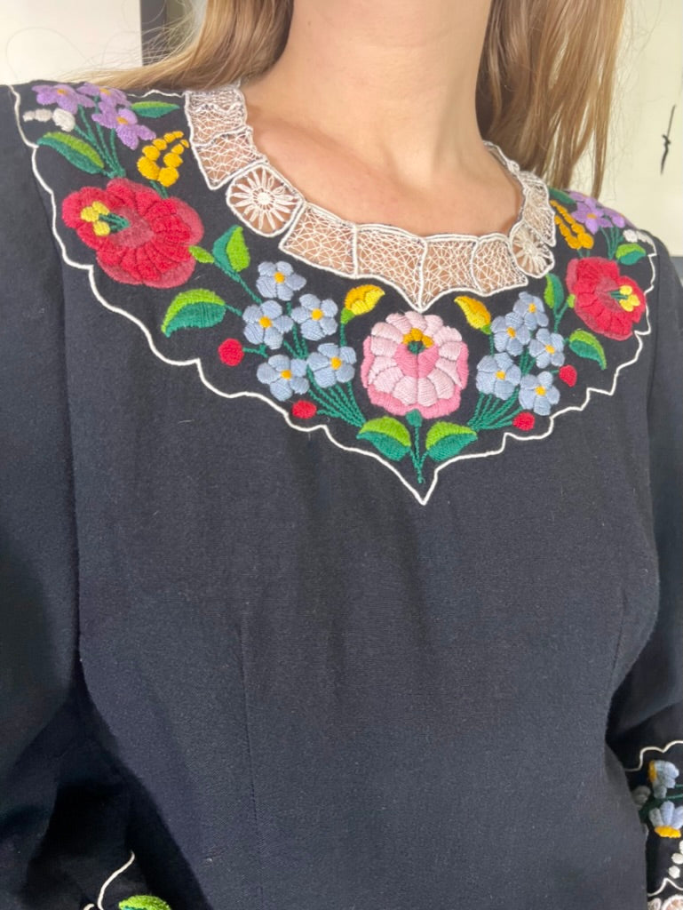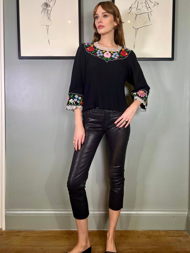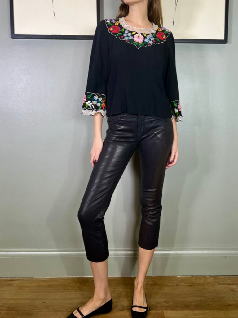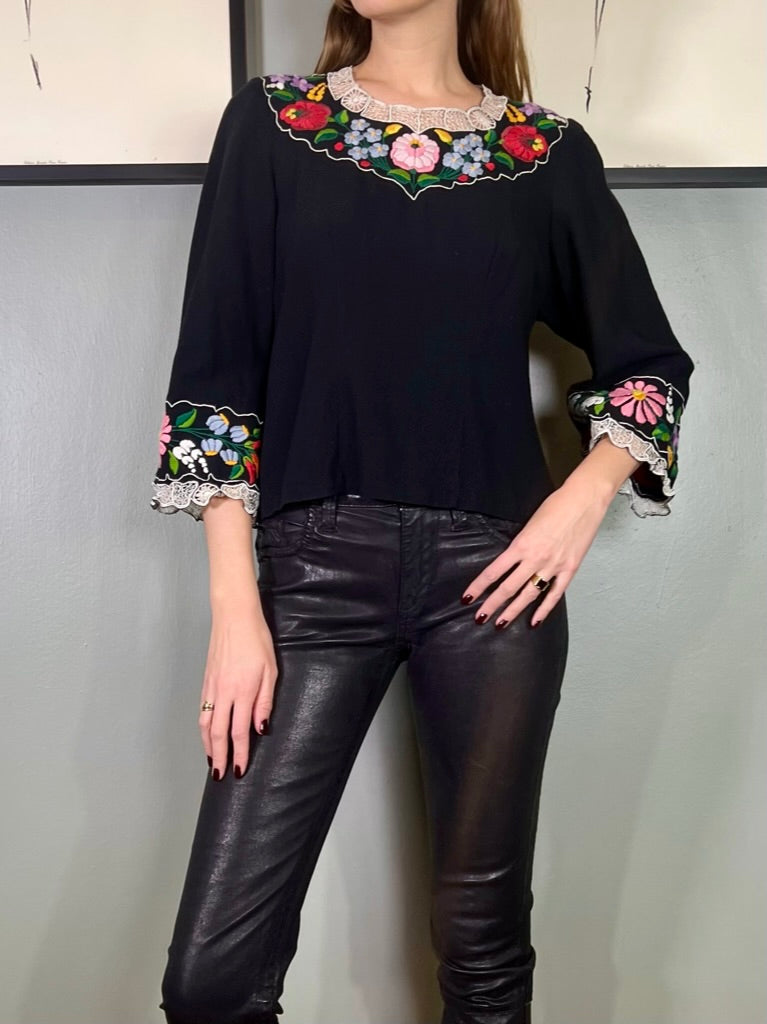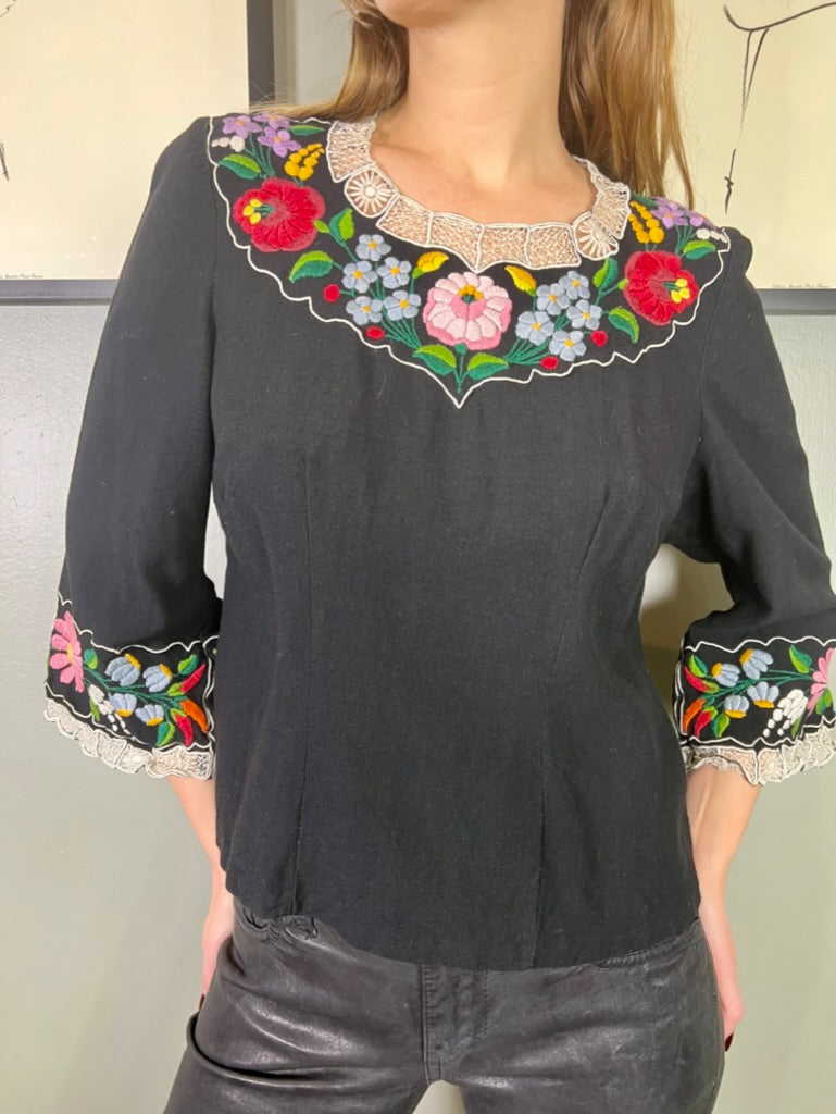 Easy to wear and super useful vintage blouse made from black cotton. Has a round neck with pretty floral embroidery around neckline and arm cuffs. Has a back zip and slightly tailored on the waist.