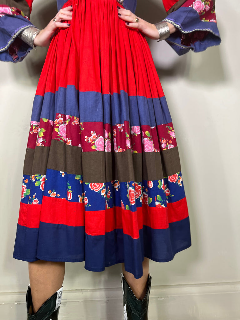 Vibrant and folky, 70s cotton Afghani dress. Has a side zip, a scoop neckline, no waistband and a gathered waist. Long wide sleeves and calf length. The colours are vibrant and the florals uplifting.