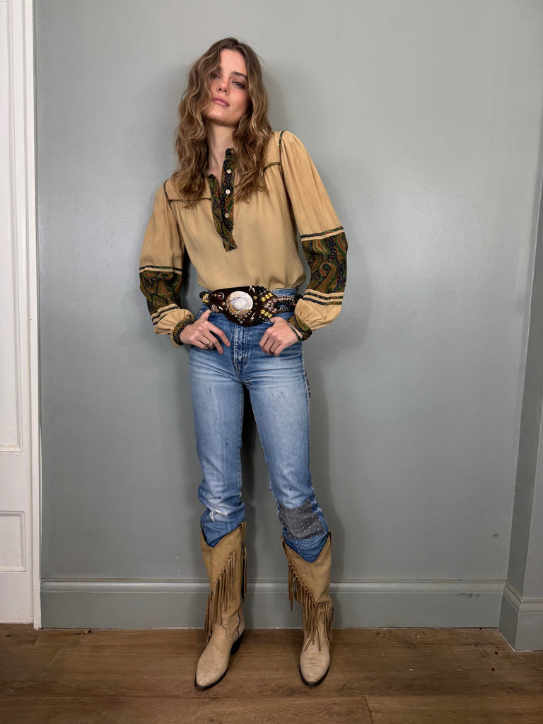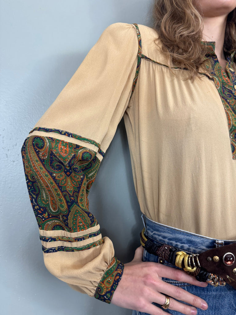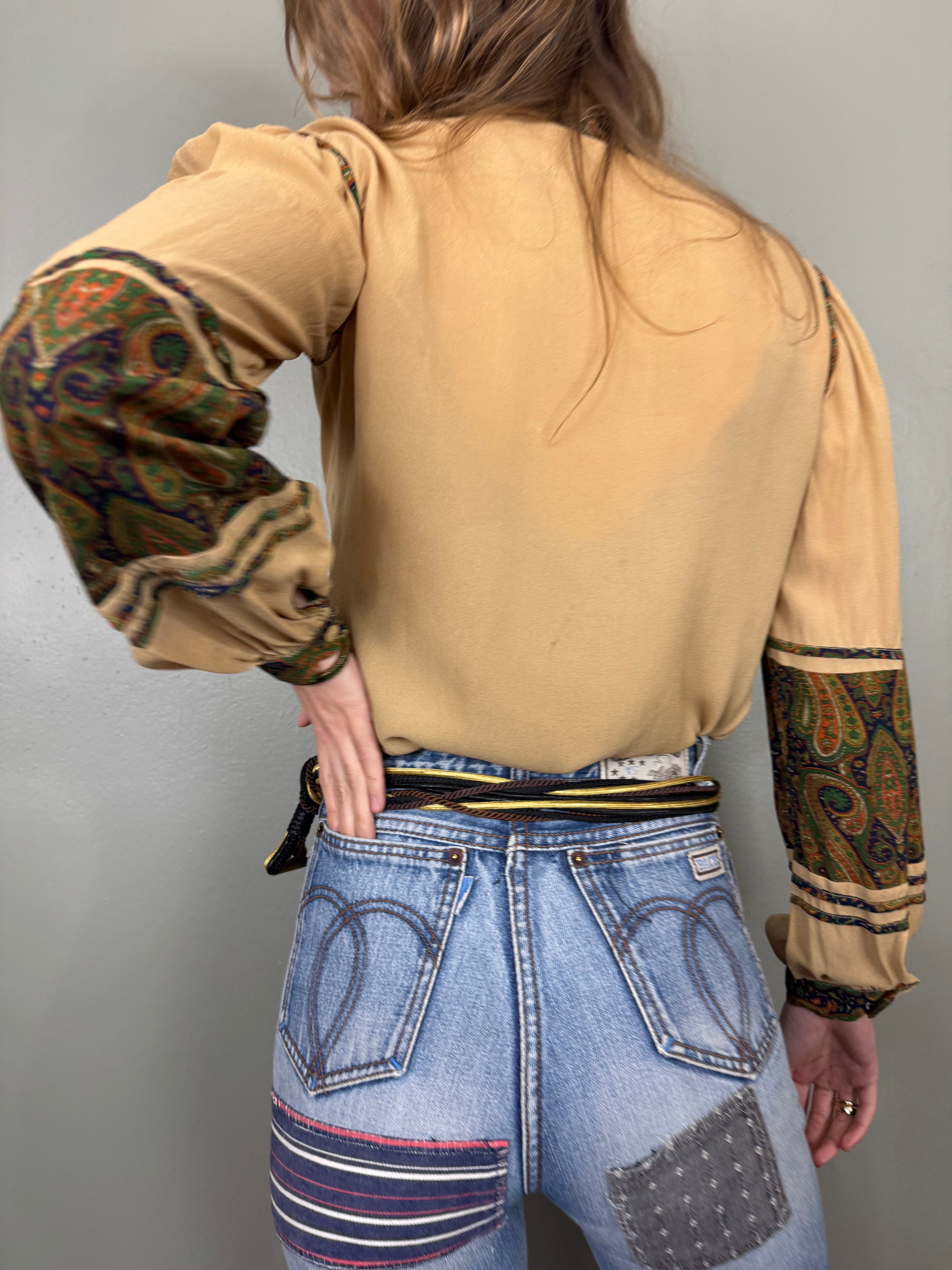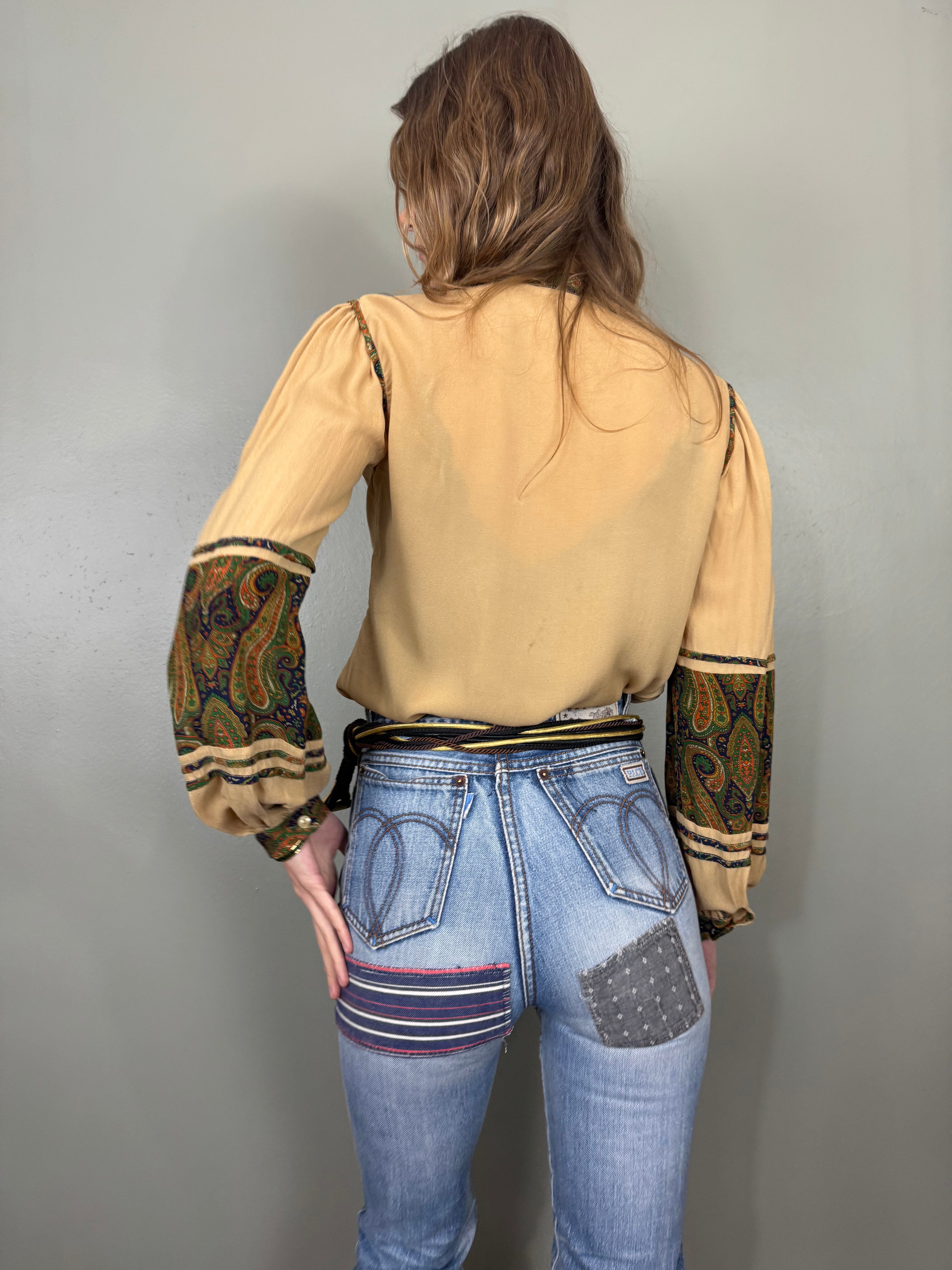 This stunning original 70s piece features front buttons, long sleeves, and a straight cut for a timeless and versatile look. With paisley accents on the collar and sleeves, this blouse exudes elegance and sophistication. Upgrade your denim game with this timeless blouse.