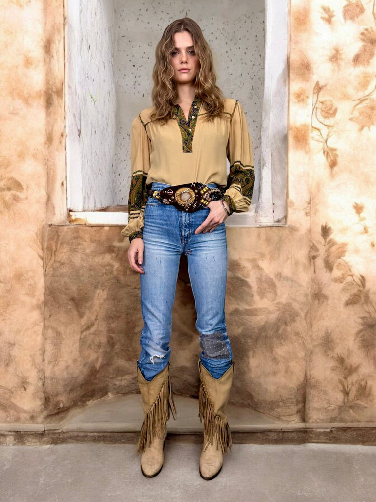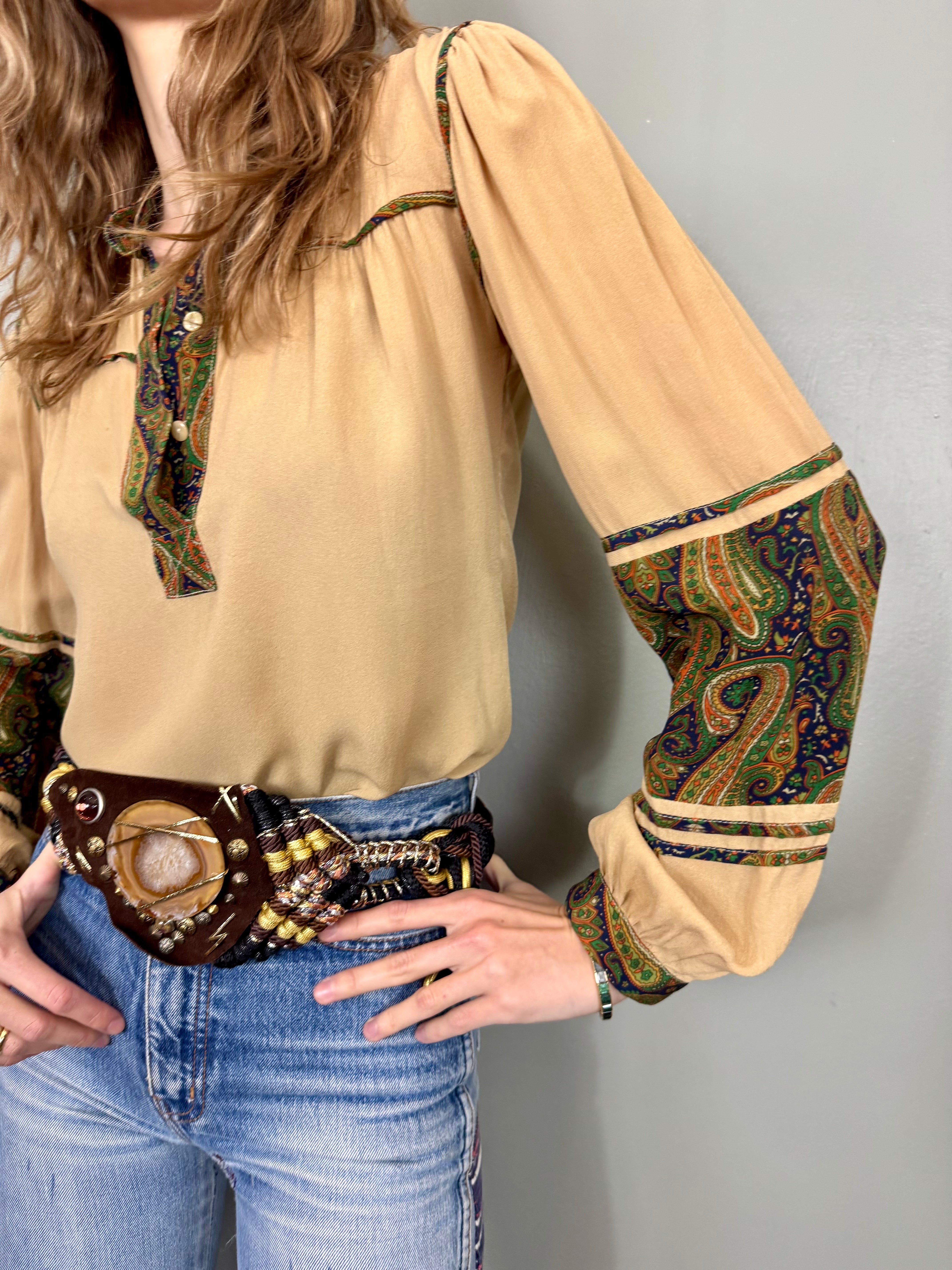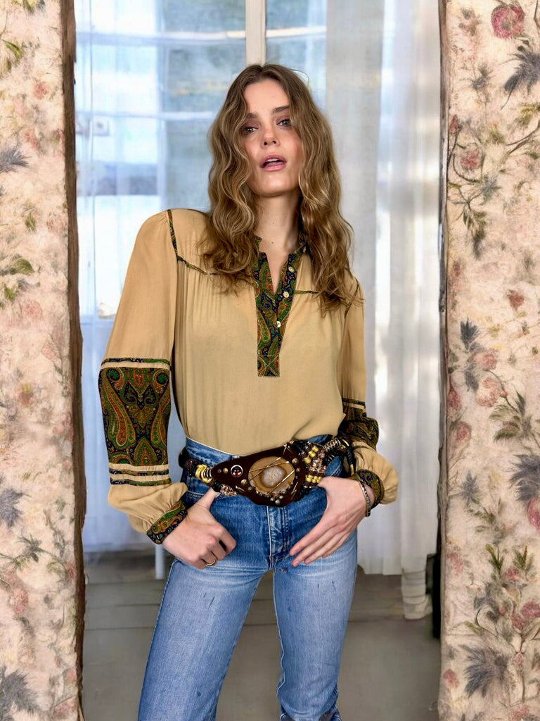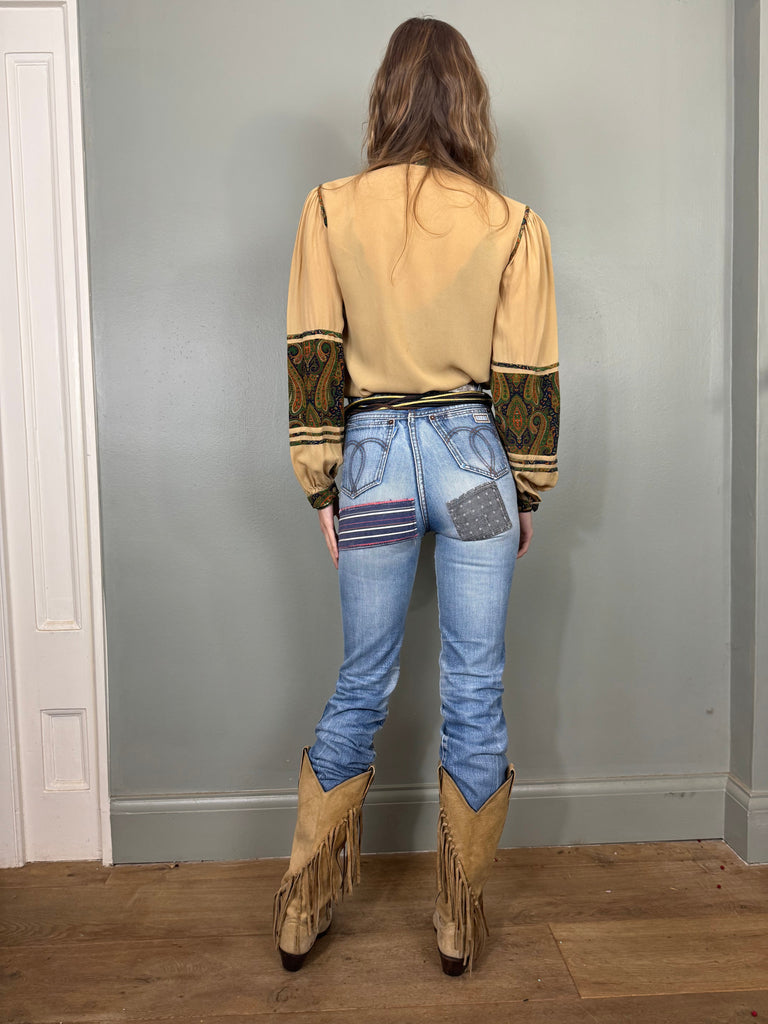 This stunning original 70s piece features front buttons, long sleeves, and a straight cut for a timeless and versatile look. With paisley accents on the collar and sleeves, this blouse exudes elegance and sophistication. Upgrade your denim game with this timeless blouse.