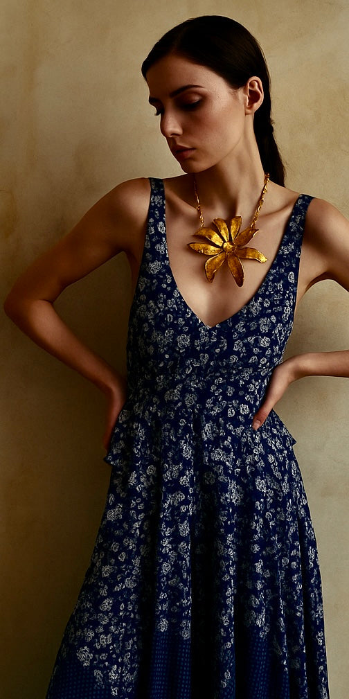 Introducing a stunning one of a kind 1970s large statement necklace by Jasmir. This gold plated piece features a beautifully crafted large flower on a chain. With a secure back hook and a lightweight design, this necklace is a must-have for making a fabulous statement. Elevate your style with this unique and timeless accessory.