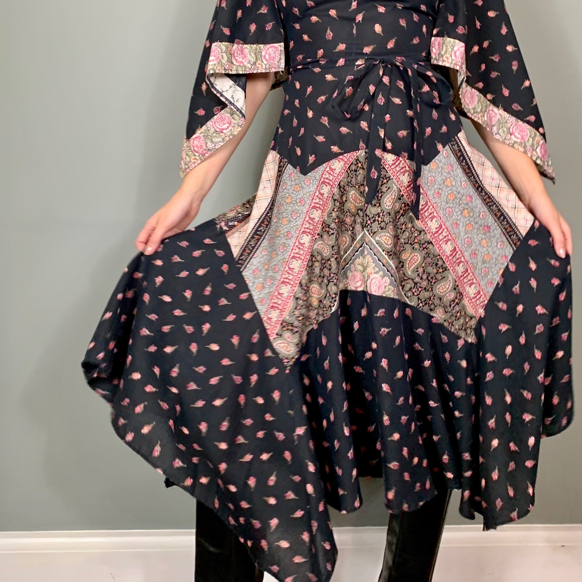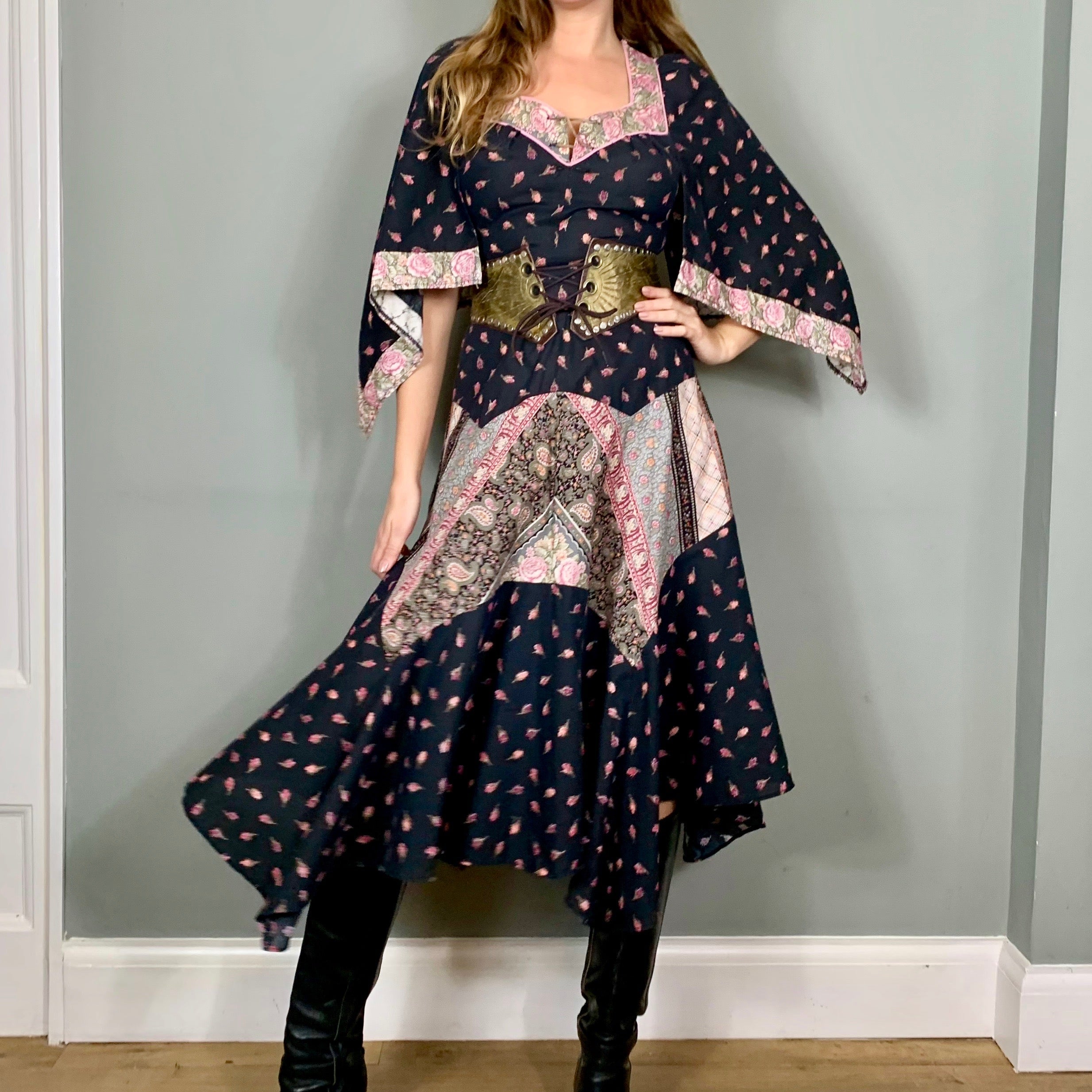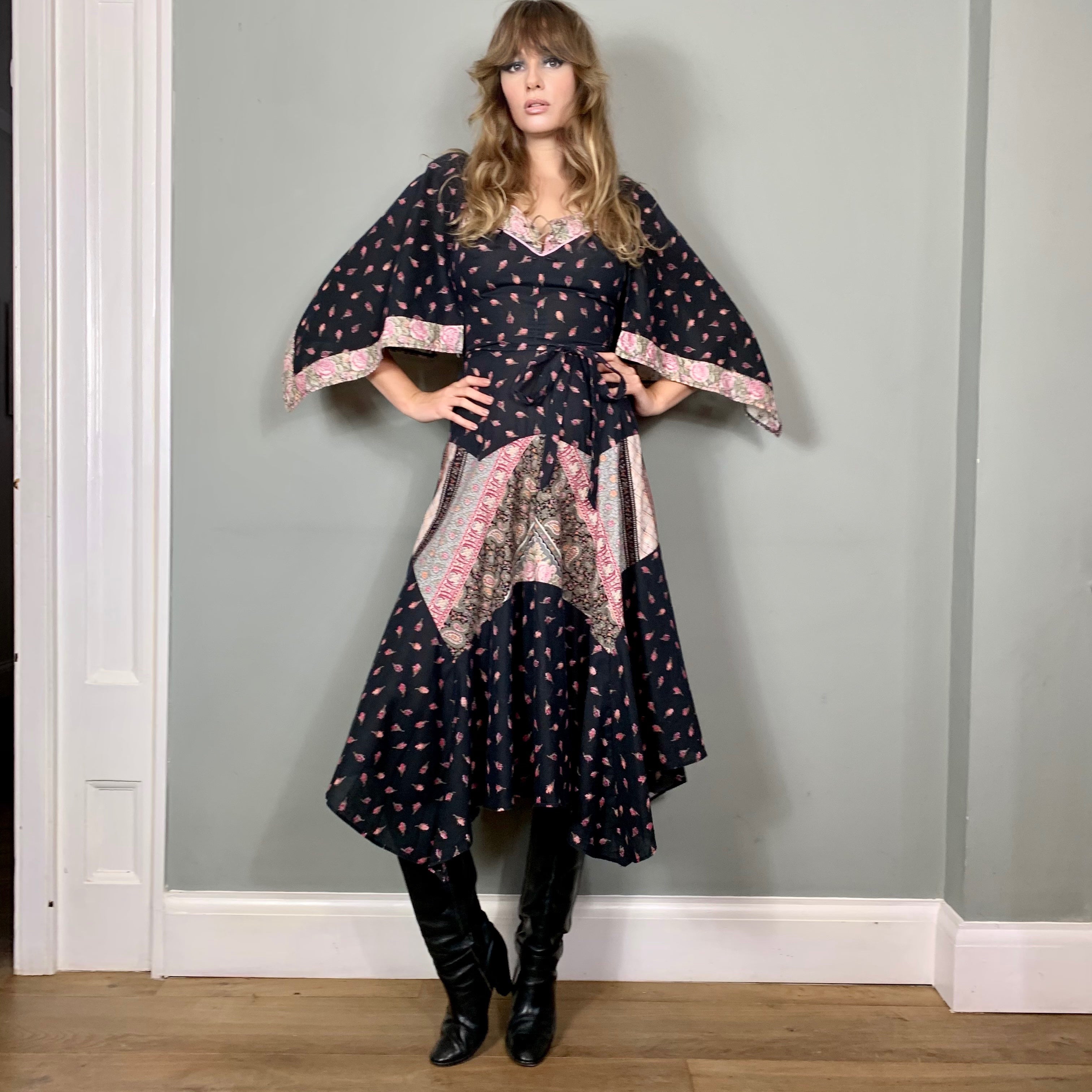 The most sublime 70s dress with a small rose print and mixed print panels scalloped on skirt. The sleeves are handkerchief style and the swing skirt is cut in the most magnificent panel bias style. Zips at the back and looks fab belted with boots.