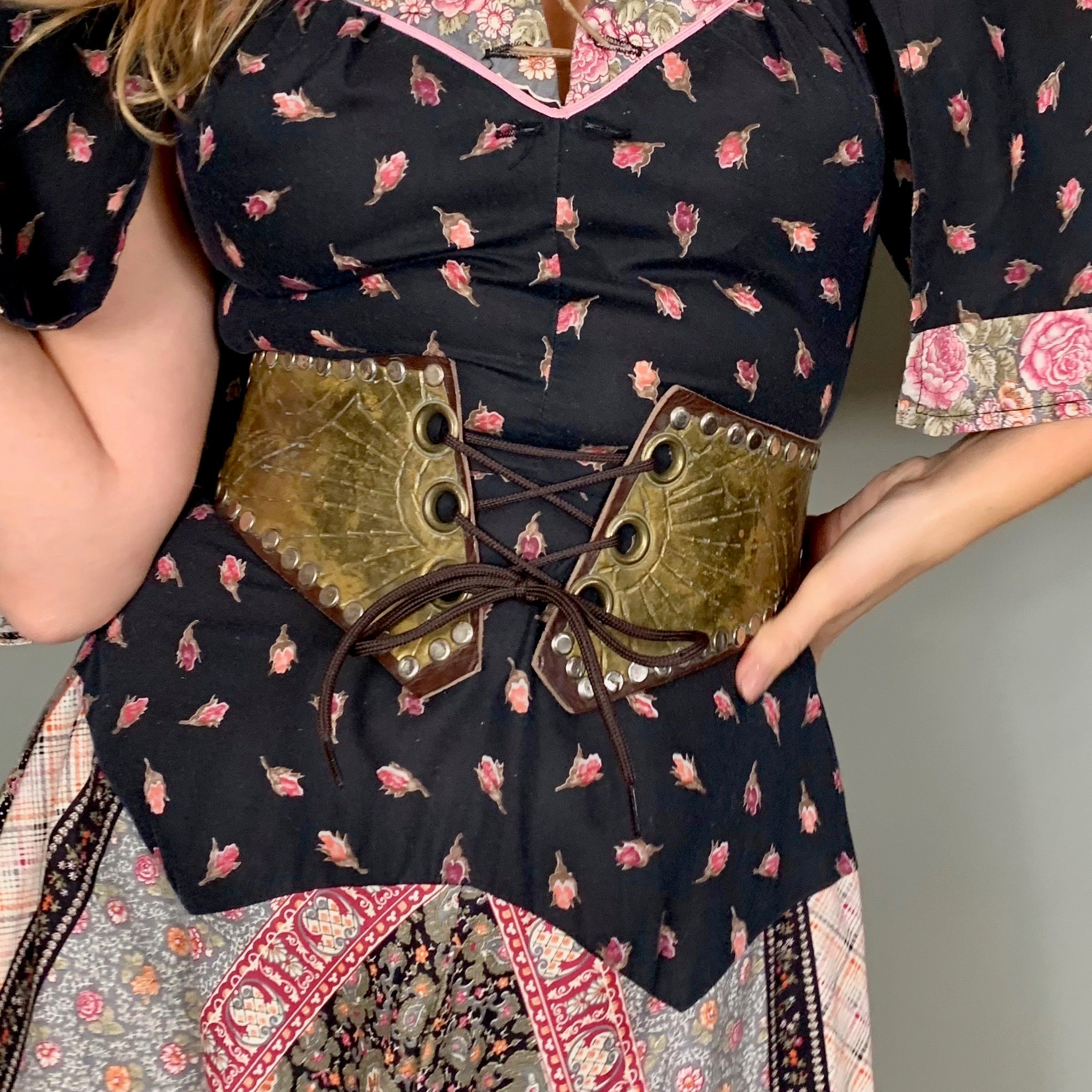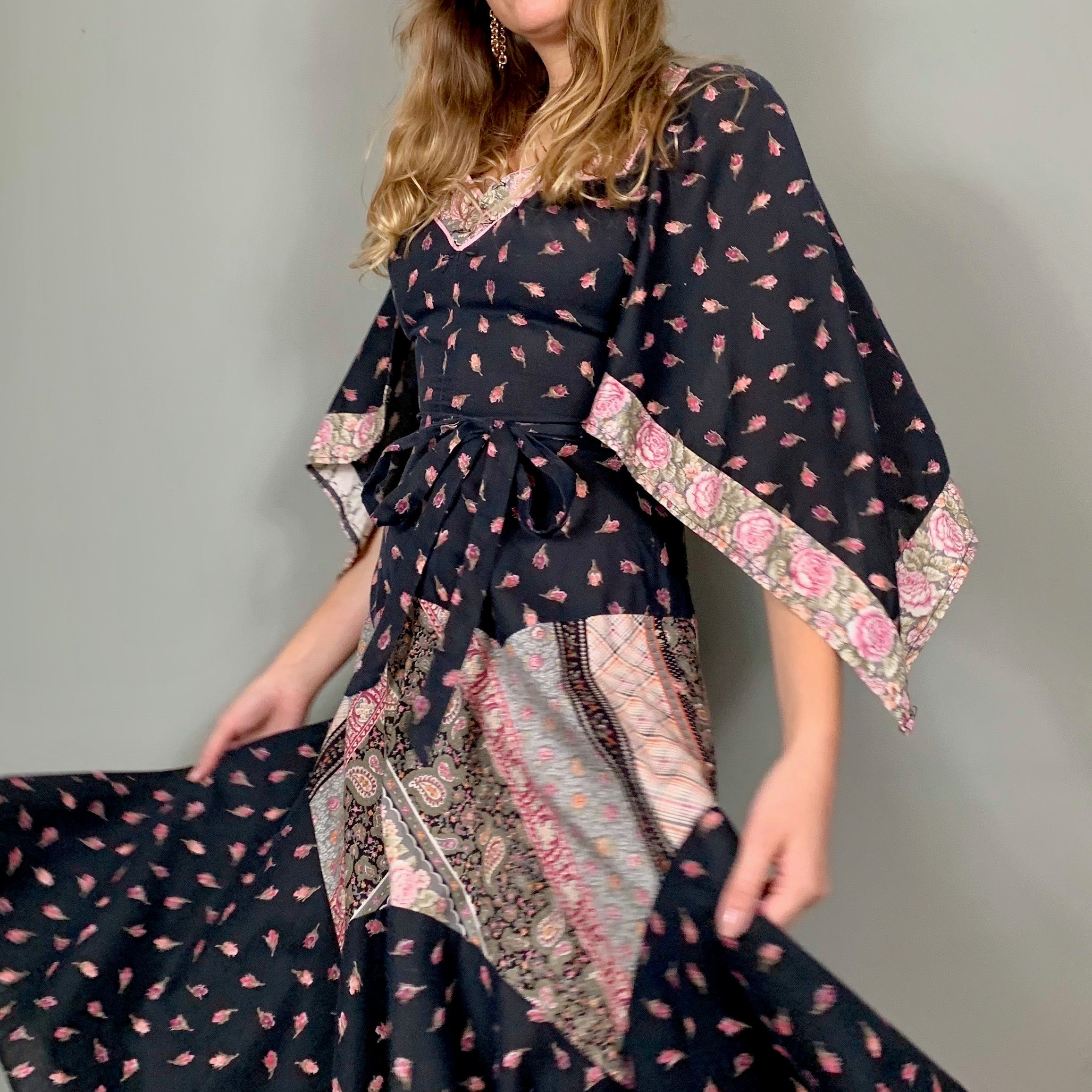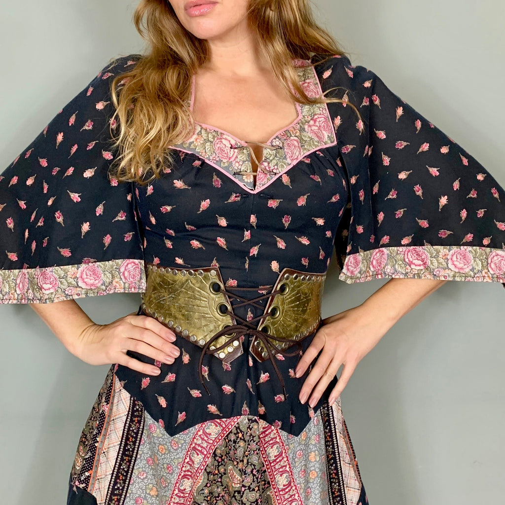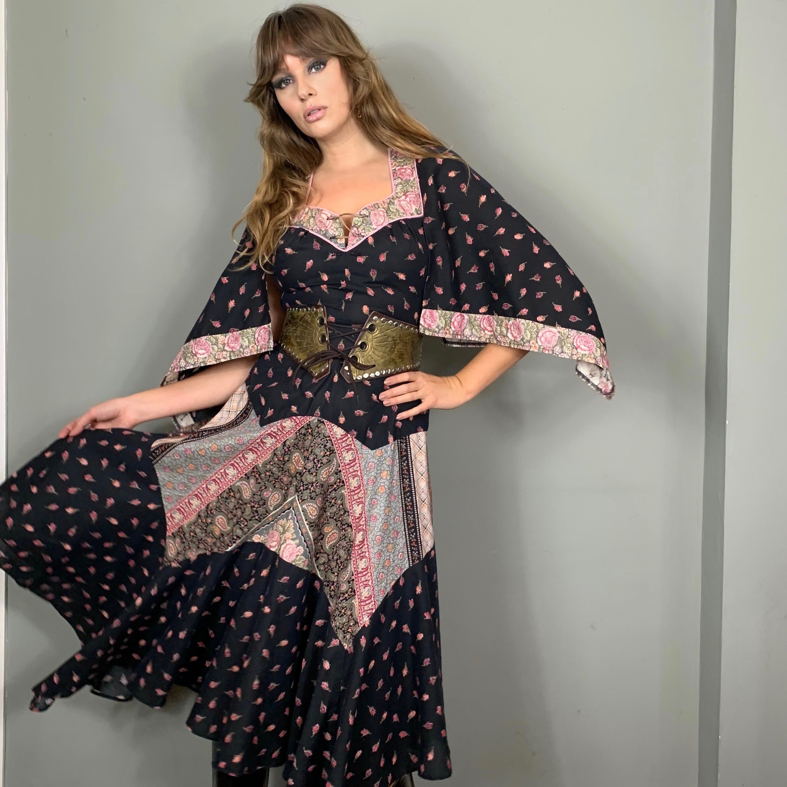 The most sublime 70s dress with a small rose print and mixed print panels scalloped on skirt. The sleeves are handkerchief style and the swing skirt is cut in the most magnificent panel bias style. Zips at the back and looks fab belted with boots.
