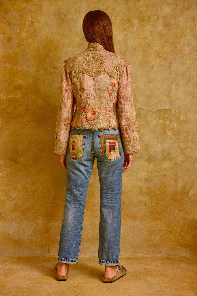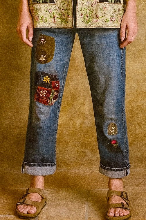 OV Denim, 70s jeans with Victorian hand embroidered patches