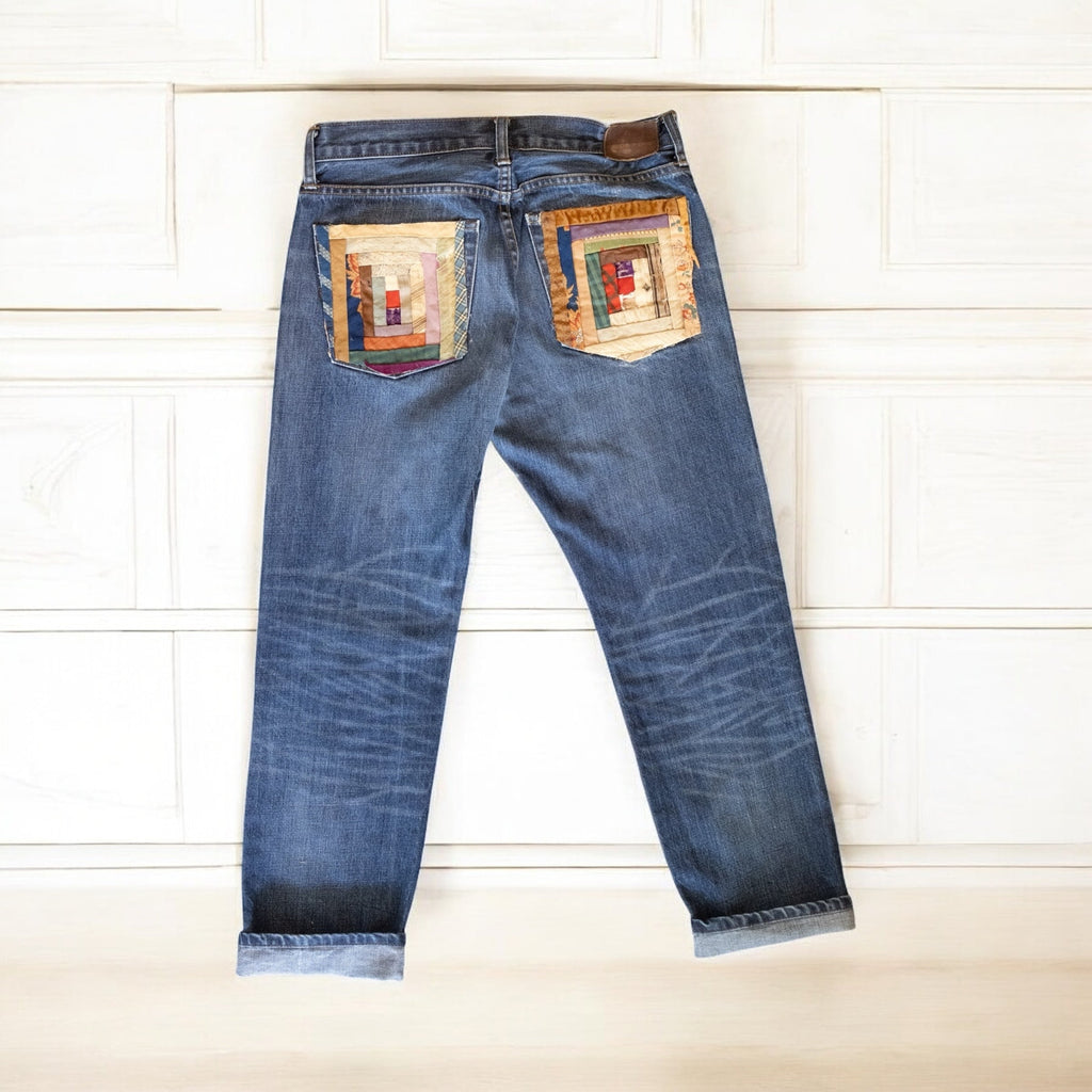 These original 1970s stonewashed jeans combine vintage charm with unique craftsmanship. Featuring a mid-rise front zip and relaxed boyfriend silhouette, they offer both comfort and style. Distinctive Victorian quilted pockets and hand-embroidered Victorian patches on the front and back create a one-of-a-kind piece.