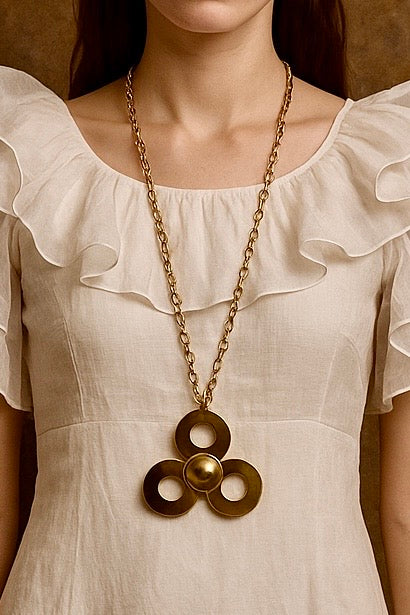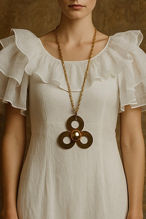 This original 1970s pendant highlights a striking large circular geometric design crafted from gold-plated metal. It is suspended from a gold-plated chain equipped with an adjustable length feature and a discreet back hook, providing both style and practicality. An ideal piece for those seeking authentic vintage jewelry with distinctive mid-century modern appeal.