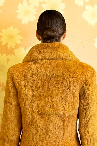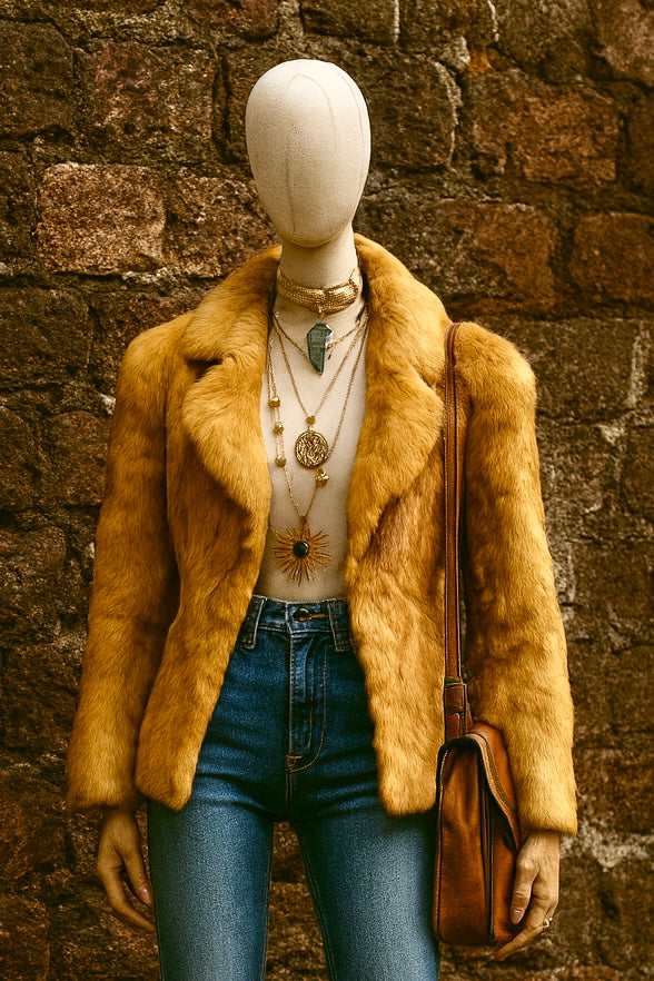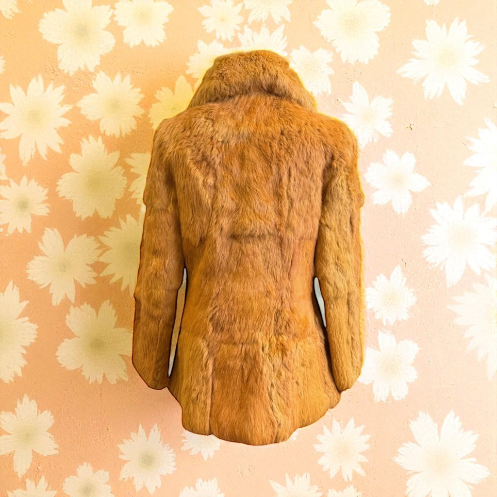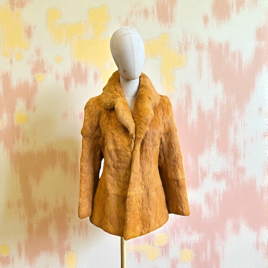 This original 70s strawberry blonde fur jacket is a true standout piece. Made from high-quality rabbit fur, it features strong lapels, a fitted silhouette, and a single front button. The unusual colour adds a touch of uniqueness and pairs perfectly with denim. Stay stylish and cozy with this fully lined jacket.