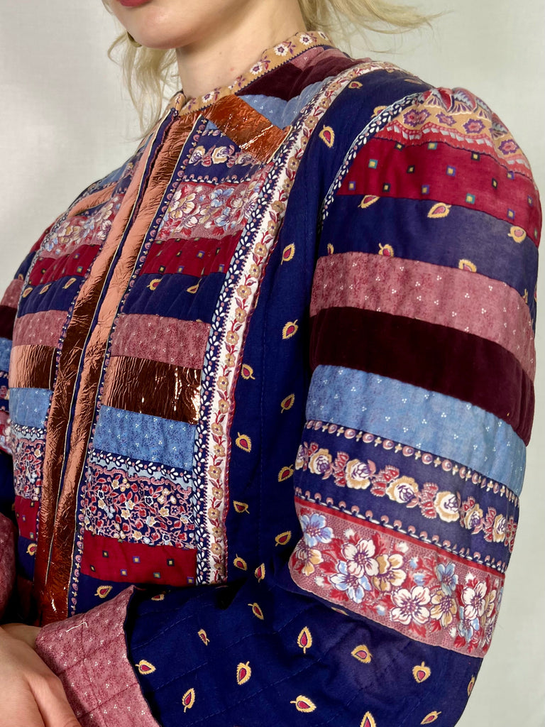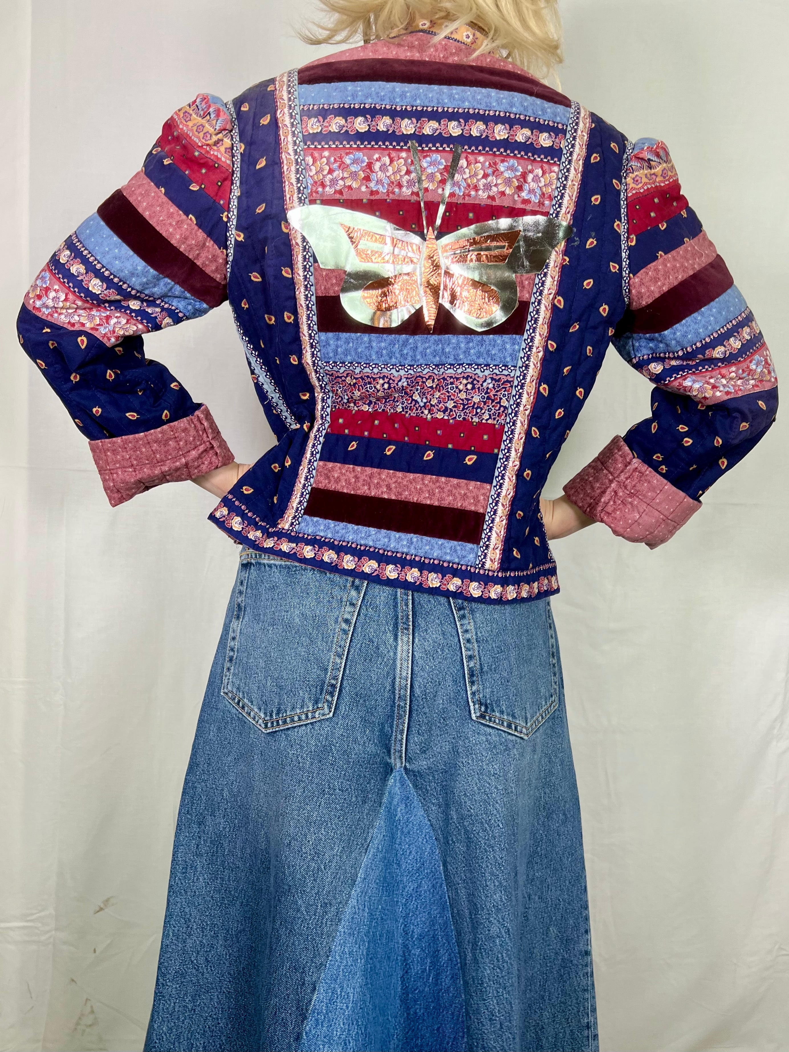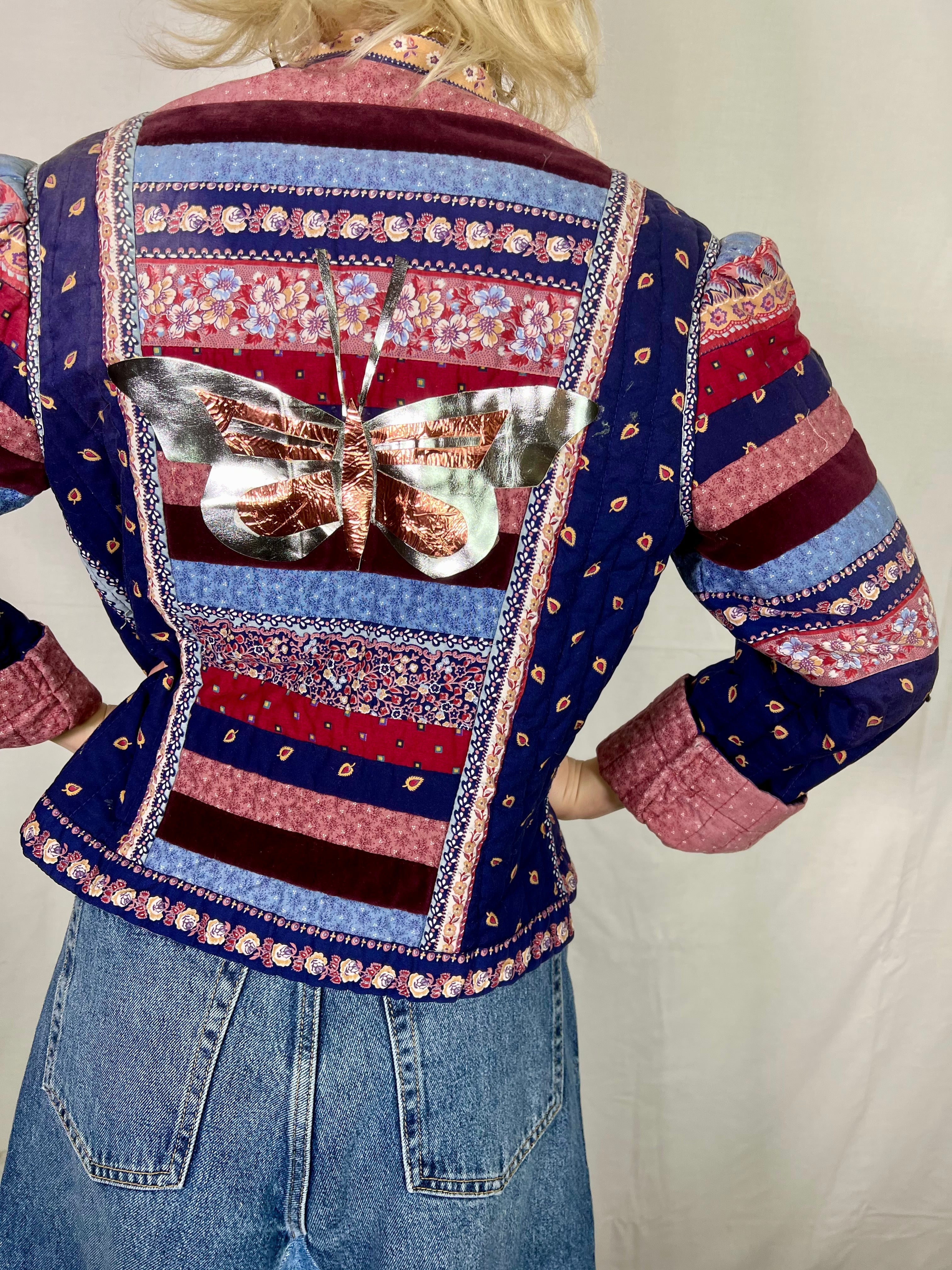 One of a kind 70s patchwork jacket in a soft quilted cotton. Has a straight fit and a slight puff on the shoulder. Has folder sleeves and a large metallic leather butterfly on the back and front detail. Fastens with 4 front hooks and eyes.