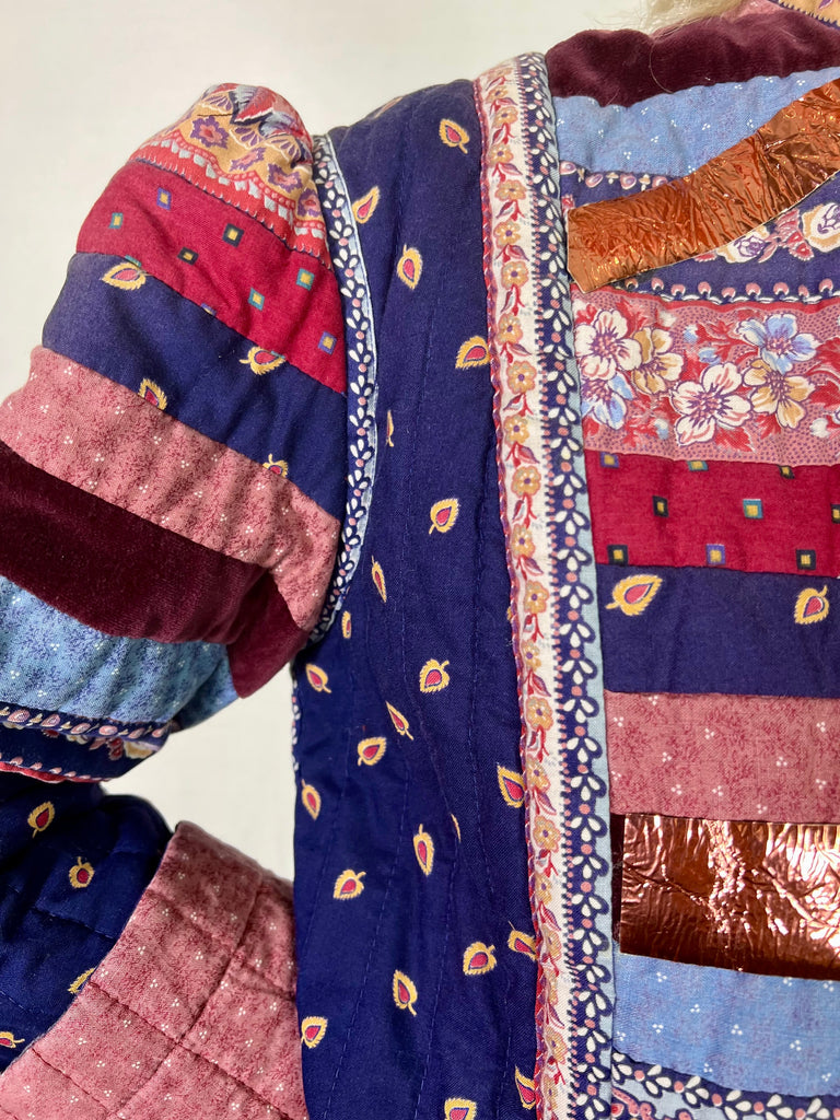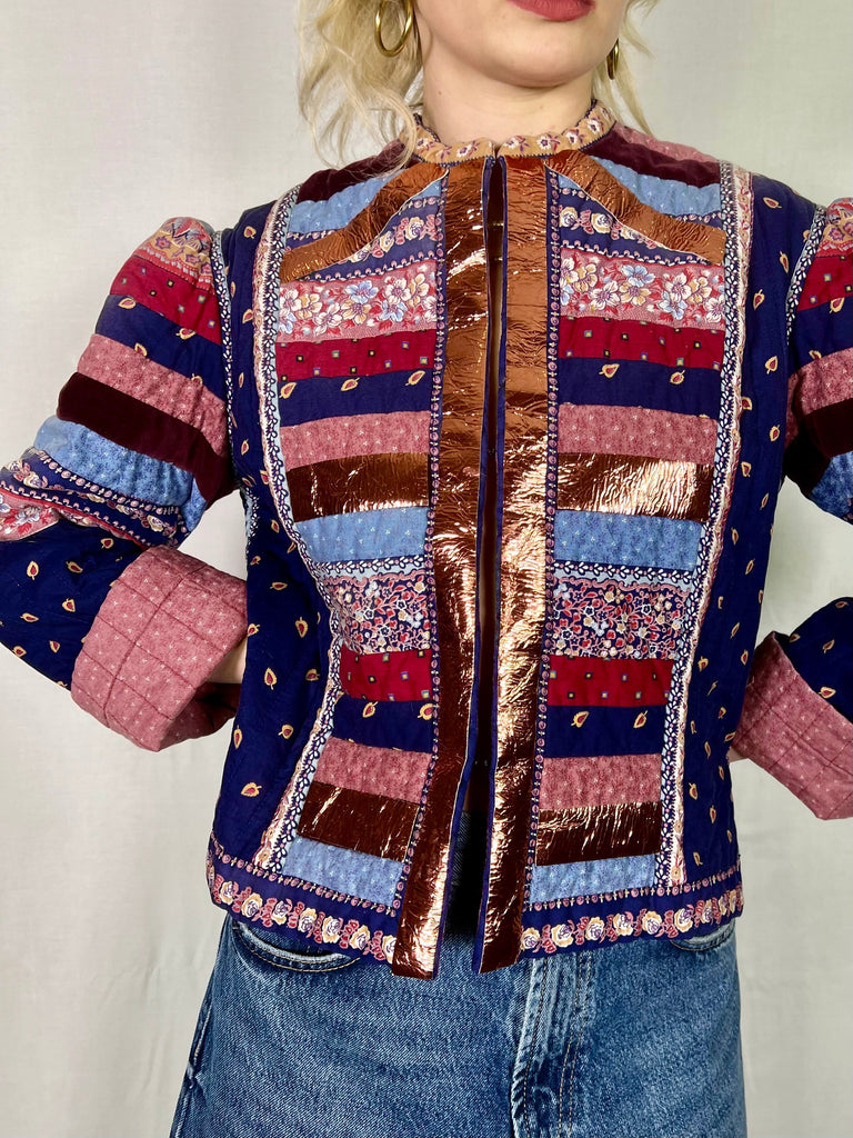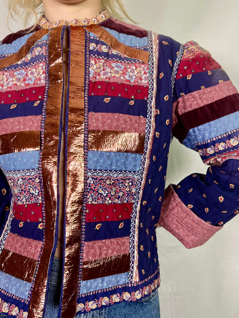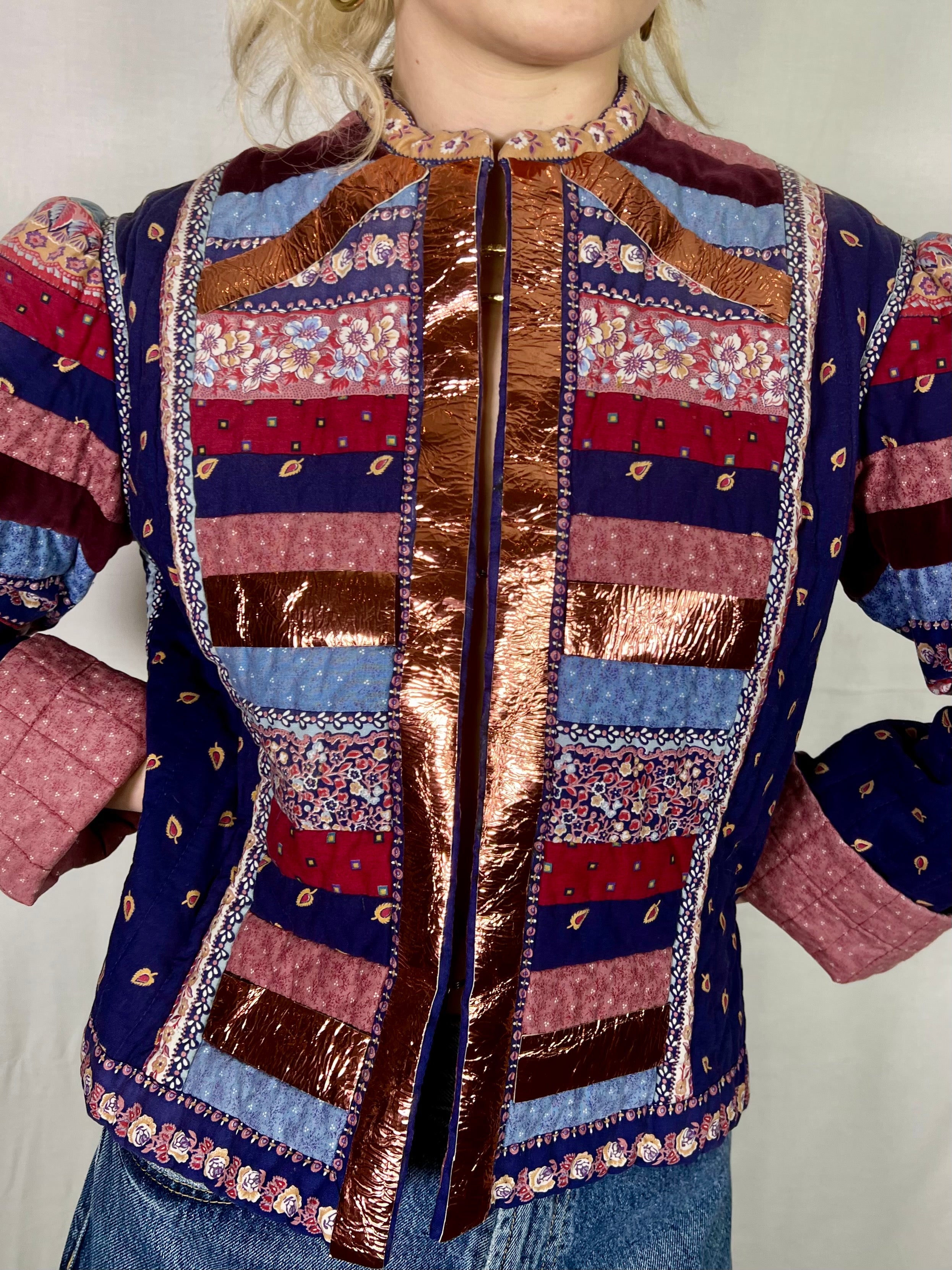 One of a kind 70s patchwork jacket in a soft quilted cotton. Has a straight fit and a slight puff on the shoulder. Has folder sleeves and a large metallic leather butterfly on the back and front detail. Fastens with 4 front hooks and eyes.