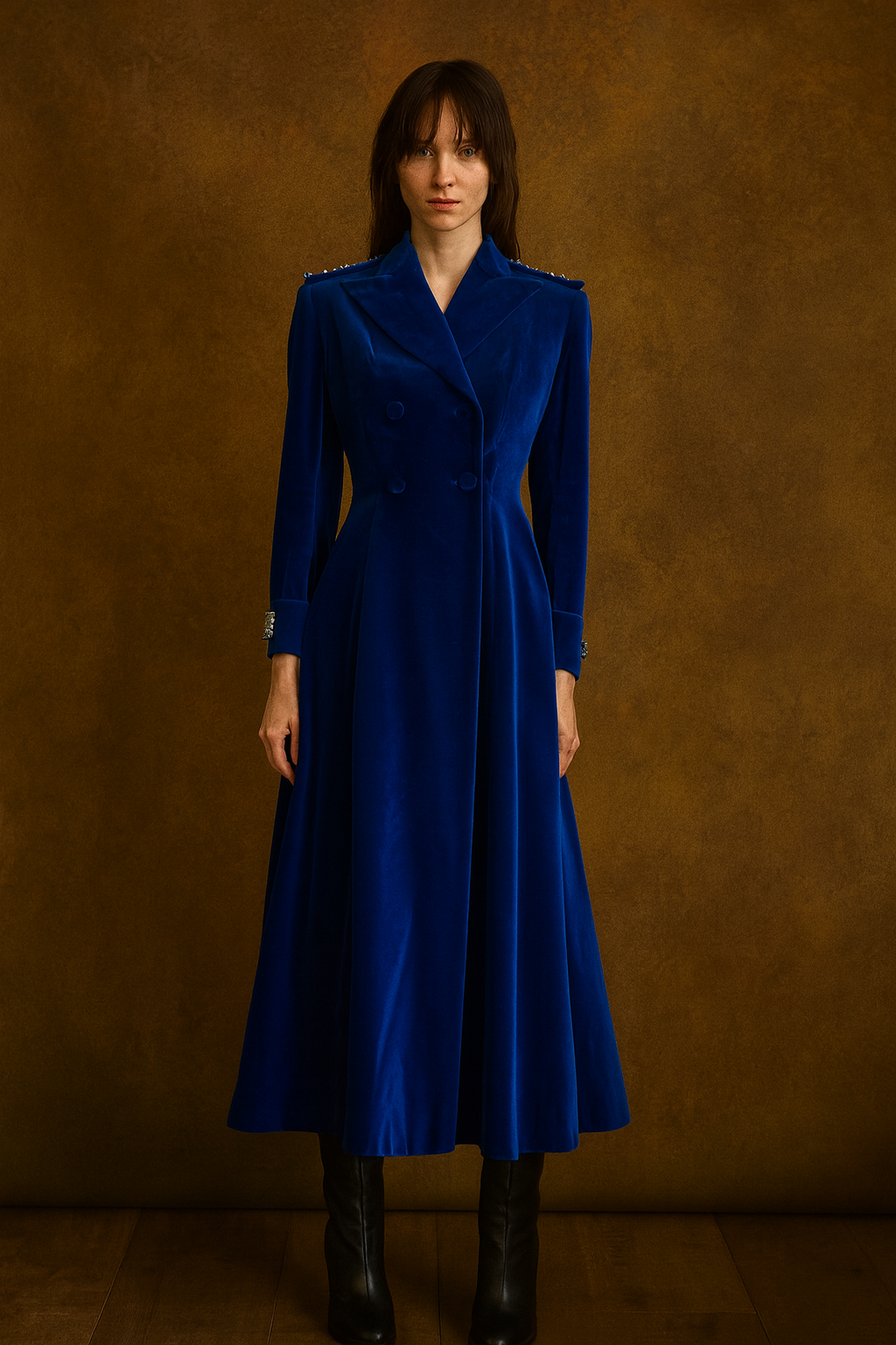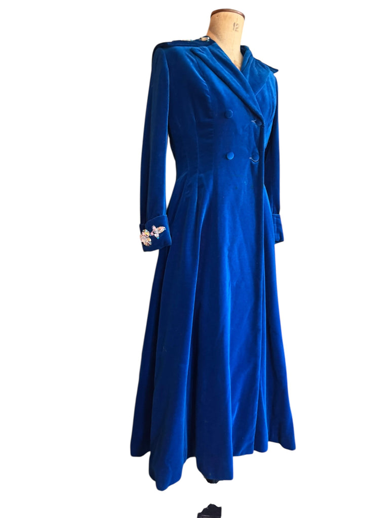 Stevie, 70s couture blue velvet double breasted jewelled coat