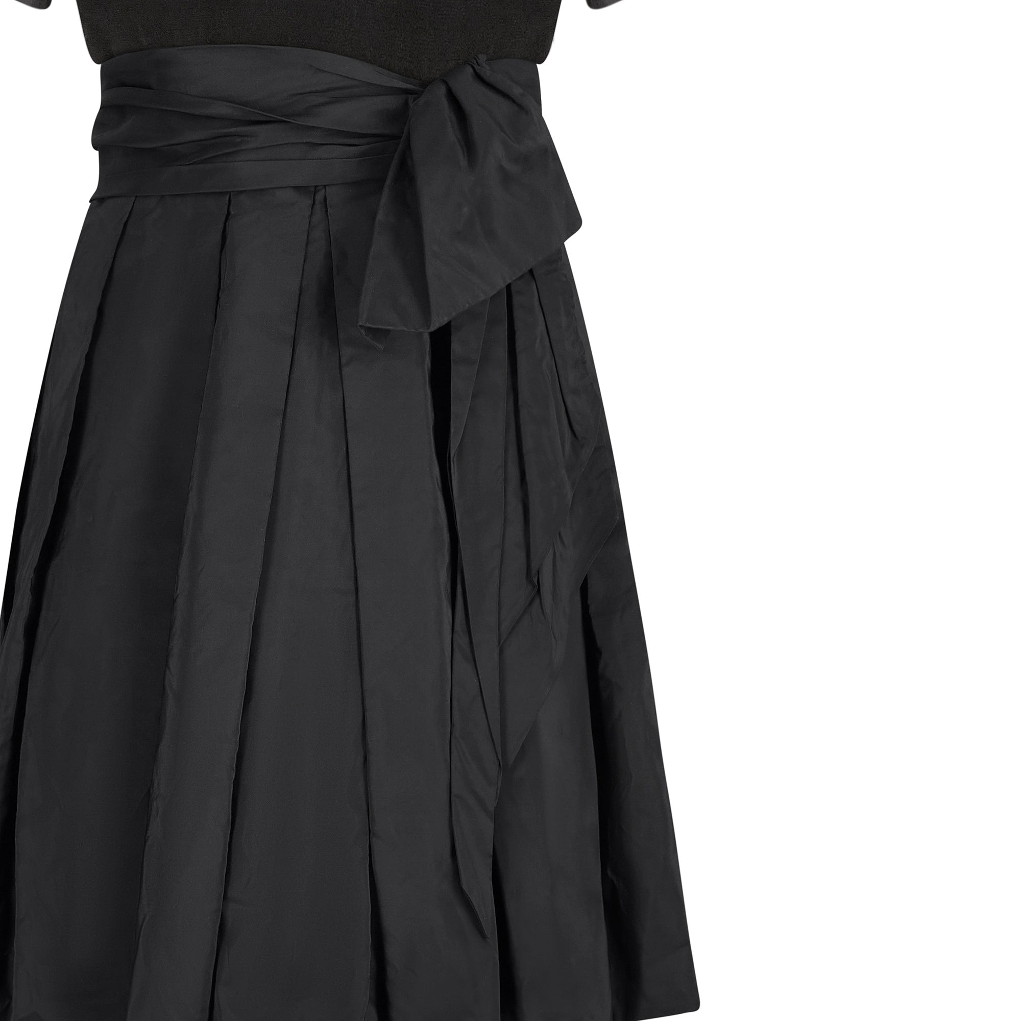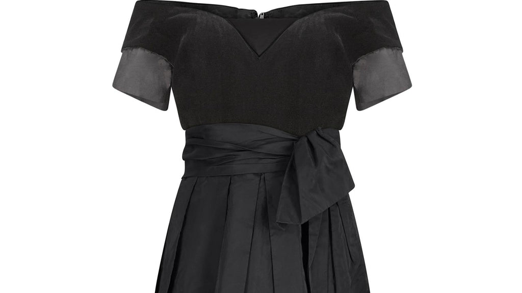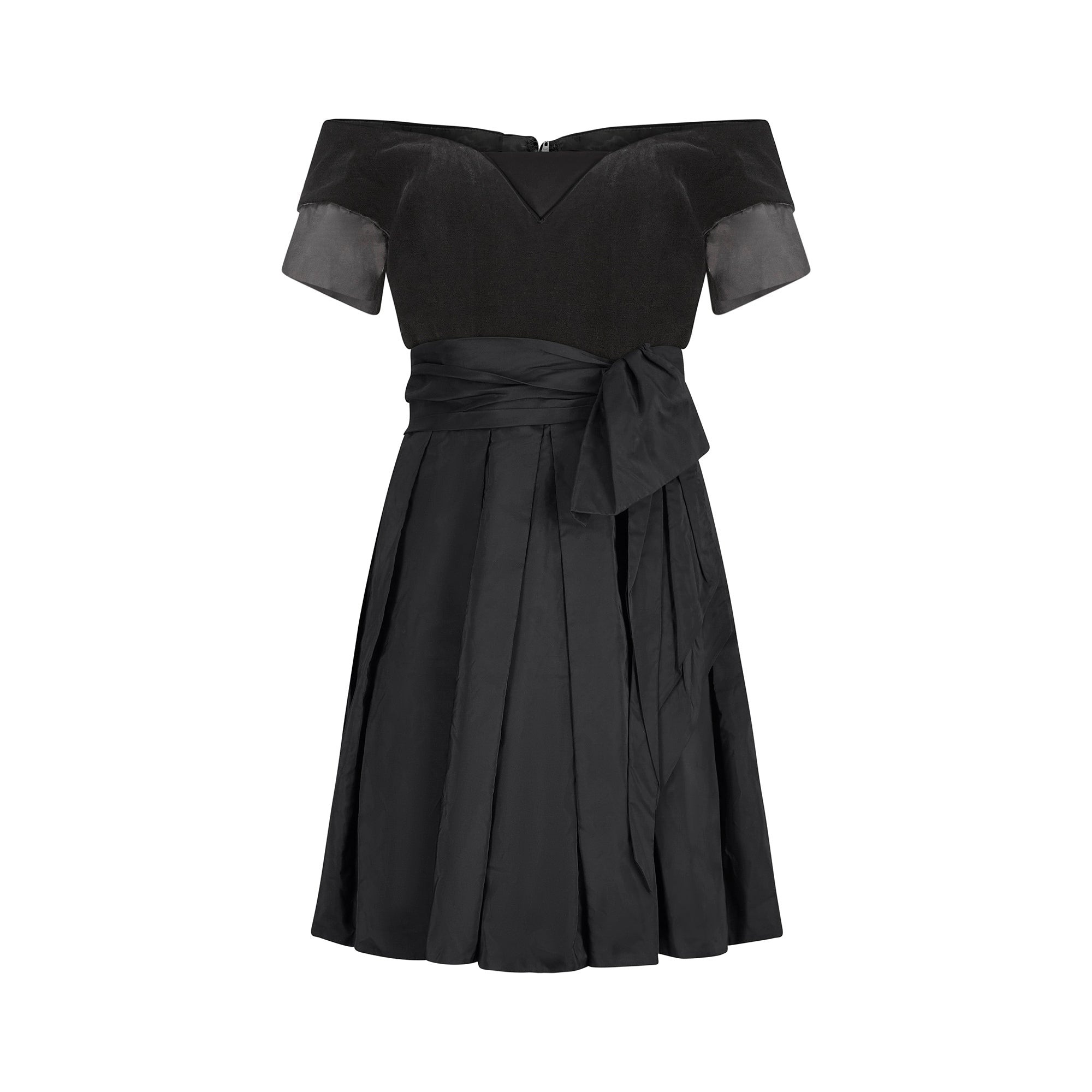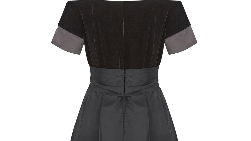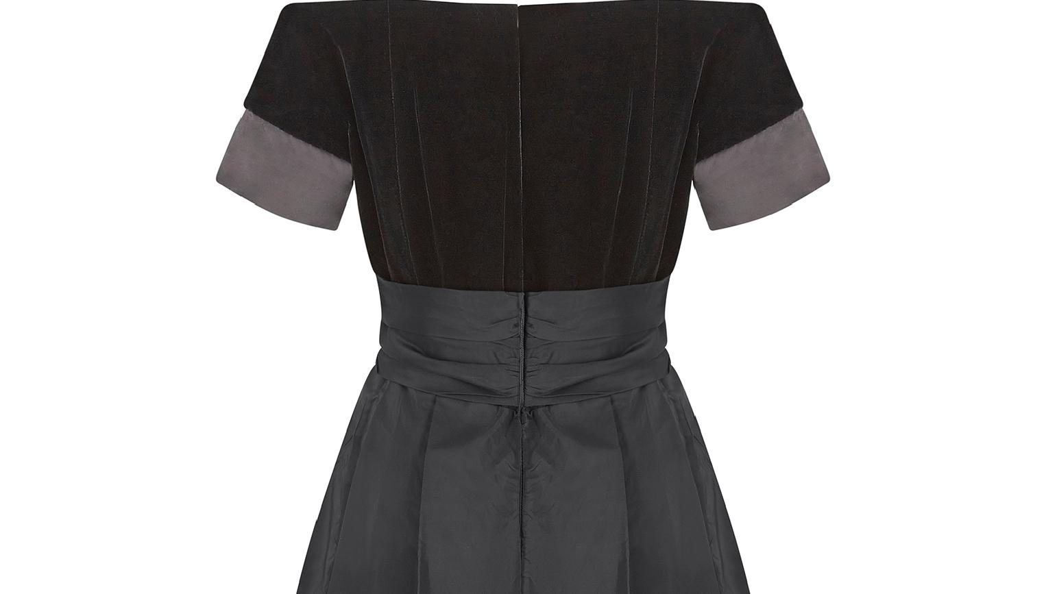 A very early design from high end occasion wear specialist Jenny Packham; this 1980s black velvet and silk cocktail dress is perfect for the upcoming party season. The bodice is made up of a lovely thick black velvet, with a plunging sweetheart neckline, trimmed with a delicate silk piping. There is a triangle modesty panel of silk at the V point of the neckline, and the sleeves are also capped in the same black silk fabric. The dress has a classic 50s silhouette which was revived and updated during the 80s. The skirt flares out from the waist and is lined with a quality soft silk. It features a mesh underskirt to give the dress volume and structure and is finished with a bow detail belt.