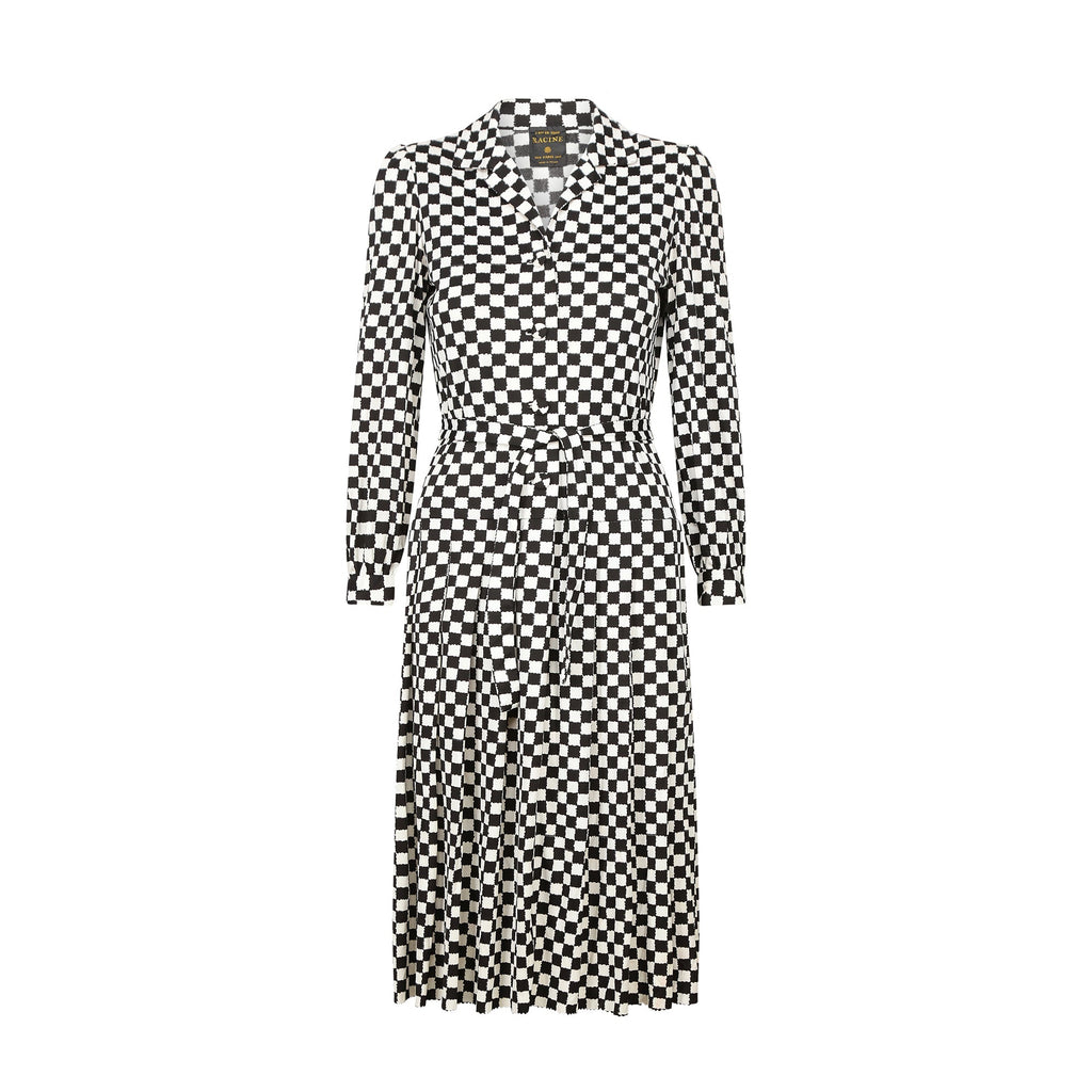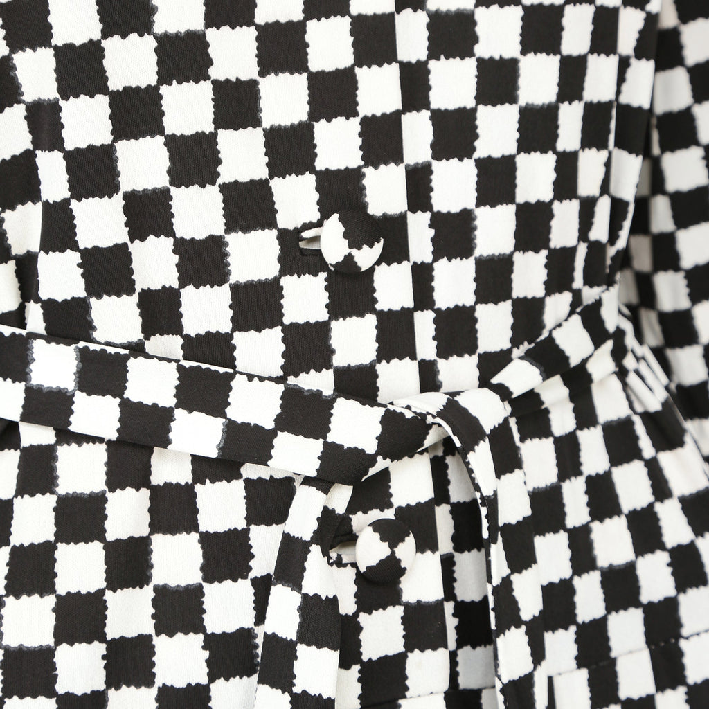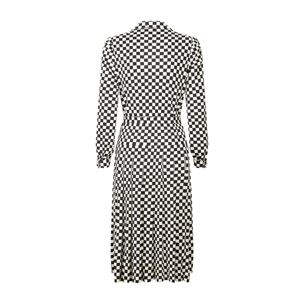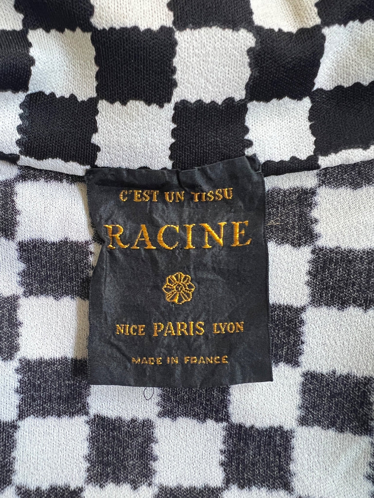 This timeless monochrome checkerboard patterned dress was designed in the late 1970s to early 1980s by Racine. The style is so timeless, it could pass for designs from the mid 60s through to the 90s and would be a great choice for a race meet such as Goodwood. Tailored from luxurious jersey fabric, it has a laid-back, flowing silhouette that falls to a mid-calf length. It has a button-down front adorned with fabric-covered buttons and finished with a small open-collar. The skirt has a drop-waist and falls in box pleats from below that hem-line. The sleeves are tailored to a subtle bell silhouette. Each cuff is finished with a fabric-covered button. It has a coordinating tie belt to cinch the waist. This dress is unlined. The original label reads “C’est un tissu - Racine - Nice Paris Lyon - Made in France” in bronze font on black cloth.