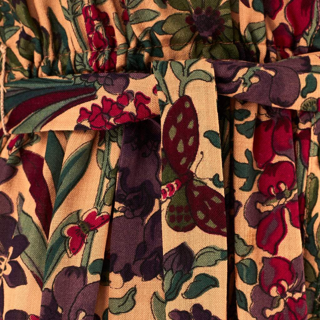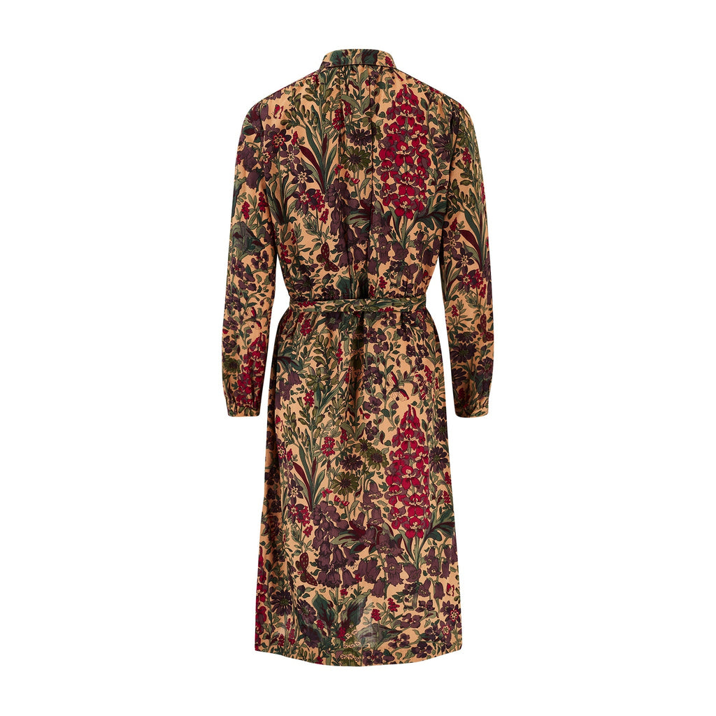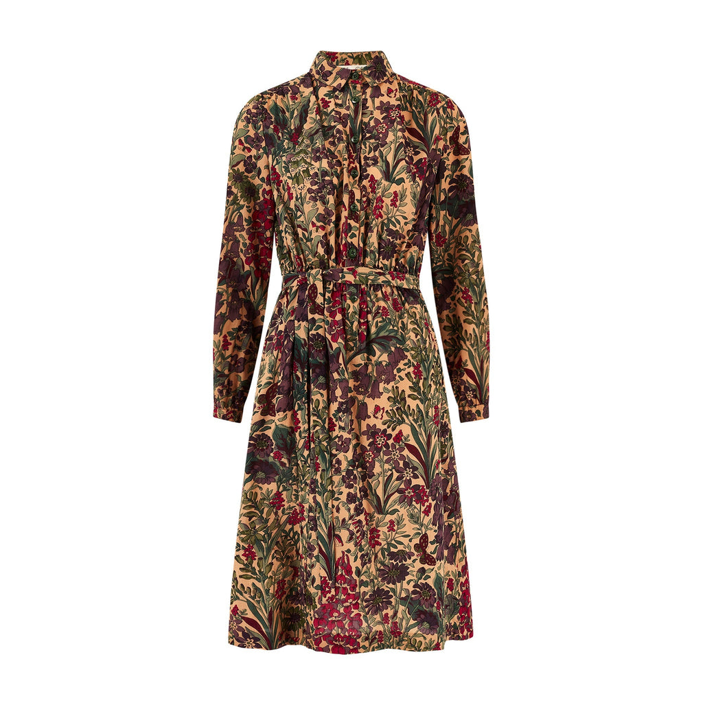 This mid-length 1980s shirt-dress is by British designer Susan Small. Tailored from a beige textured lightweight wool from Liberty Fabrics patterned with painterly florals and foliage in raspberry, aubergine and deep sage-green hues. It has a long-sleeve cut with gathered button cuffs. The front buttons up to the collar and is secured with forest green buttons. The button placket comes down to just below the elasticated waistband. The skirt has an A-line cut and falls to the bottom of the calf. The dress is unlined. There is a coordinating soft fabric belt that can cinch the waist further or be tied at the neck.
