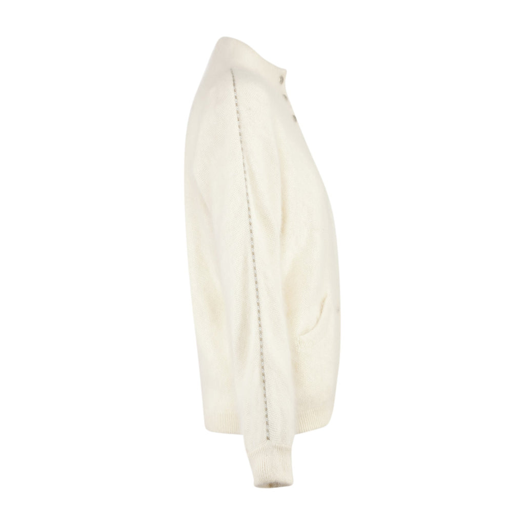Crafted from the softest angora wool, the top is tailored to a low-key bomber jacket style with rounded shoulders, a cocooning cut and a ribbed collar and cuffs. It fastens at the front with flat silver buttons that look like snap closures from the outside. There are two slanted welt pockets at the waist. The back of the arms are detailed with metallic silver braid. The rear of this playful cardigan is adorned with a delightful cream, olive and white silk parrot edged in metallic silver thread and detailed with metal eyelets and rivets.