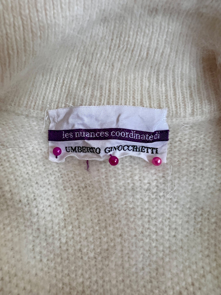 This 1980s novelty applique cardigan was designed by Italian fashion house Umberto Ginocchietti. The eponymous designer and businessman first found success in the 1960s importing Angora wool and manufacturing knitting yarn from which this jumper is made. He owned large factories, licencing and manufacturing ready-to-wear garments for many of the greatest Italian and French designers including Giorgio Armani, Valentino, Yves Saint Laurent, Christian Dior, Givenchy, Thierry Mugler and Guy Laroche in the 1970s and 1980s. During the early part of their careers, Domenico Dolce, Stefano Gabbana and Franco Moschino all held Creative Director positions within Ginocchietti’s own brand, and it is highly likely that this garment was designed by one of them. We have included some images from Umberto Ginocchietti's 1982 campaign that features very similar pieces.