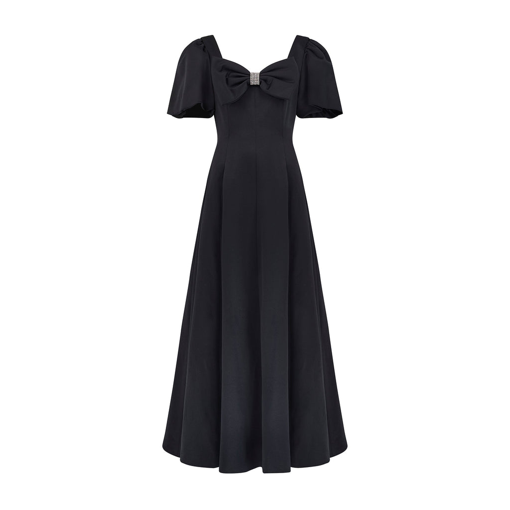 1980s Joan Leslie Black Satin Evening Dress with Large Bow