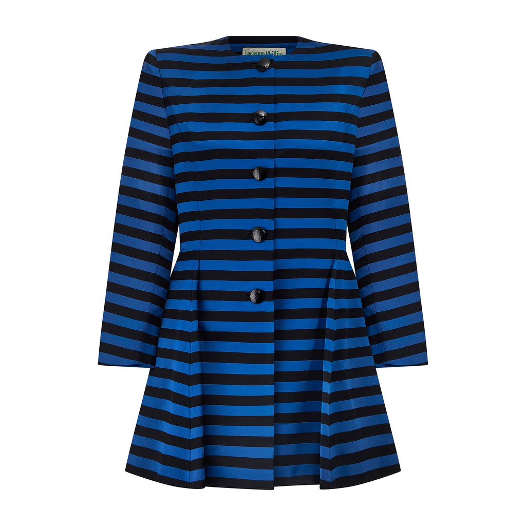 1980s Victor Edelstein Black and Blue Silk Striped Dress Coat