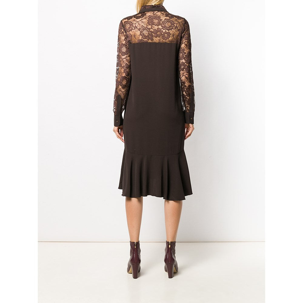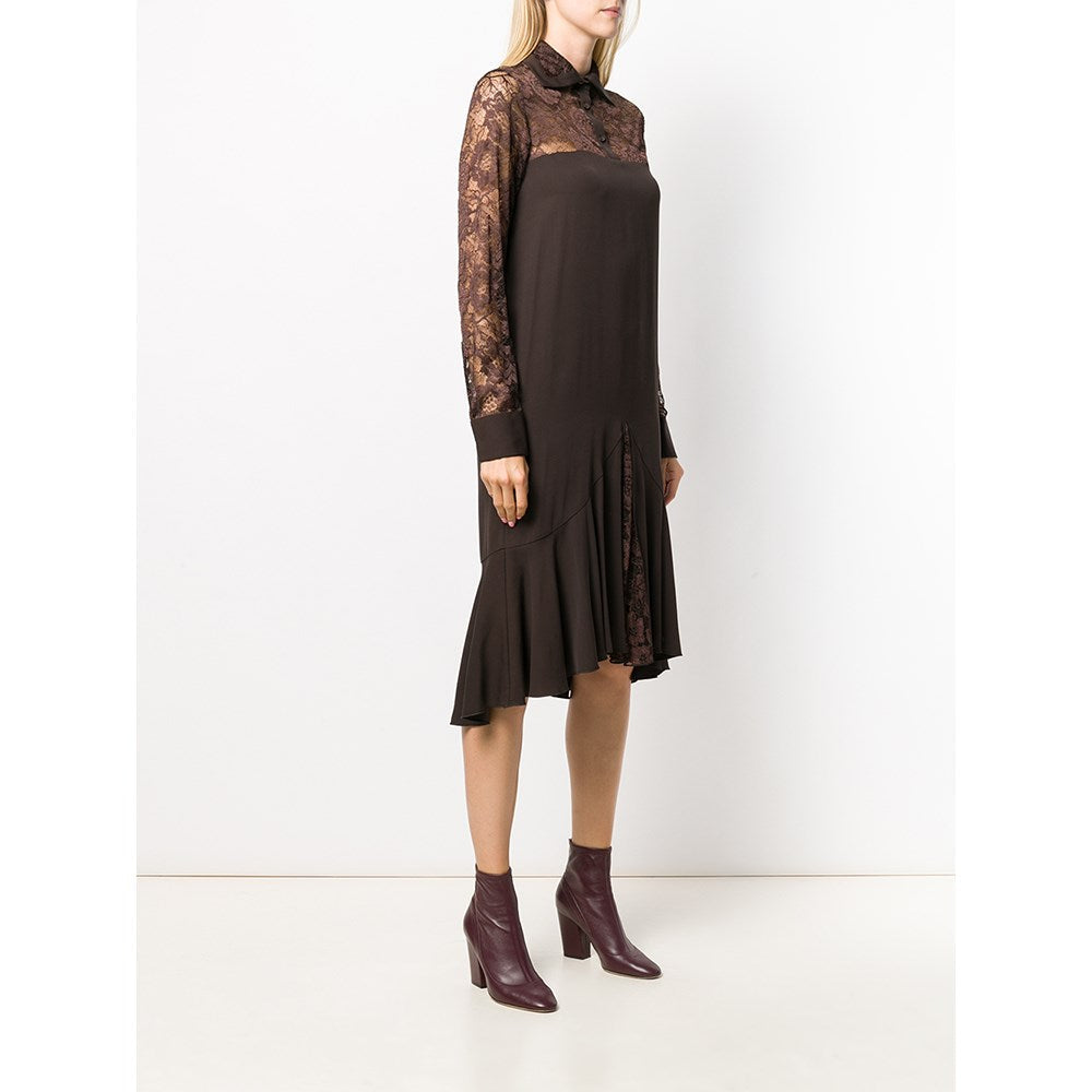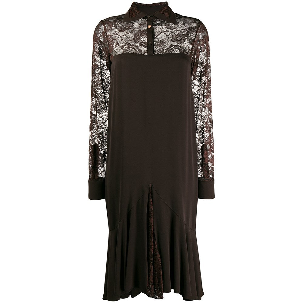 Romeo Gigli brown silk blend long sleeved dress with lace details. Classic collar, front button fastening and buttoned cuffs.