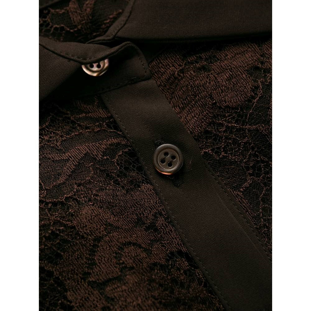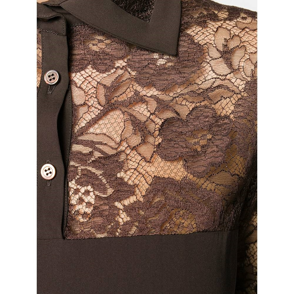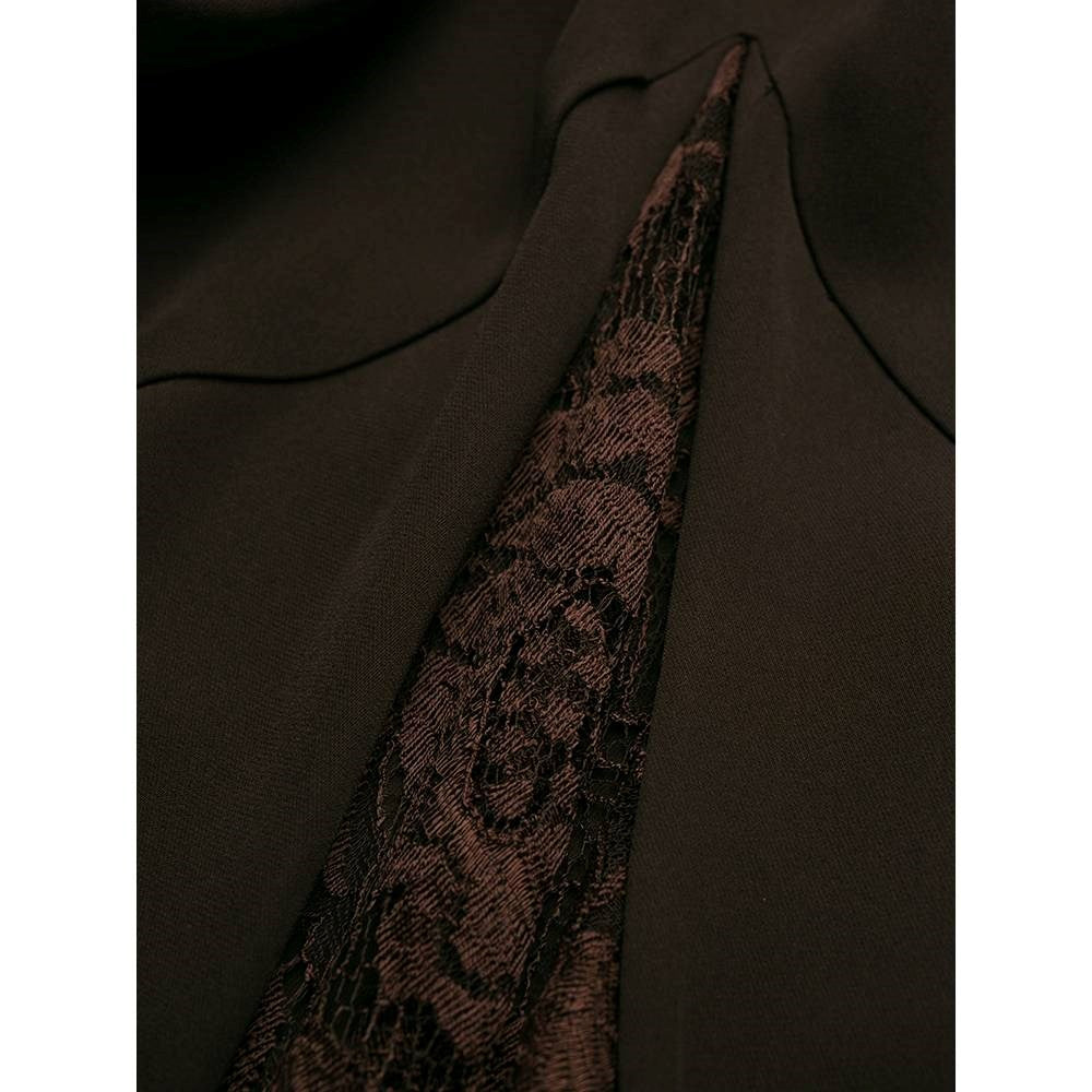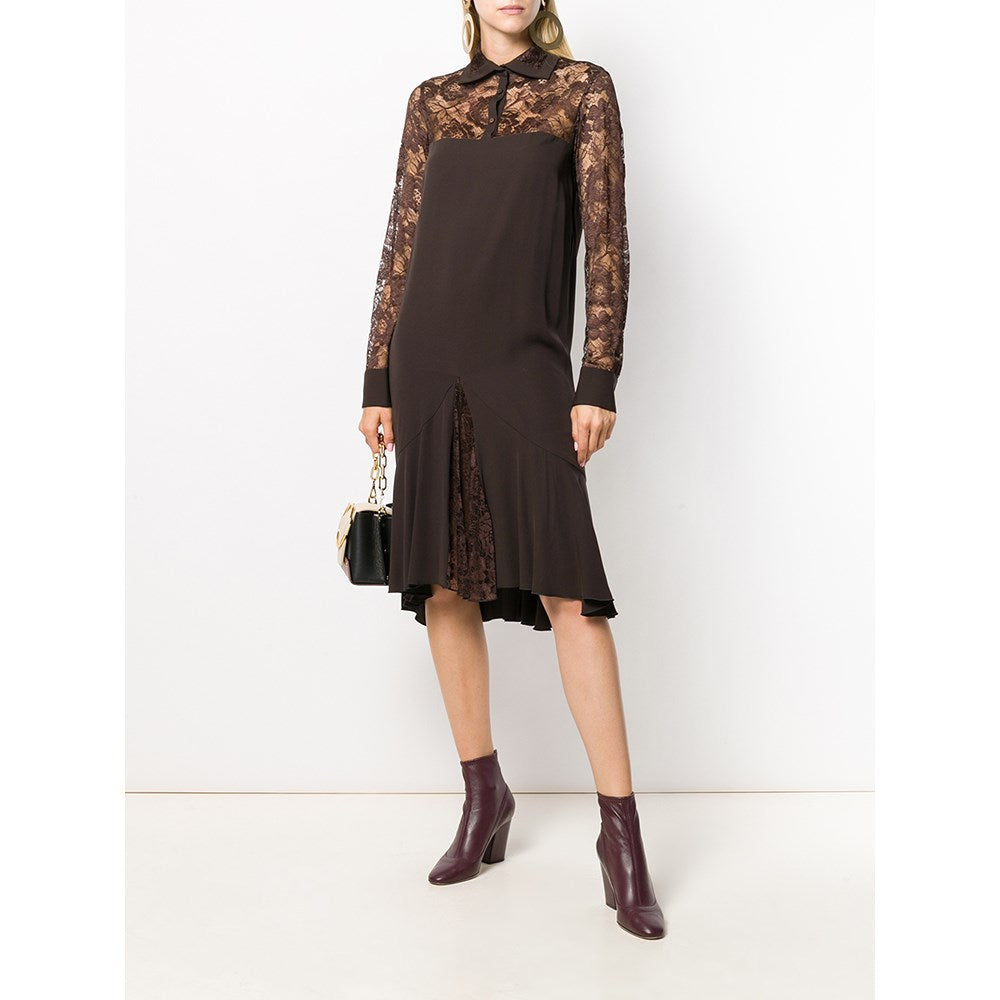 Romeo Gigli brown silk blend long sleeved dress with lace details. Classic collar, front button fastening and buttoned cuffs.