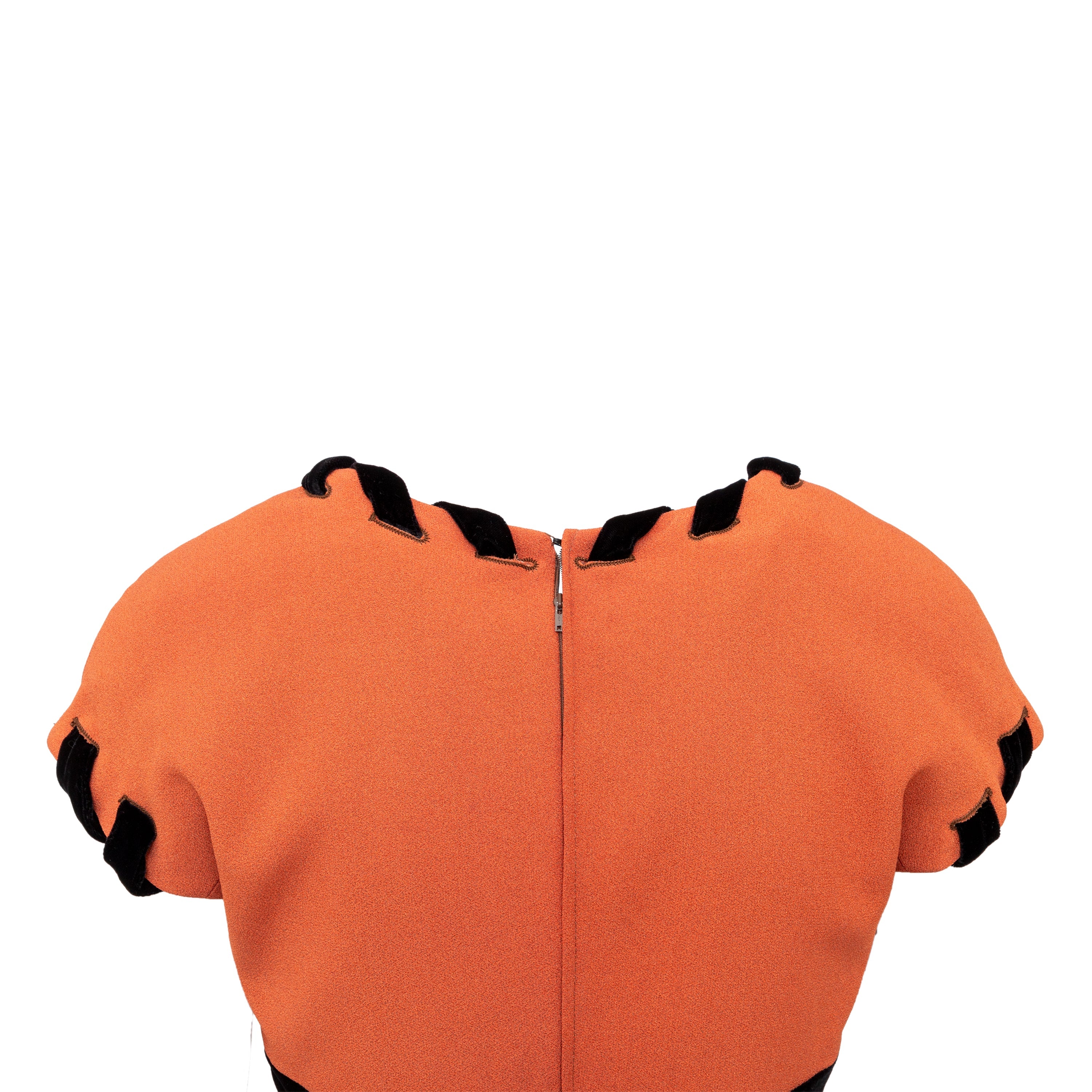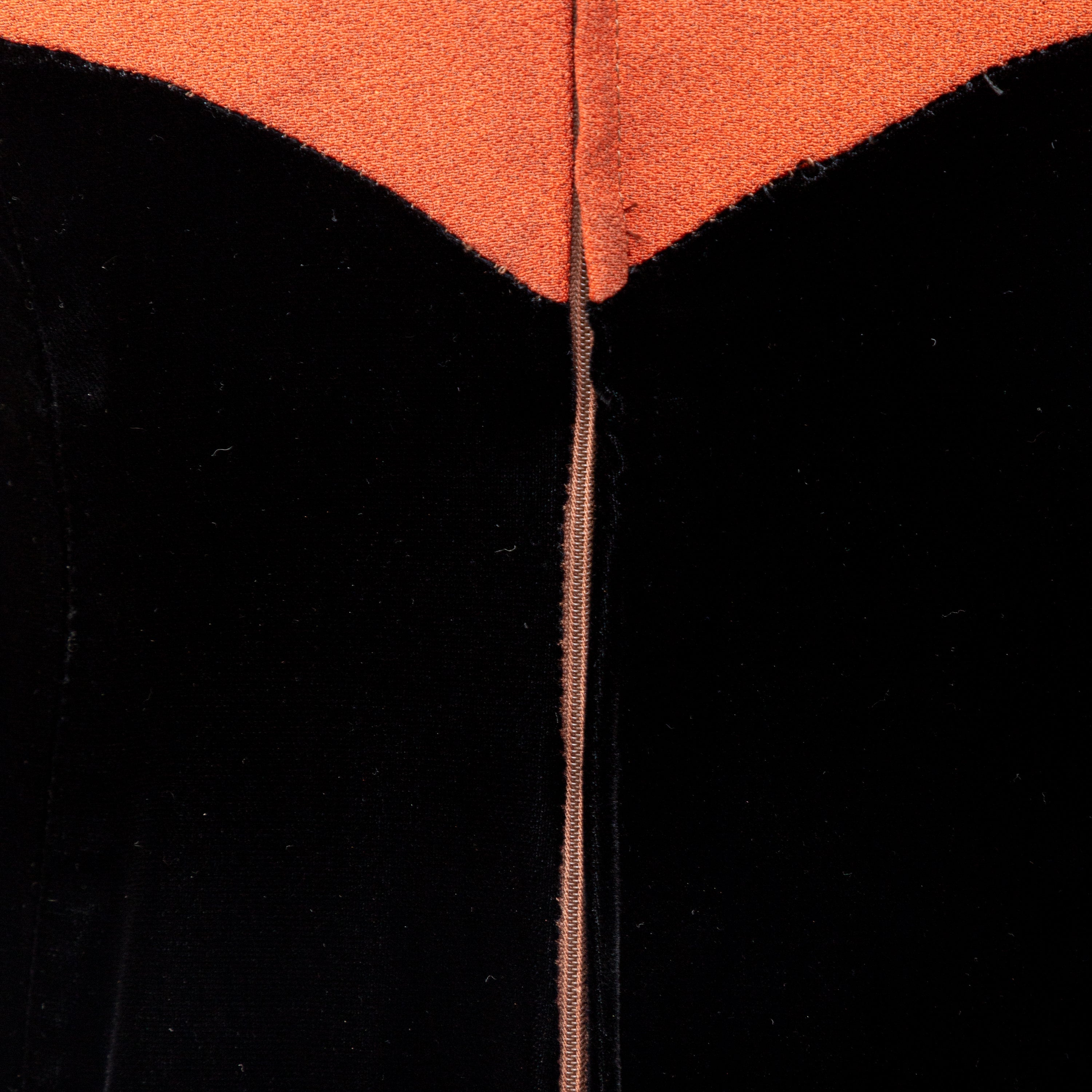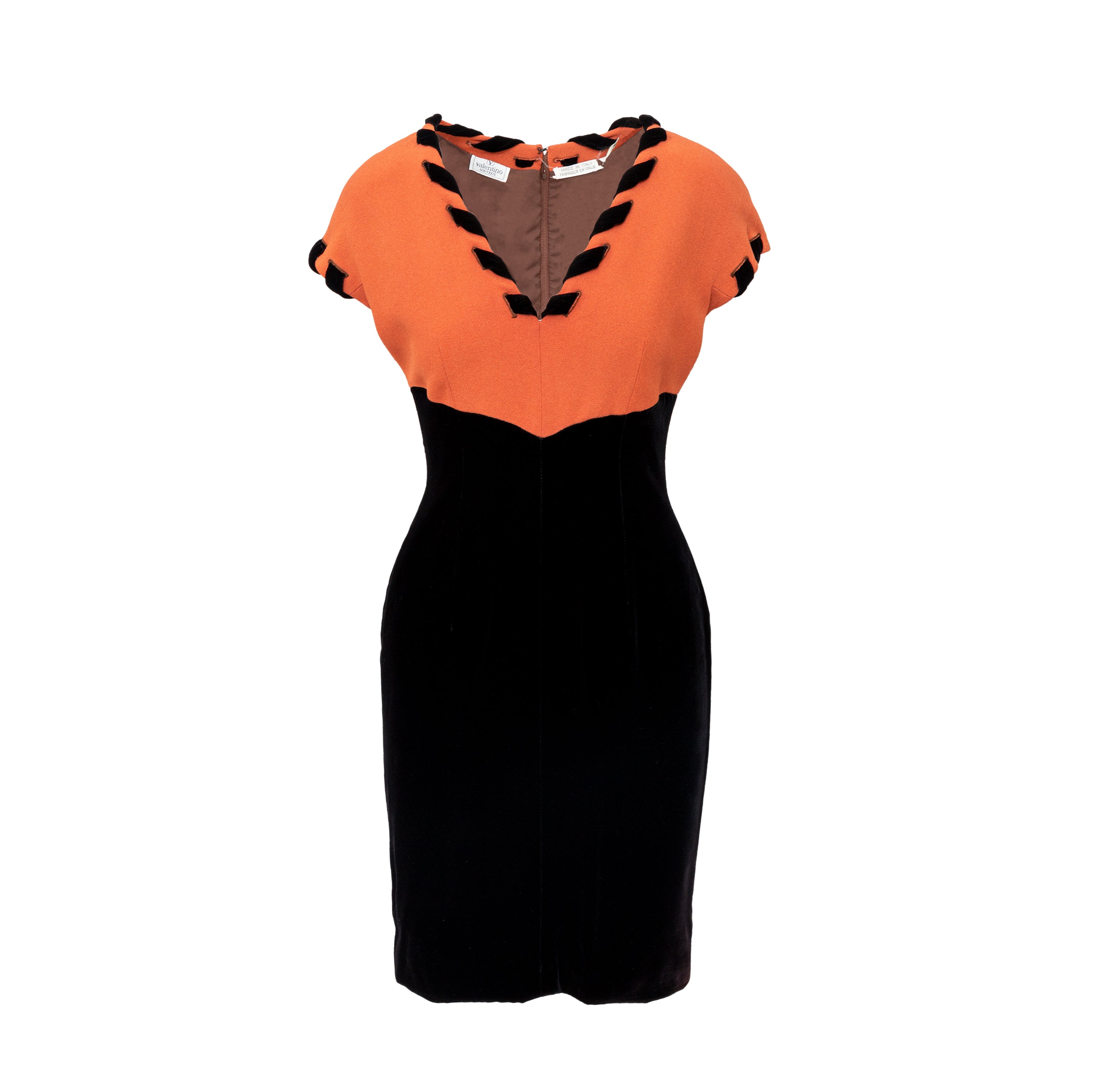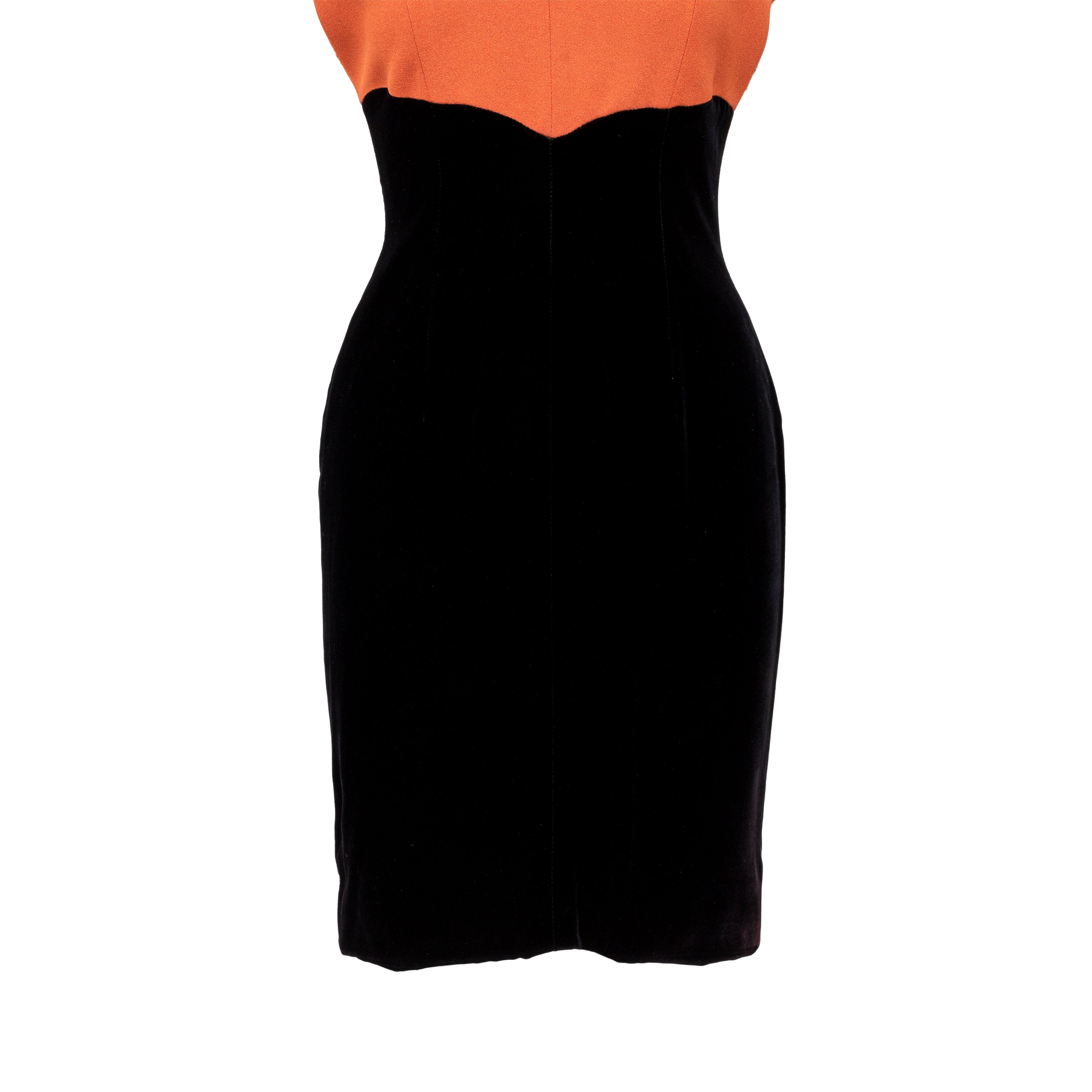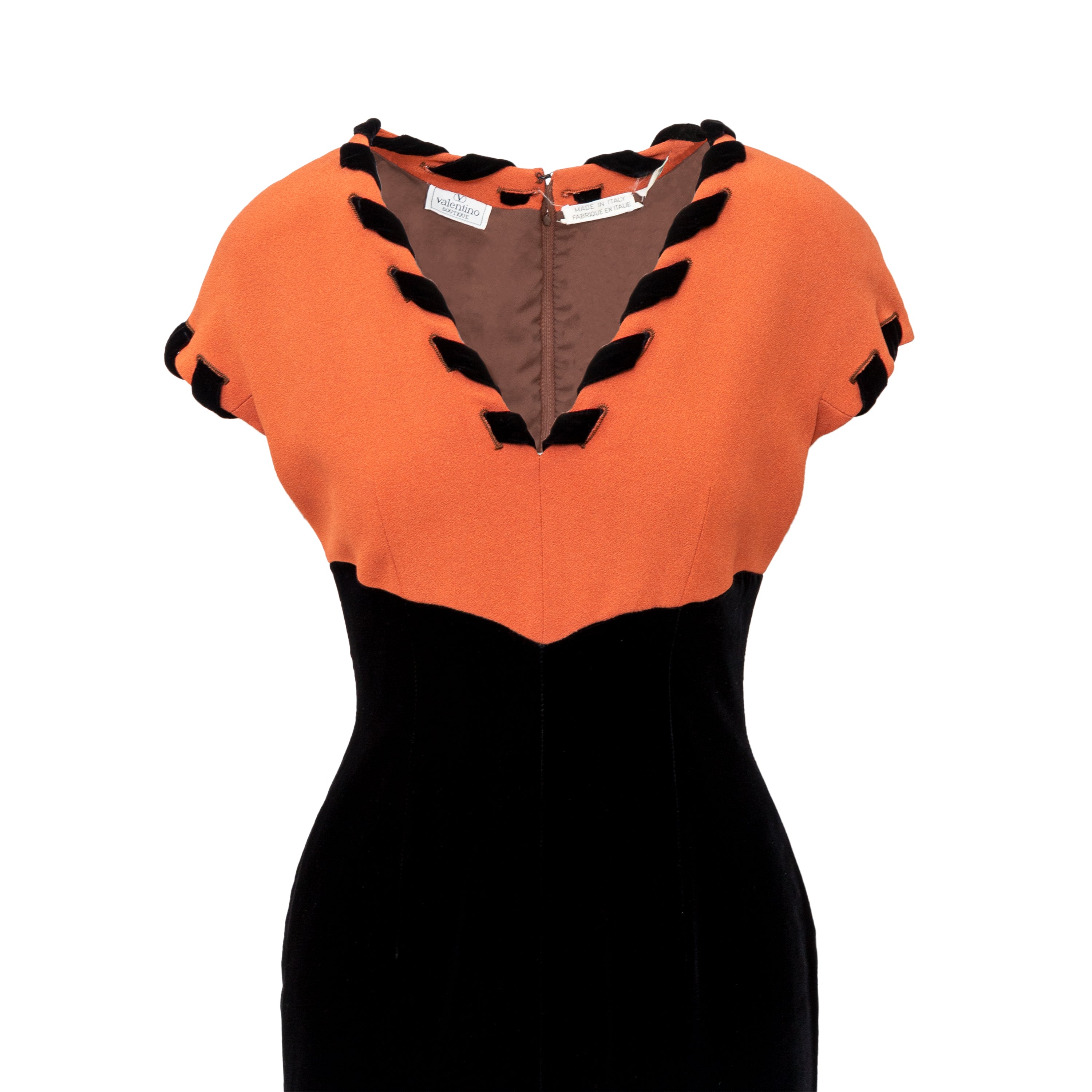 From Autumn Winter 1991 collection, this Valentino Boutique Velvet Dress features a fitted silhouette and a velvet lower part with a contrasting orange upper. The V-neck and short sleeves add a touch of elegance, while the hidden zip on the back ensures a smooth, seamless look.