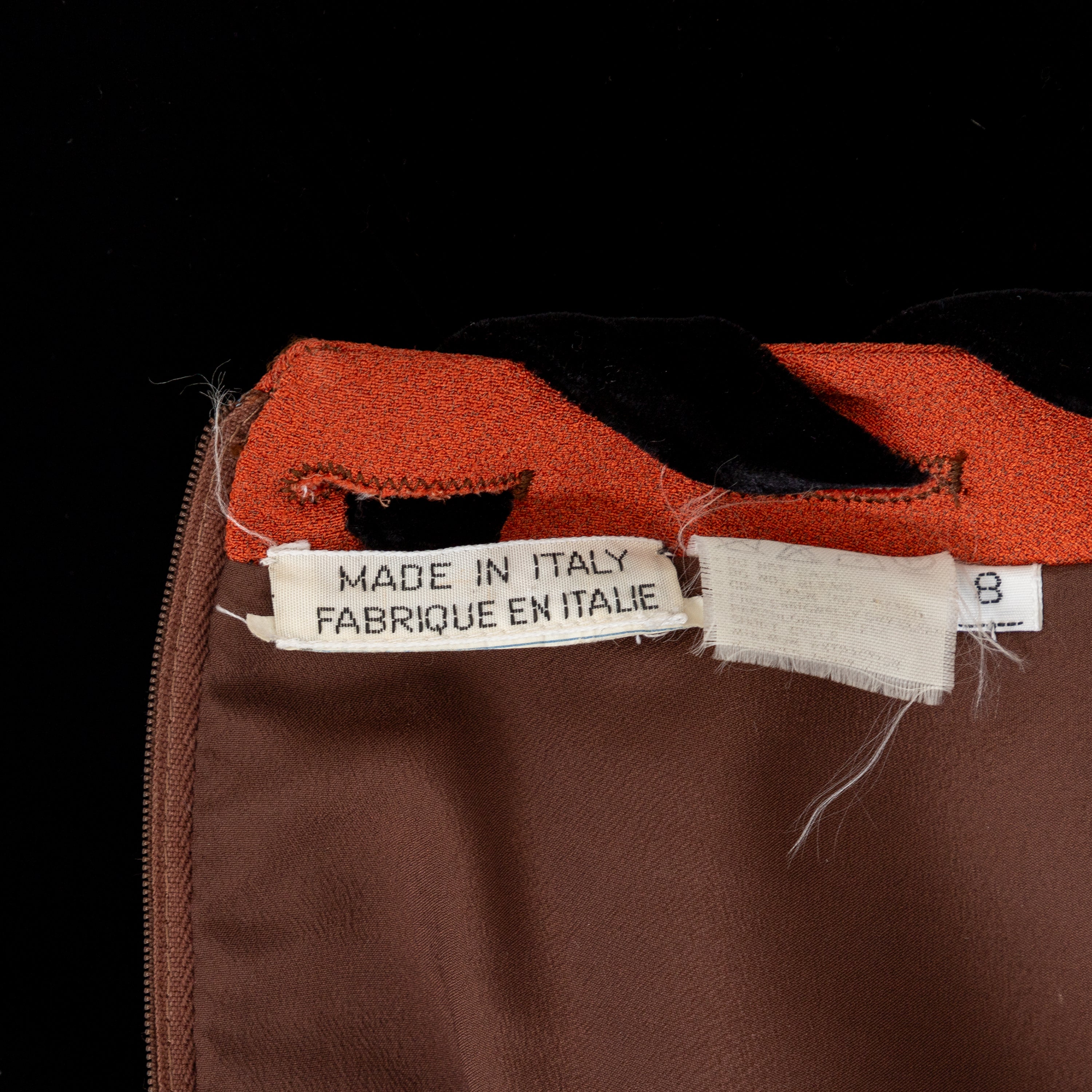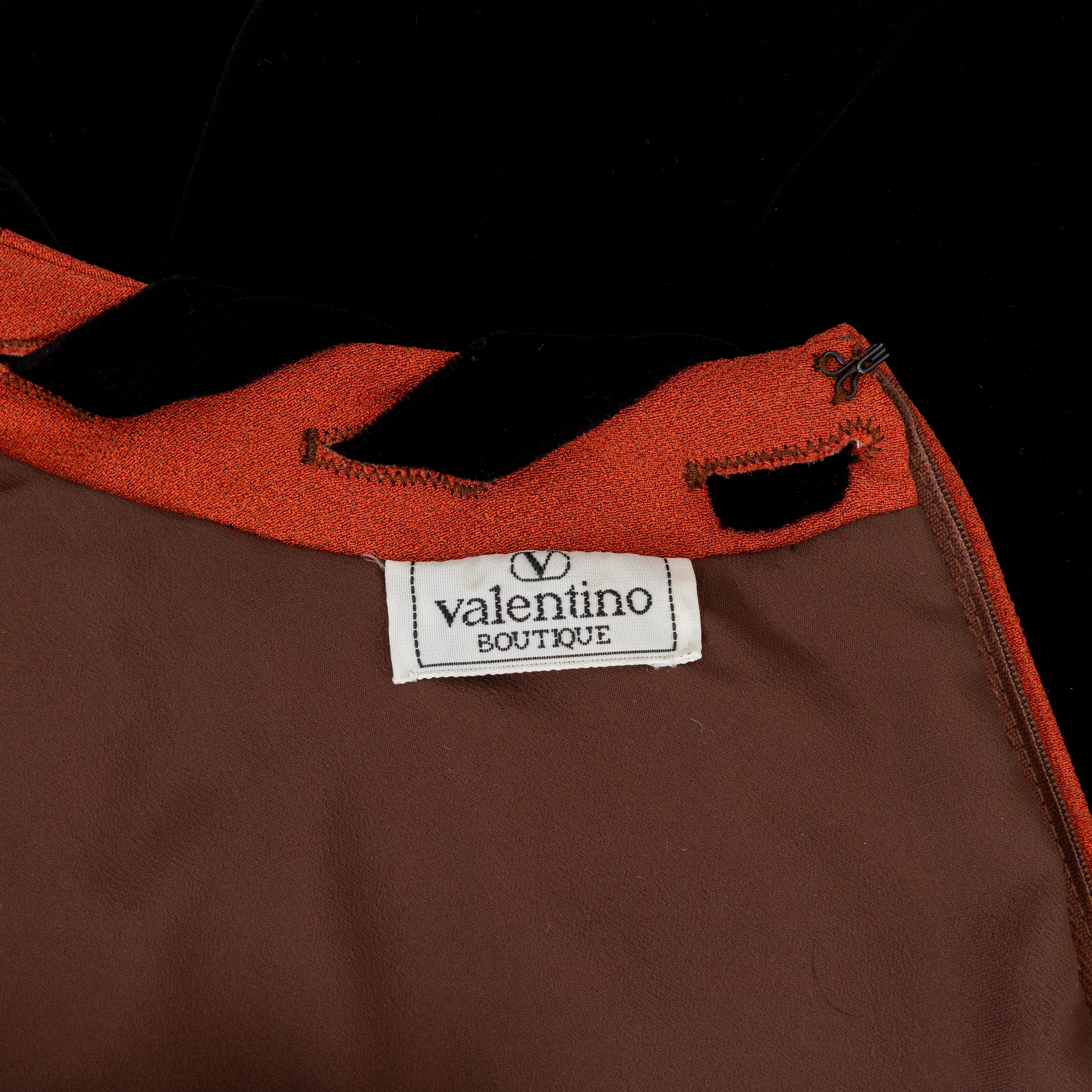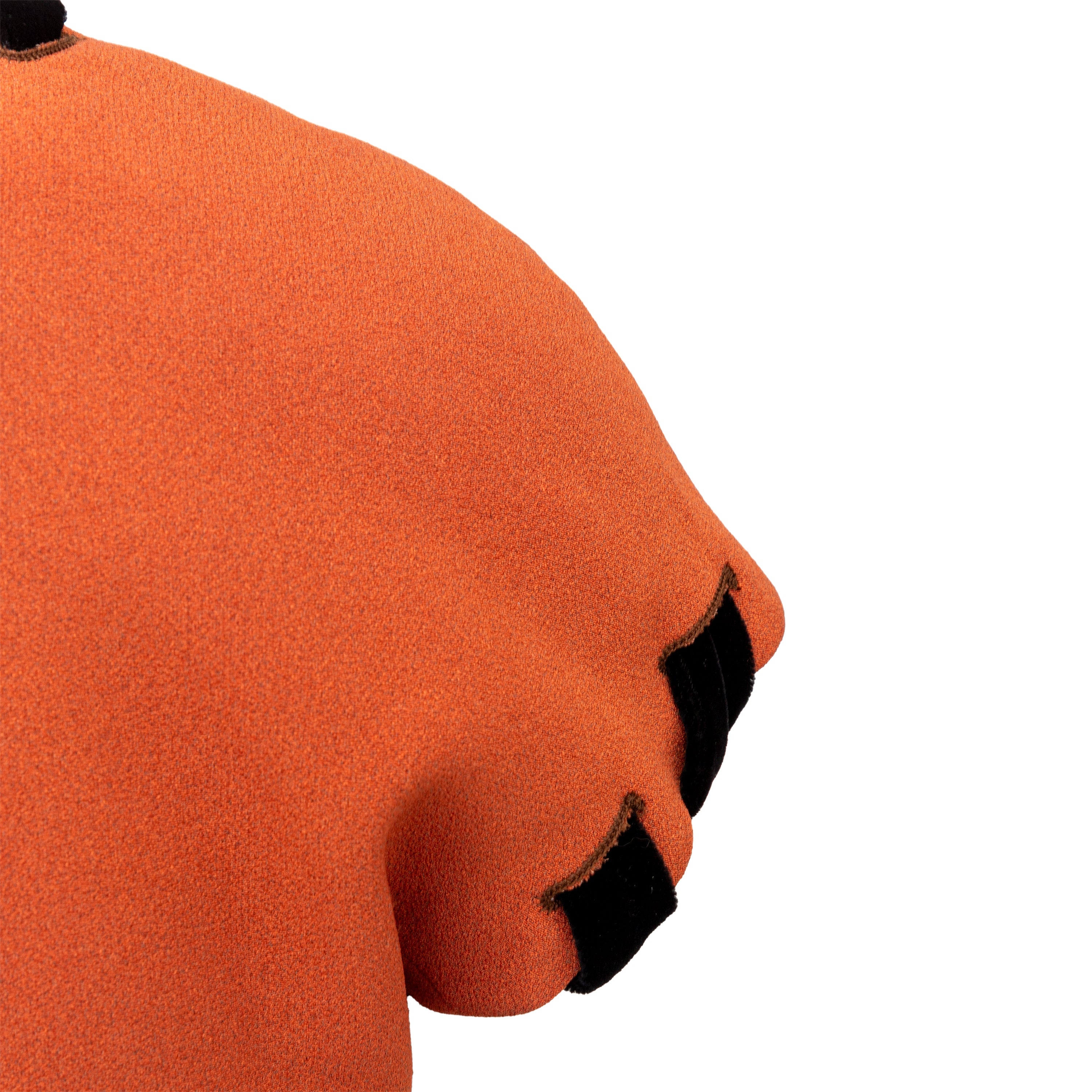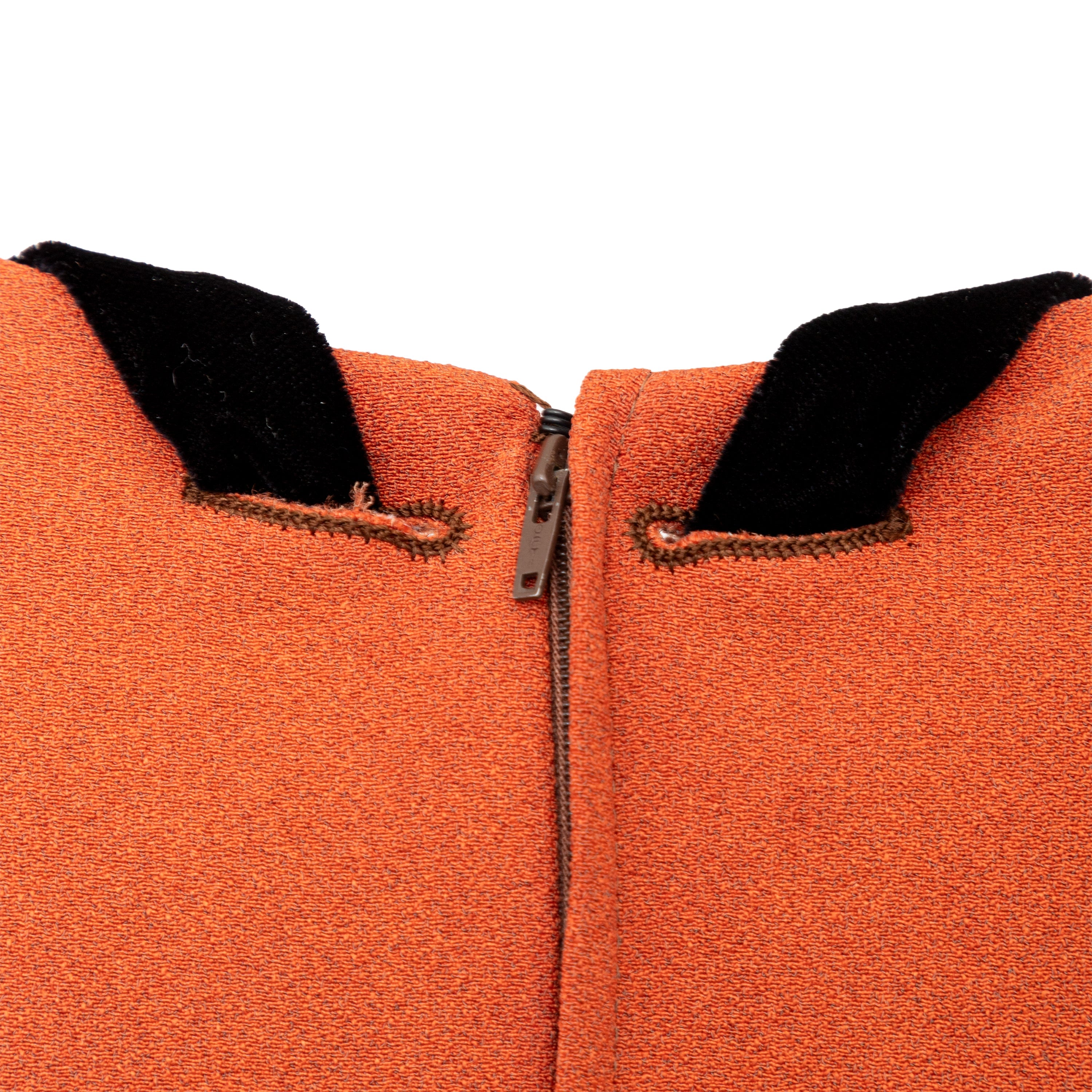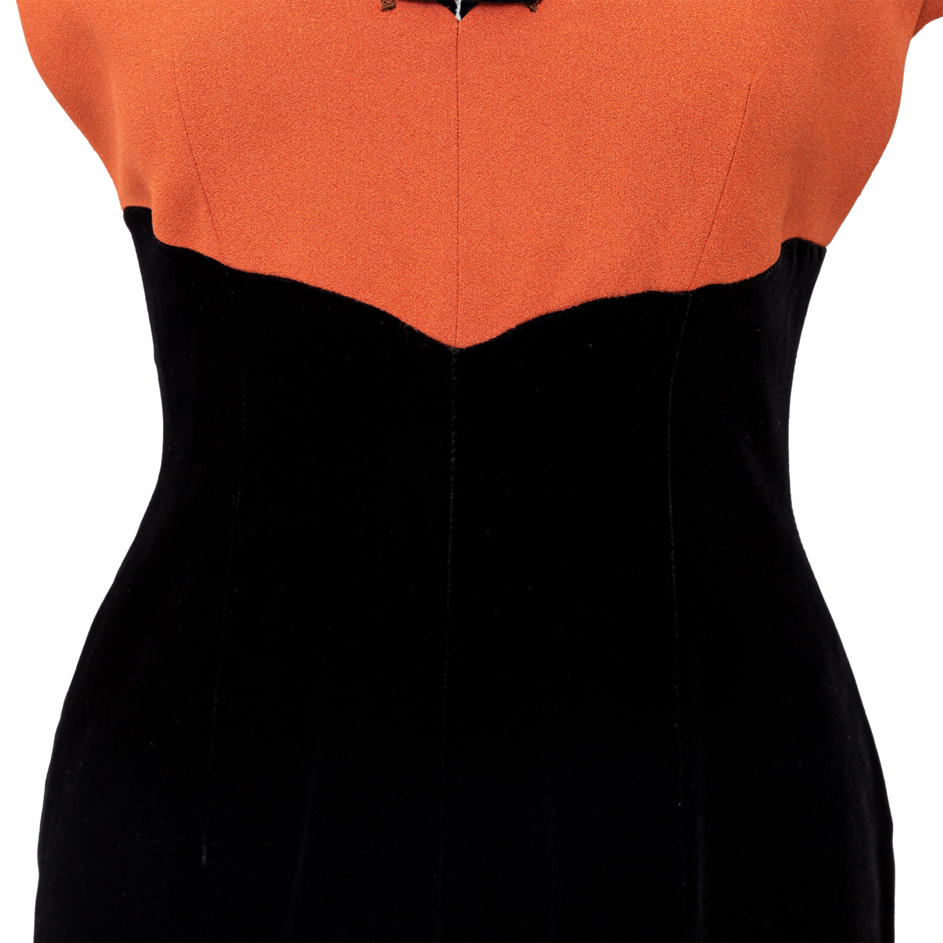 From Autumn Winter 1991 collection, this Valentino Boutique Velvet Dress features a fitted silhouette and a velvet lower part with a contrasting orange upper. The V-neck and short sleeves add a touch of elegance, while the hidden zip on the back ensures a smooth, seamless look.