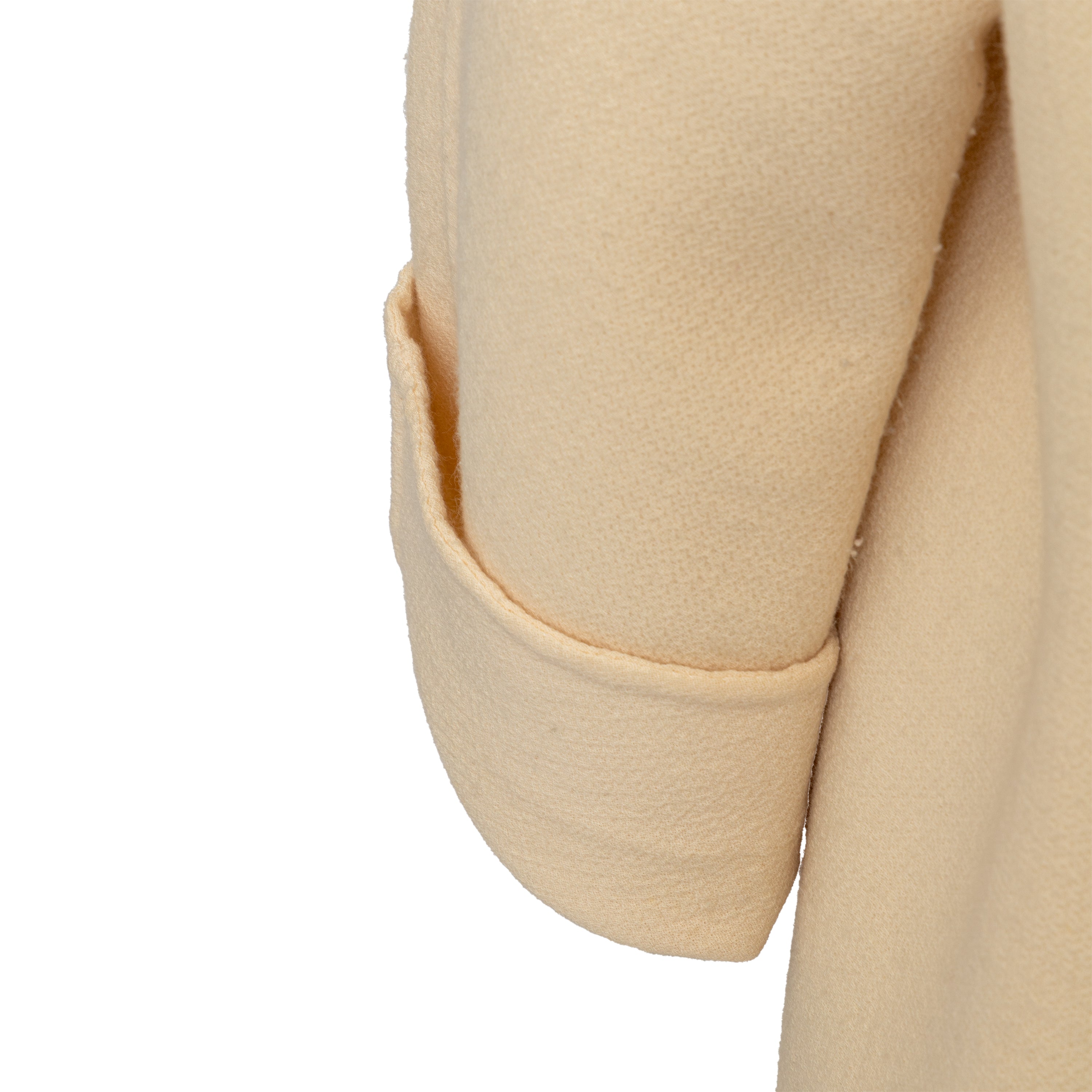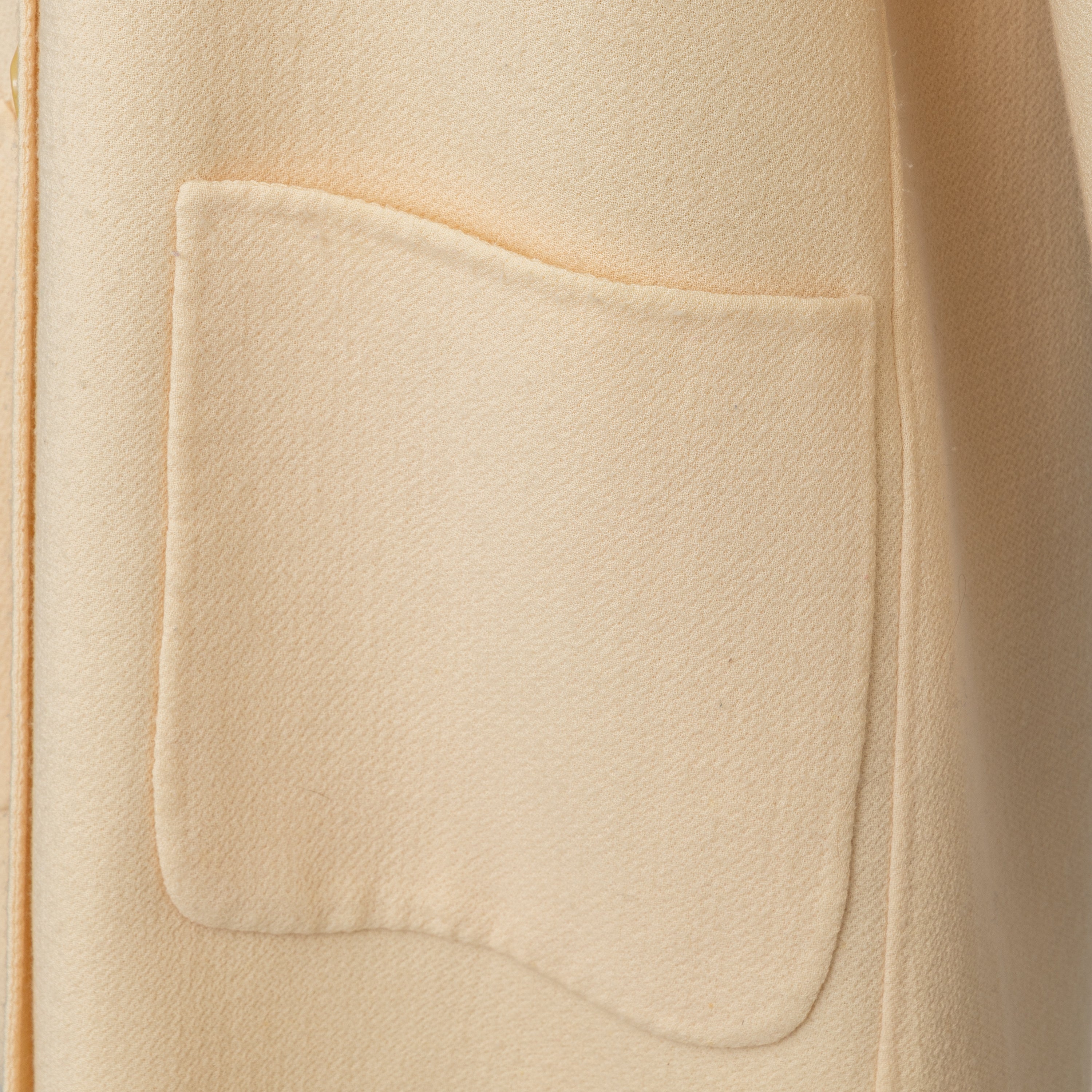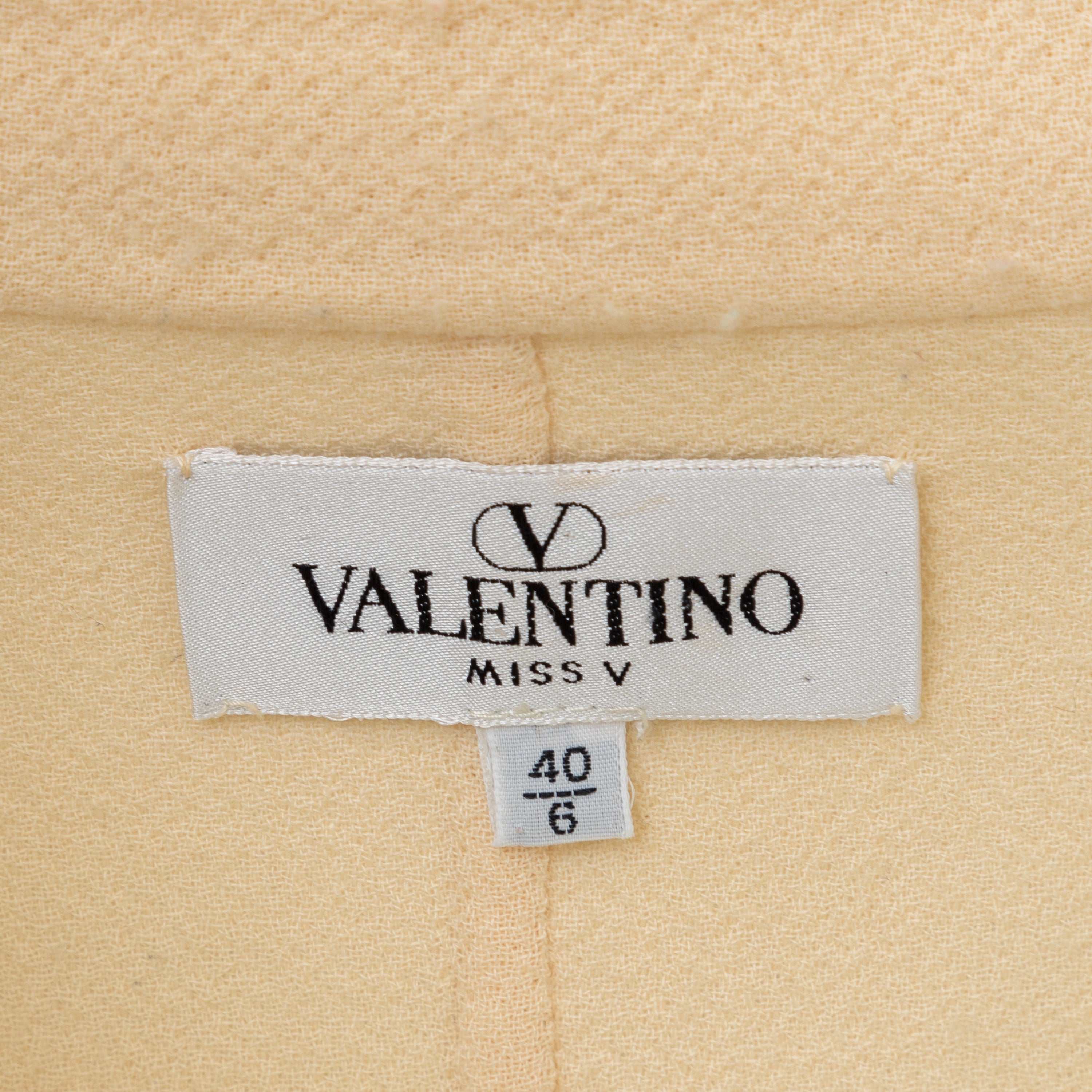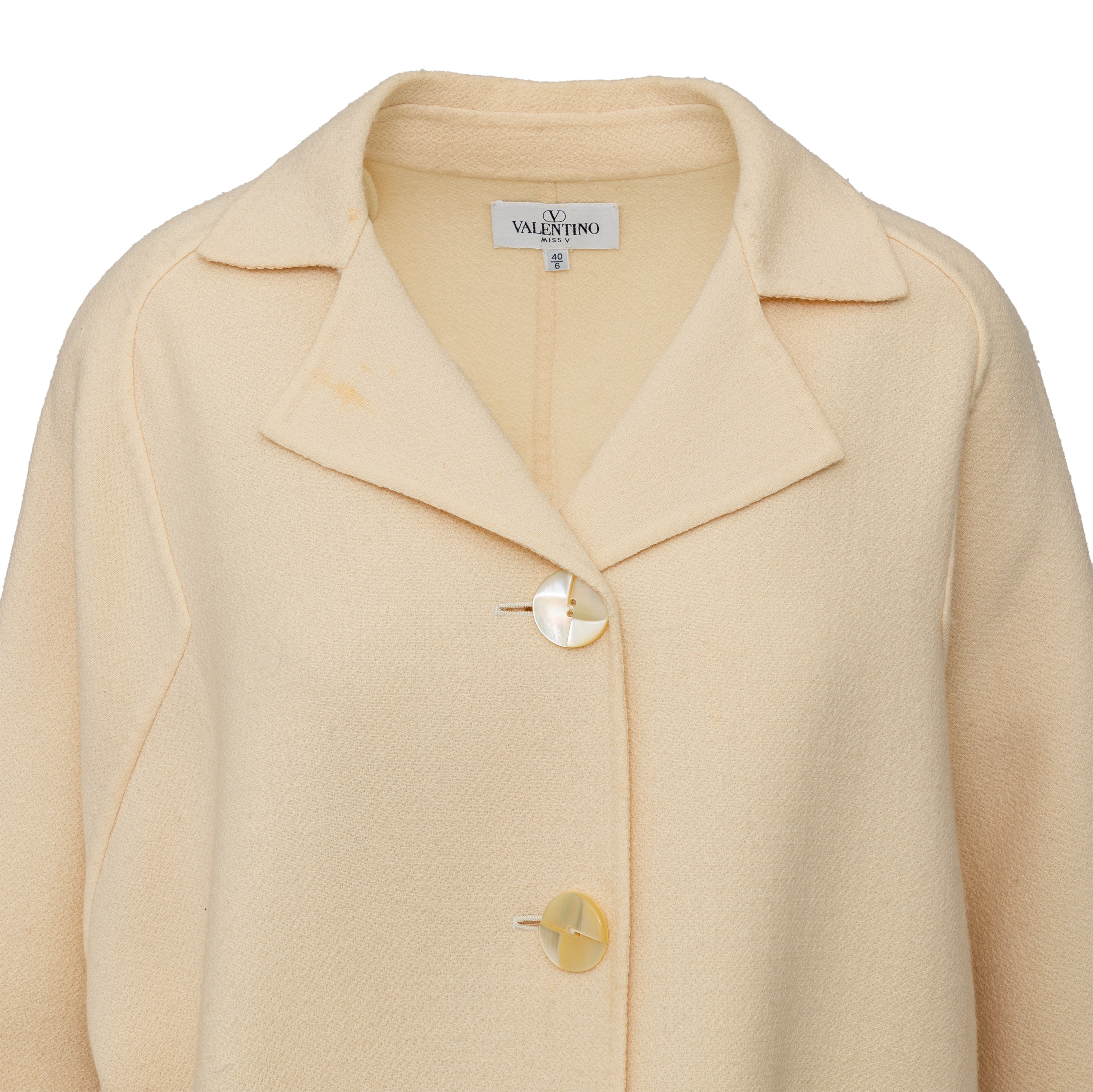 This vintage Valentino wool coat from the 90s Miss V label features a long fit. With a front button closure and two front patch pockets, it's both fashionable and functional. The sleeve hem can also be folded to add personal style. In a classic off white color, this coat is a must-have for any wardrobe.