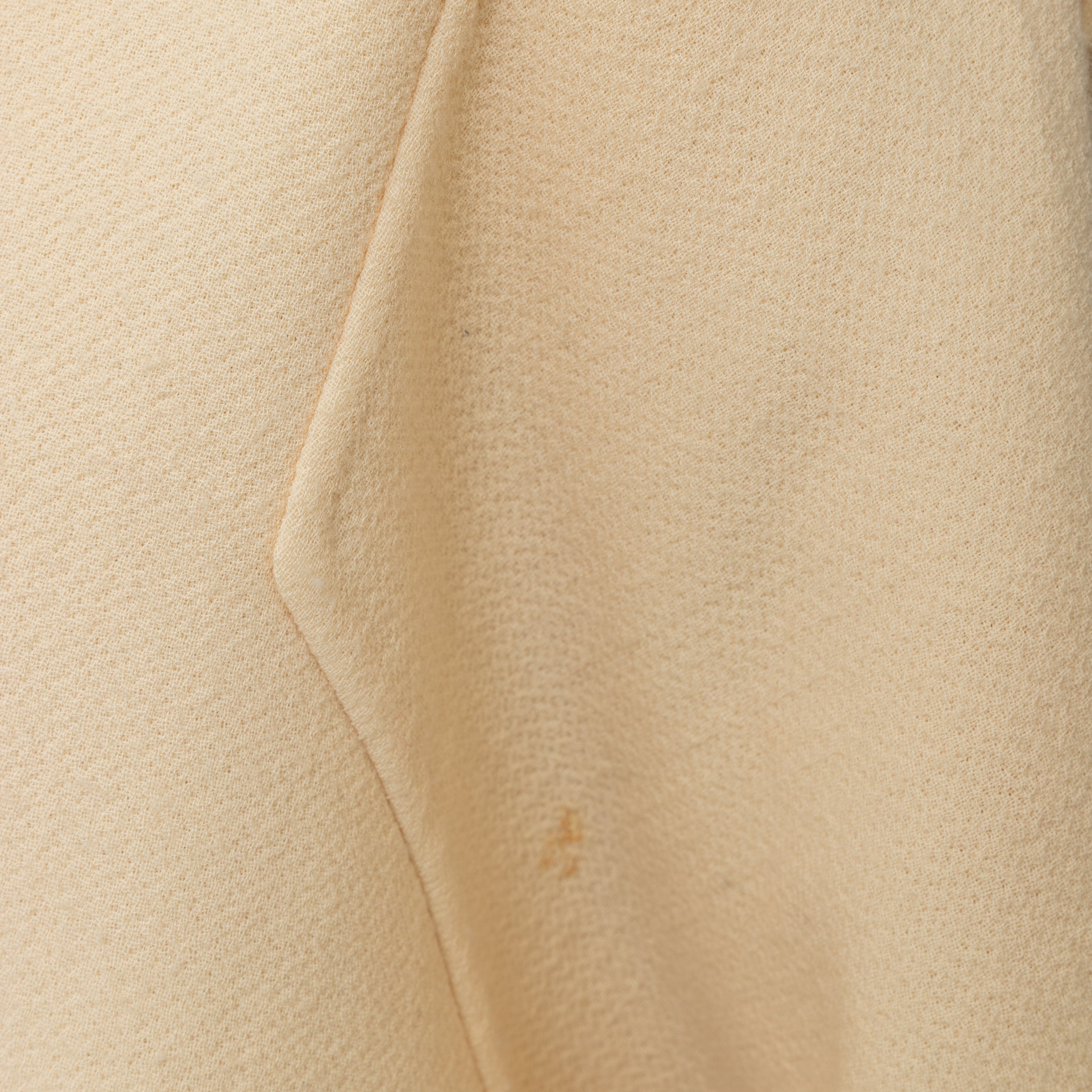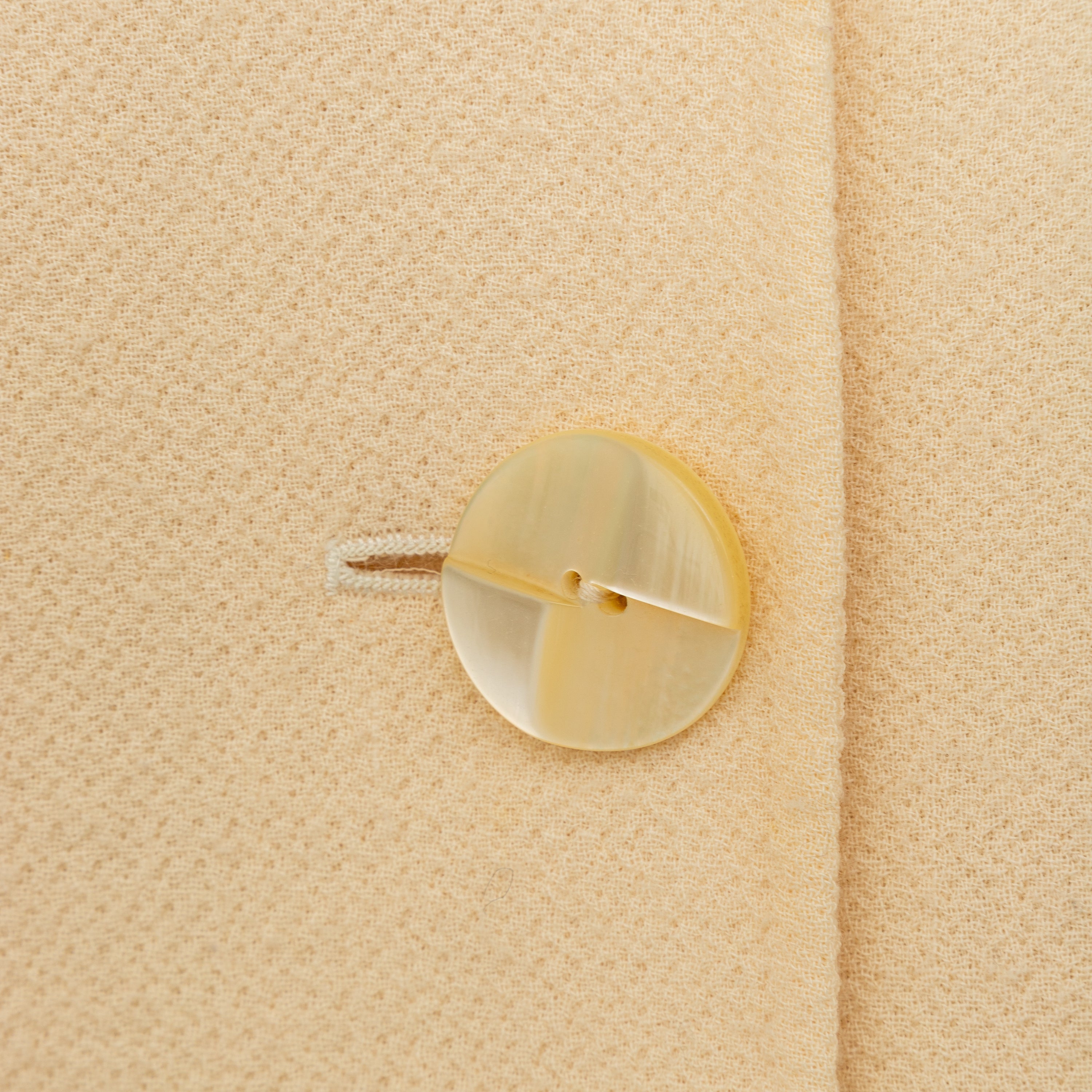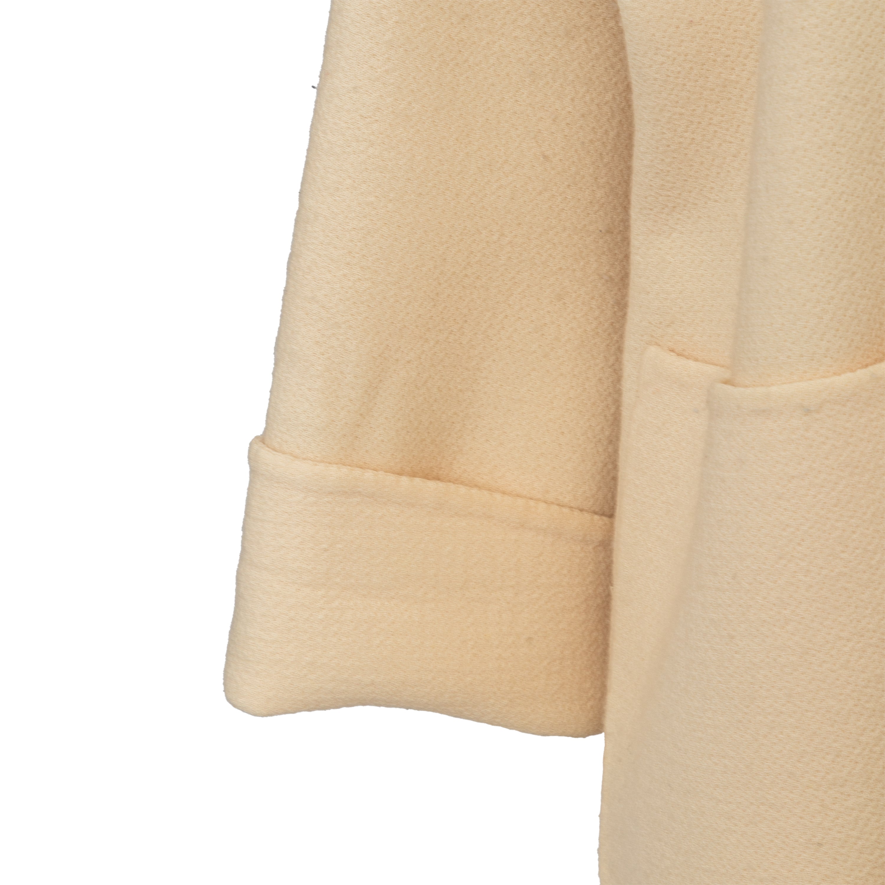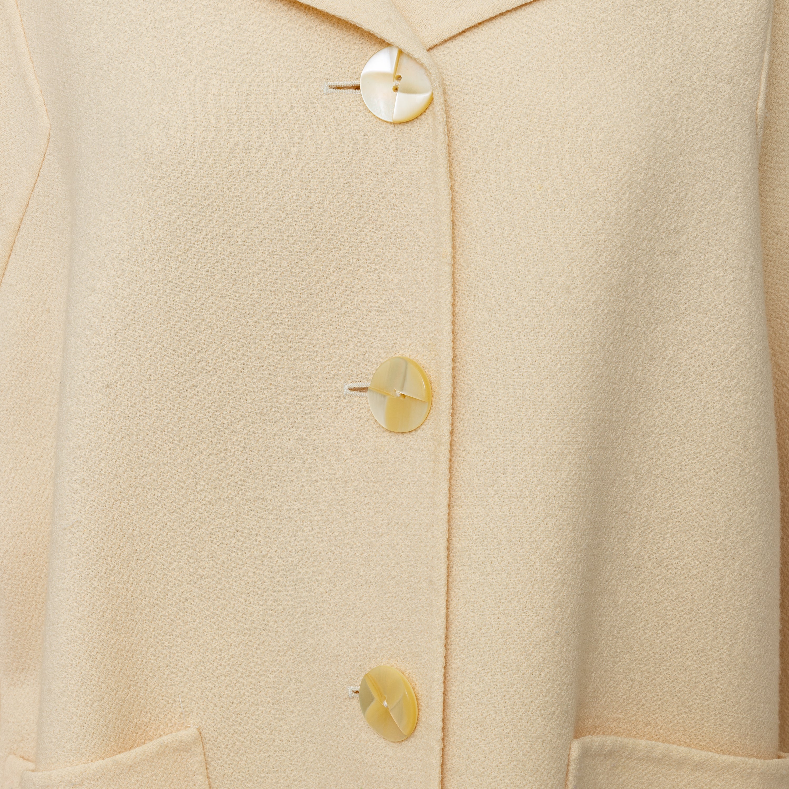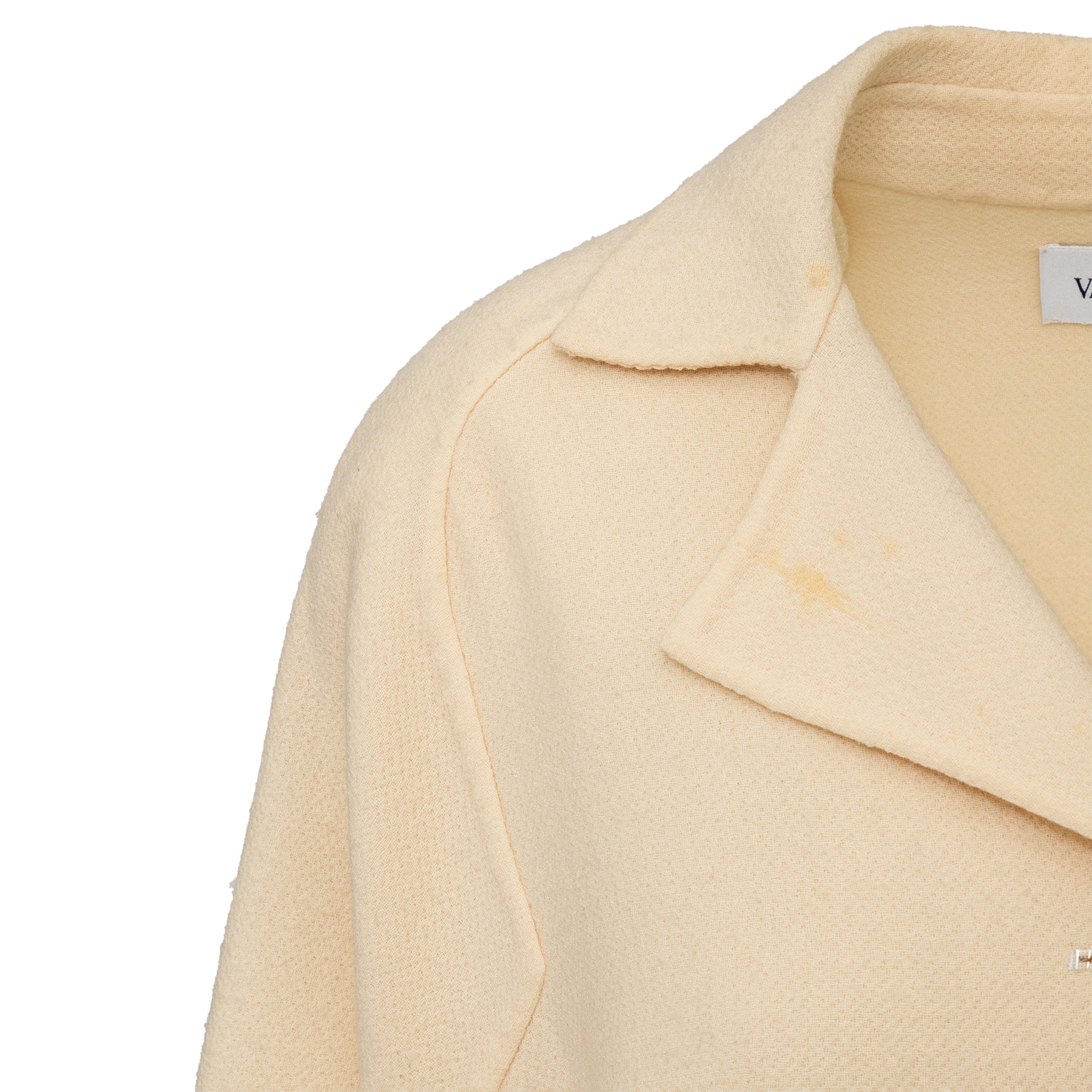 This vintage Valentino wool coat from the 90s Miss V label features a long fit. With a front button closure and two front patch pockets, it's both fashionable and functional. The sleeve hem can also be folded to add personal style. In a classic off white color, this coat is a must-have for any wardrobe.