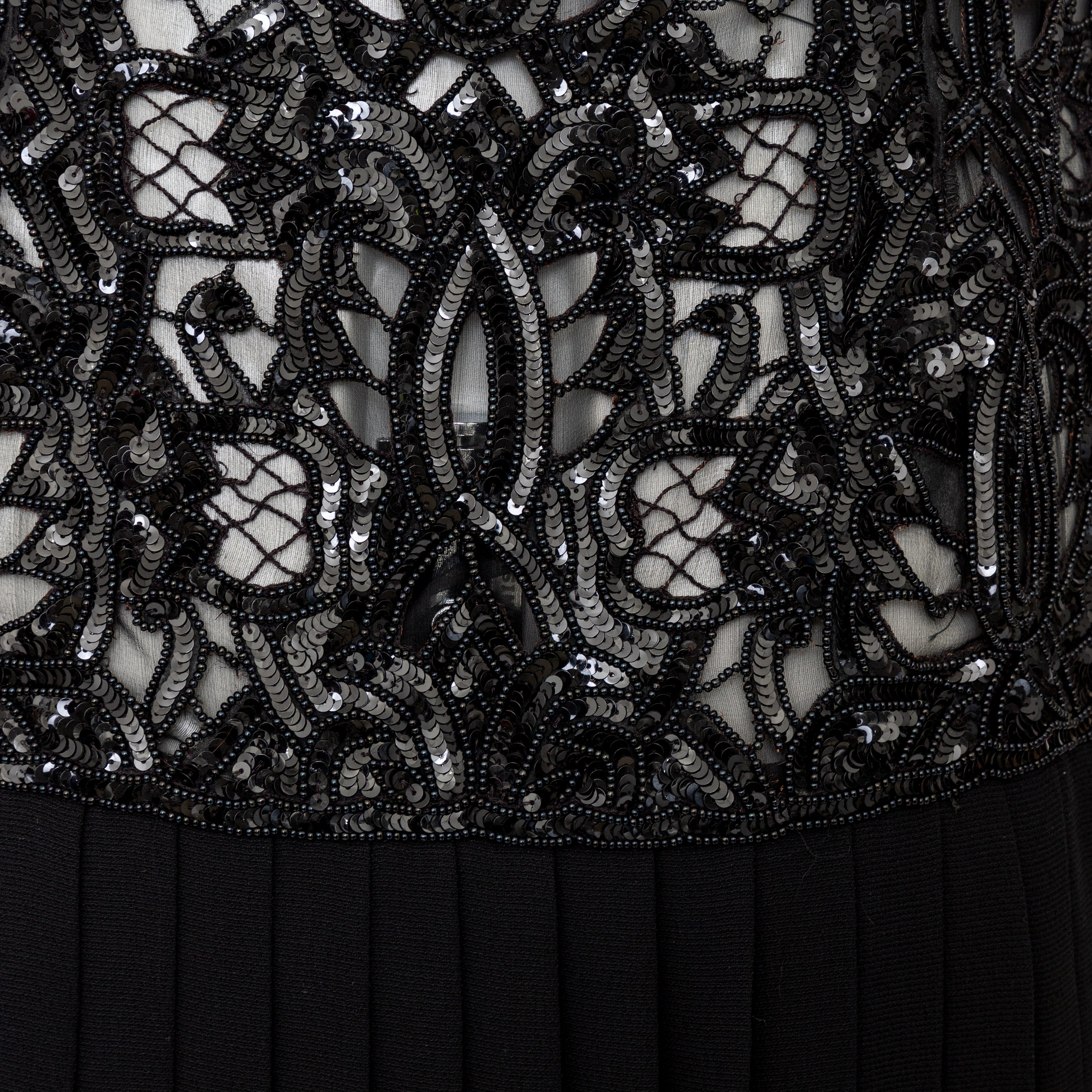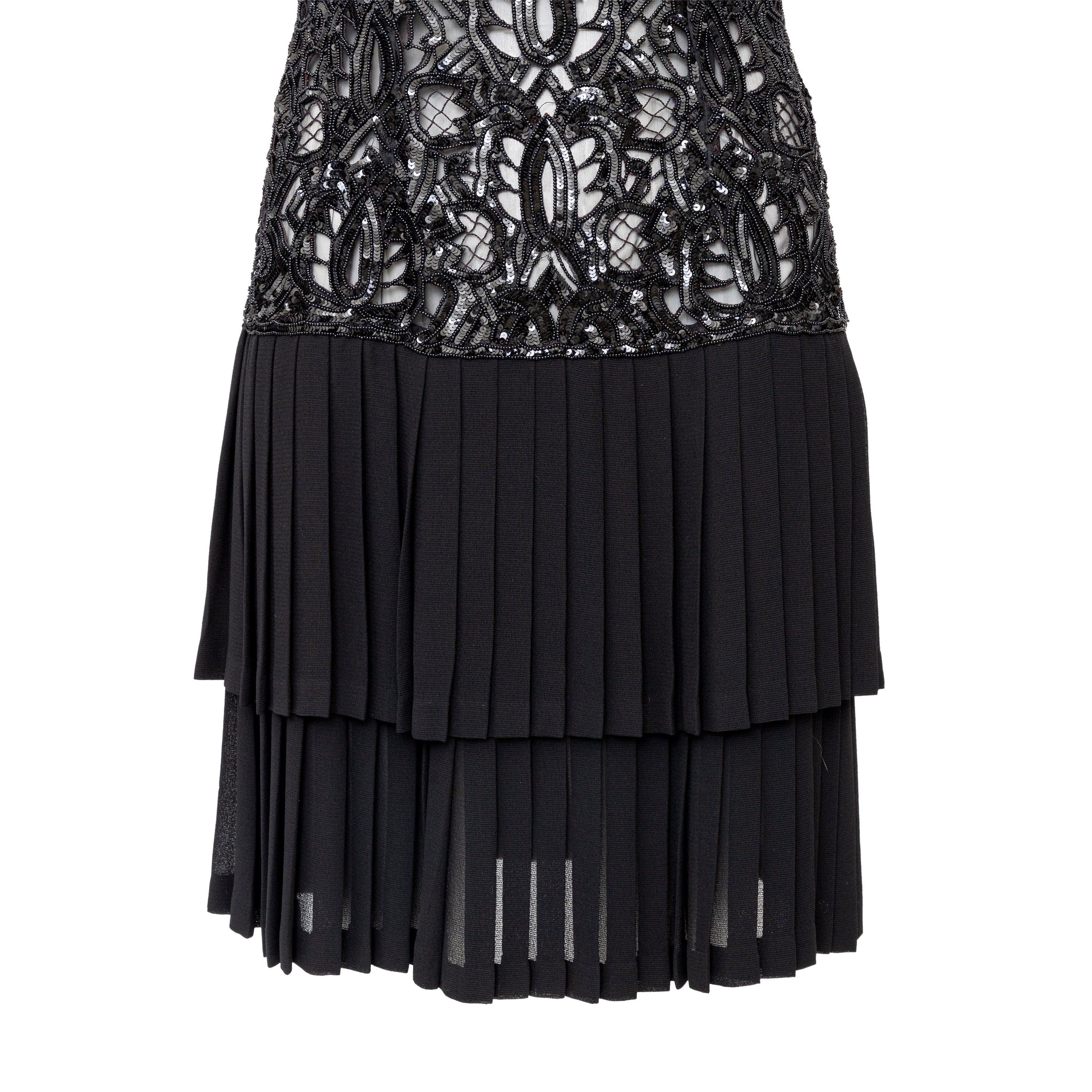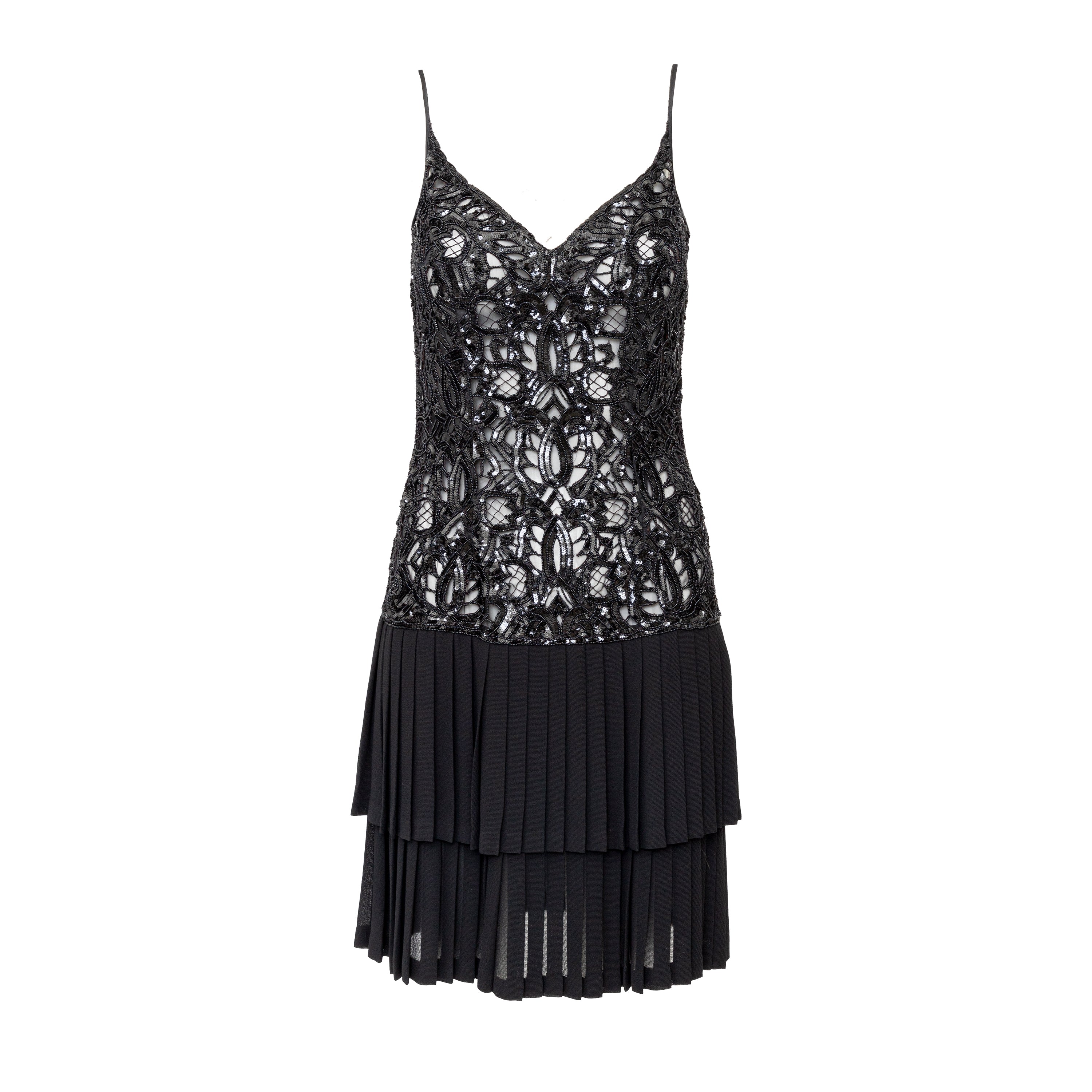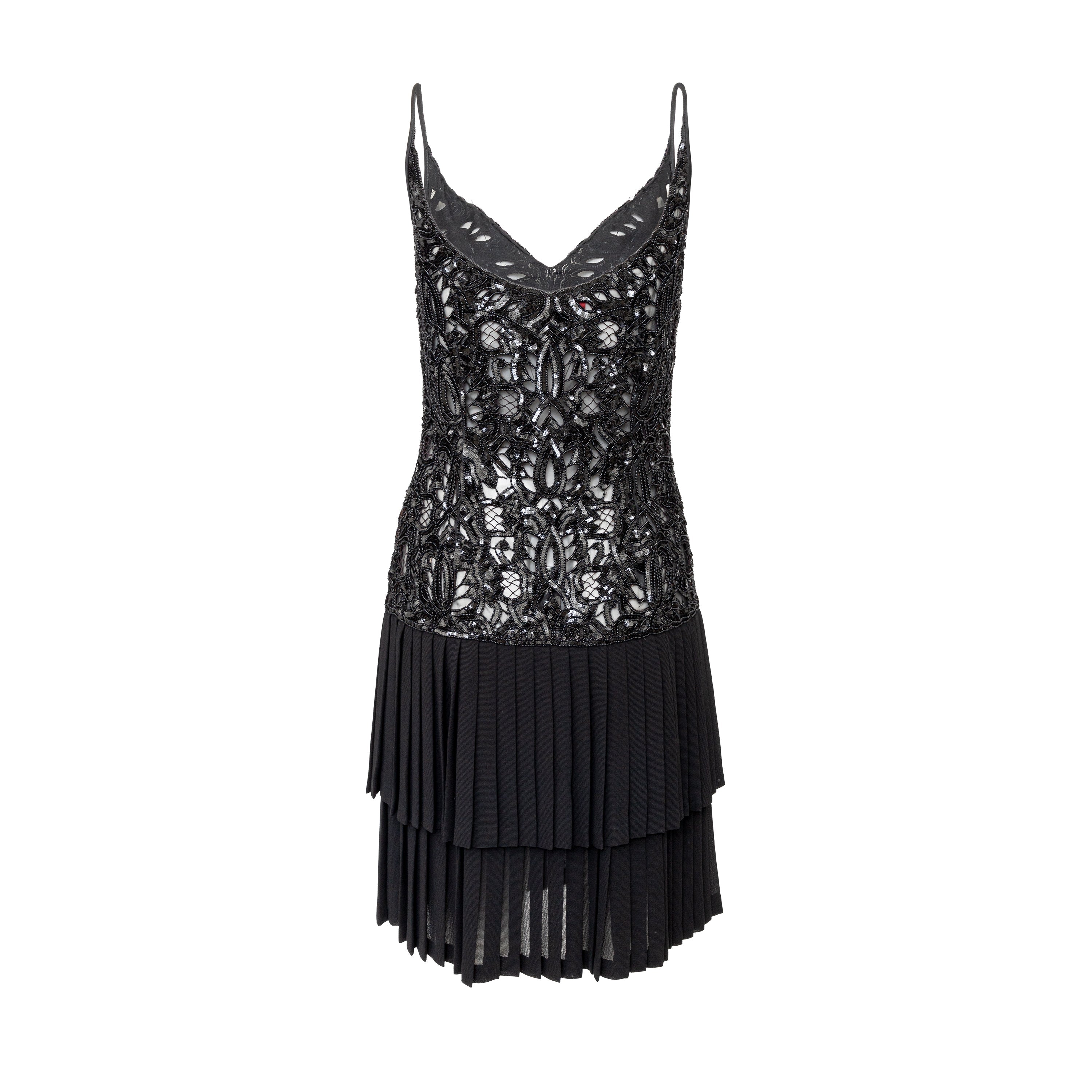 Effortlessly elegant, the Valentino Night Beaded Dress from the 90s collection features delicate sequin and bead detailing on the upper and a heavy silk viscose blend fabric with layered accordion pleats on the lower portion. With a v-neck and thin straps, this dress will make a statement at any event.