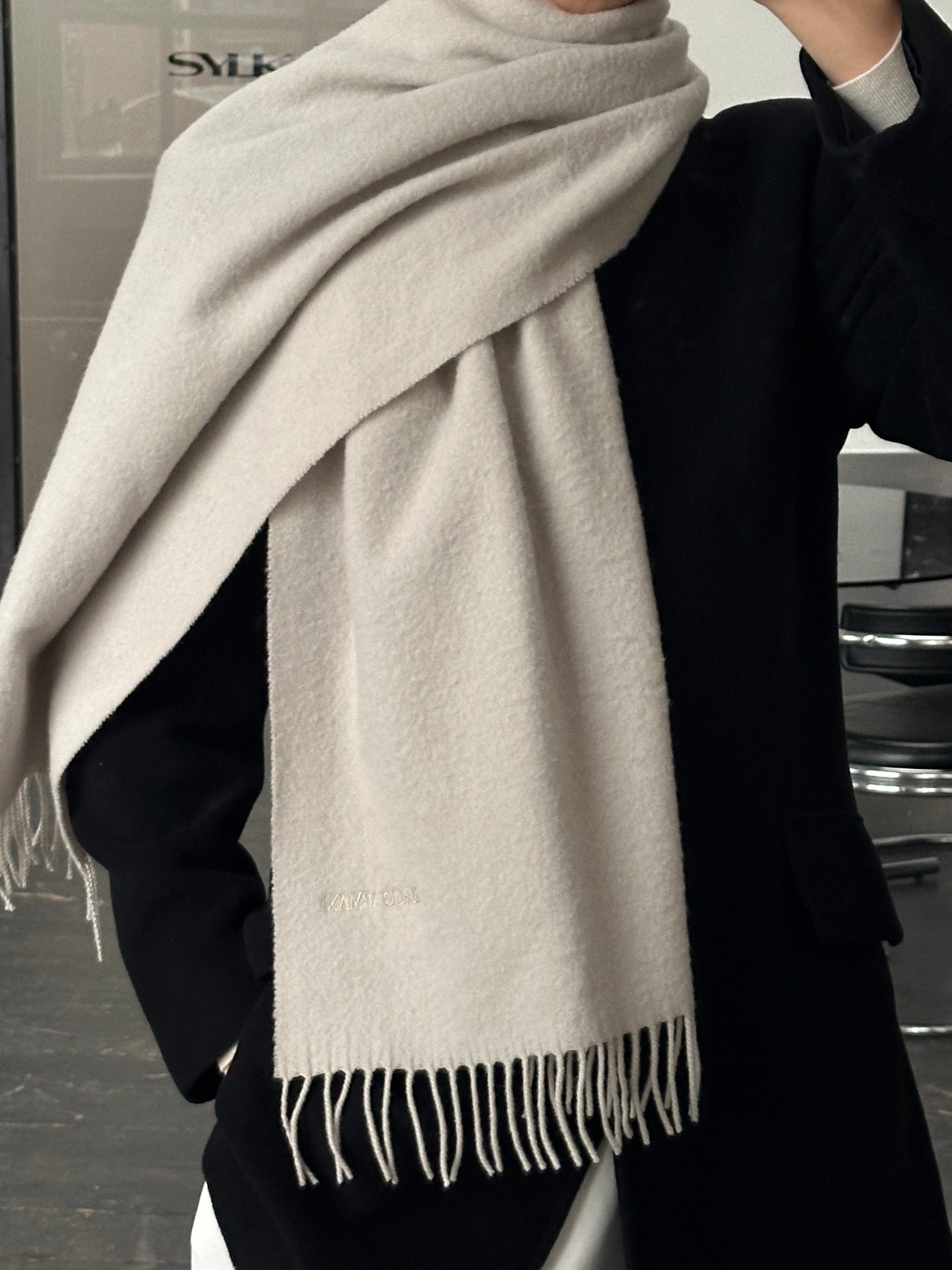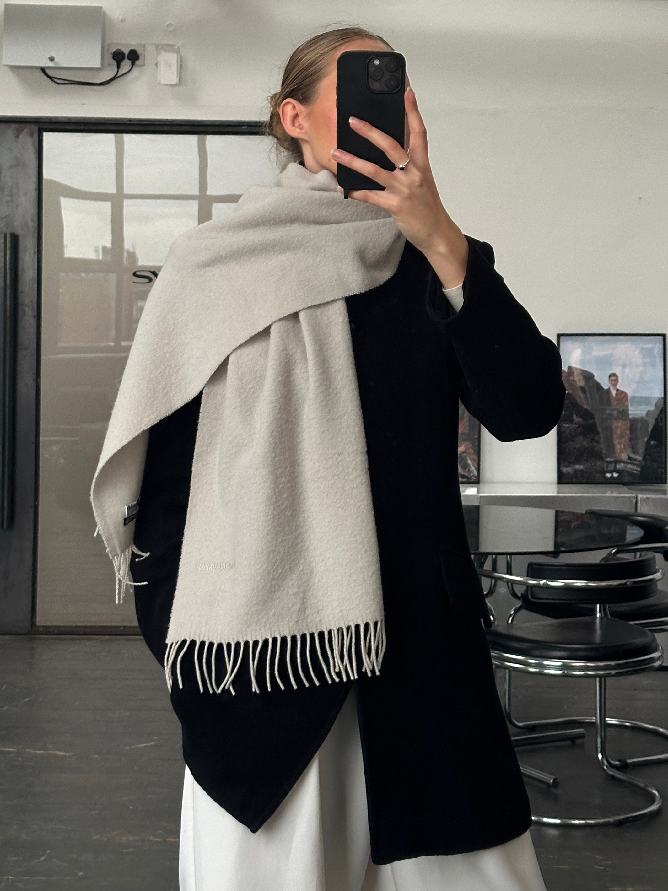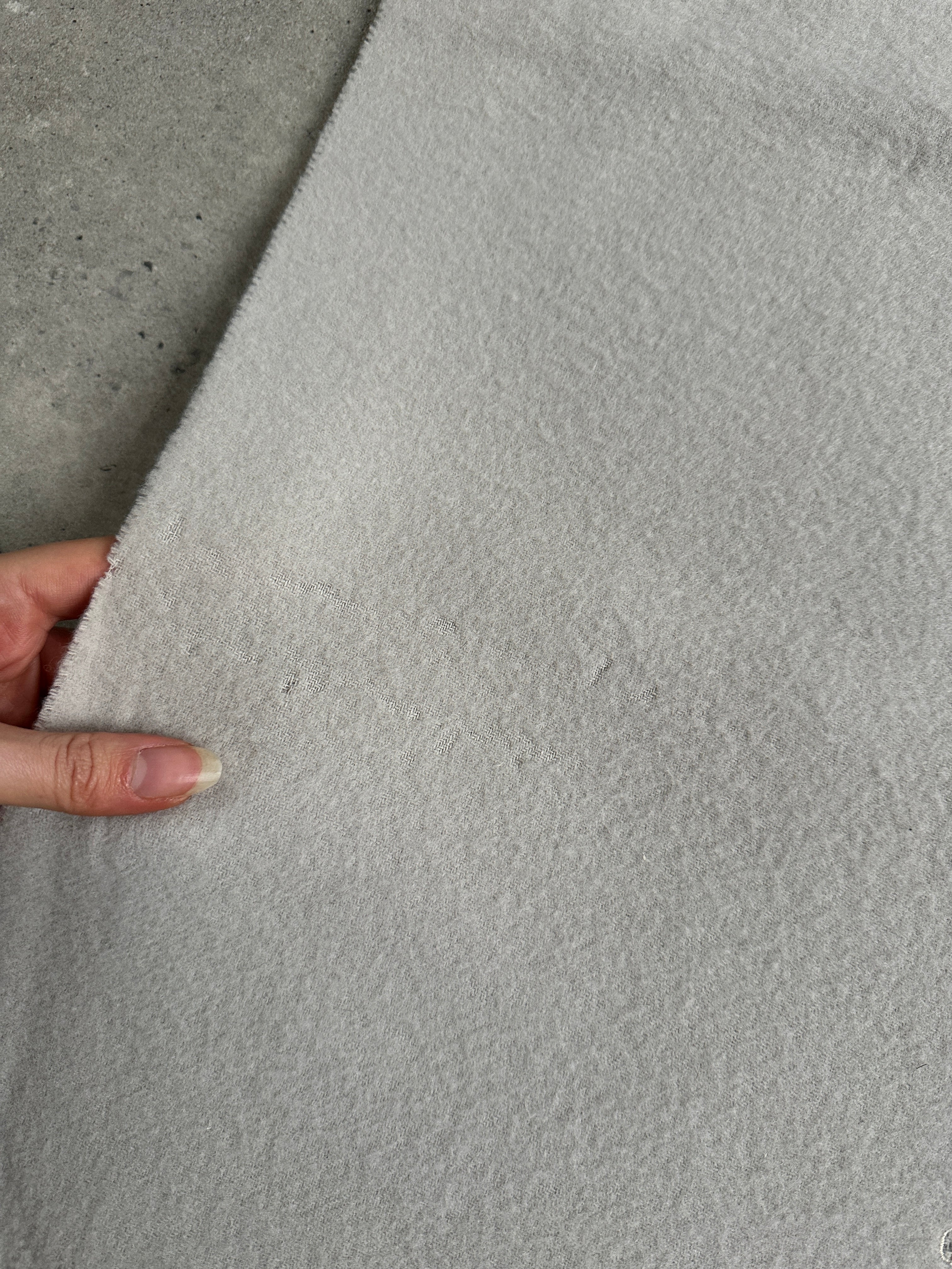 A vintage 1990s Giorgio Armani Le Collezioni scarf in a soft light grey wool with subtle embroidered logo detailing. A refined accessory presented boxed that reflects the brand’s understated luxury approach.
