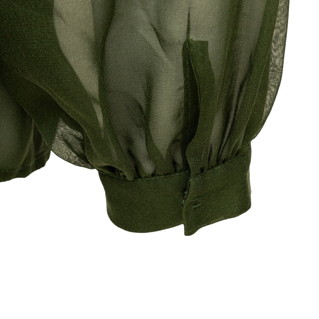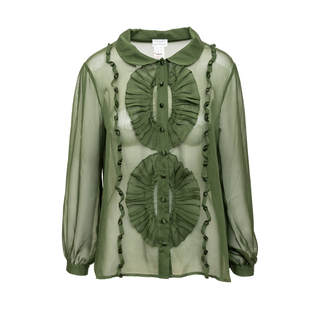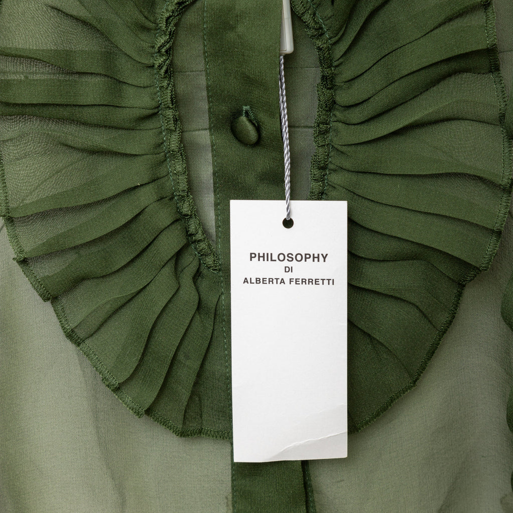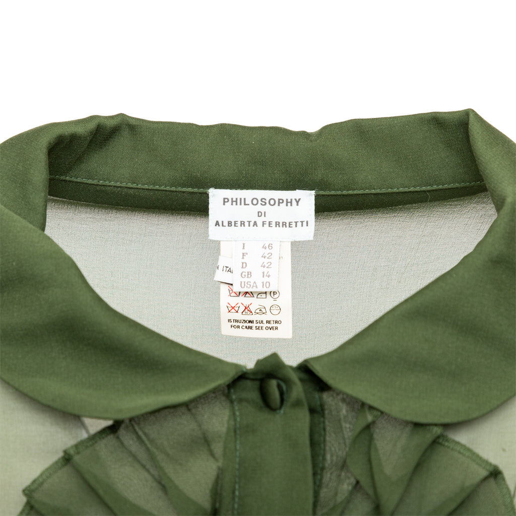 Semi sheer silk shirt in a moss green color from Philosophy di Alberta Ferretti label. Round pleated fans adorn the front of this beautiful design. Fabric covered buttons and gathering at the sleeve hem add a touch of elegance.