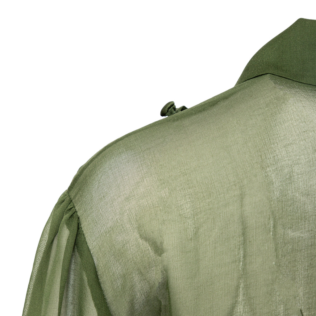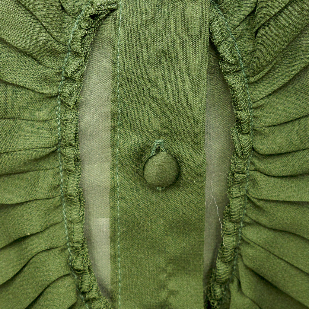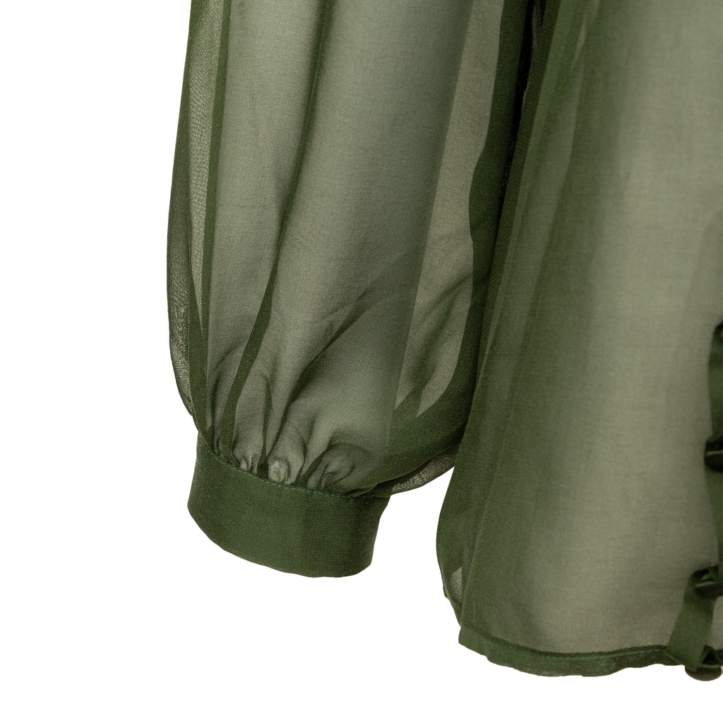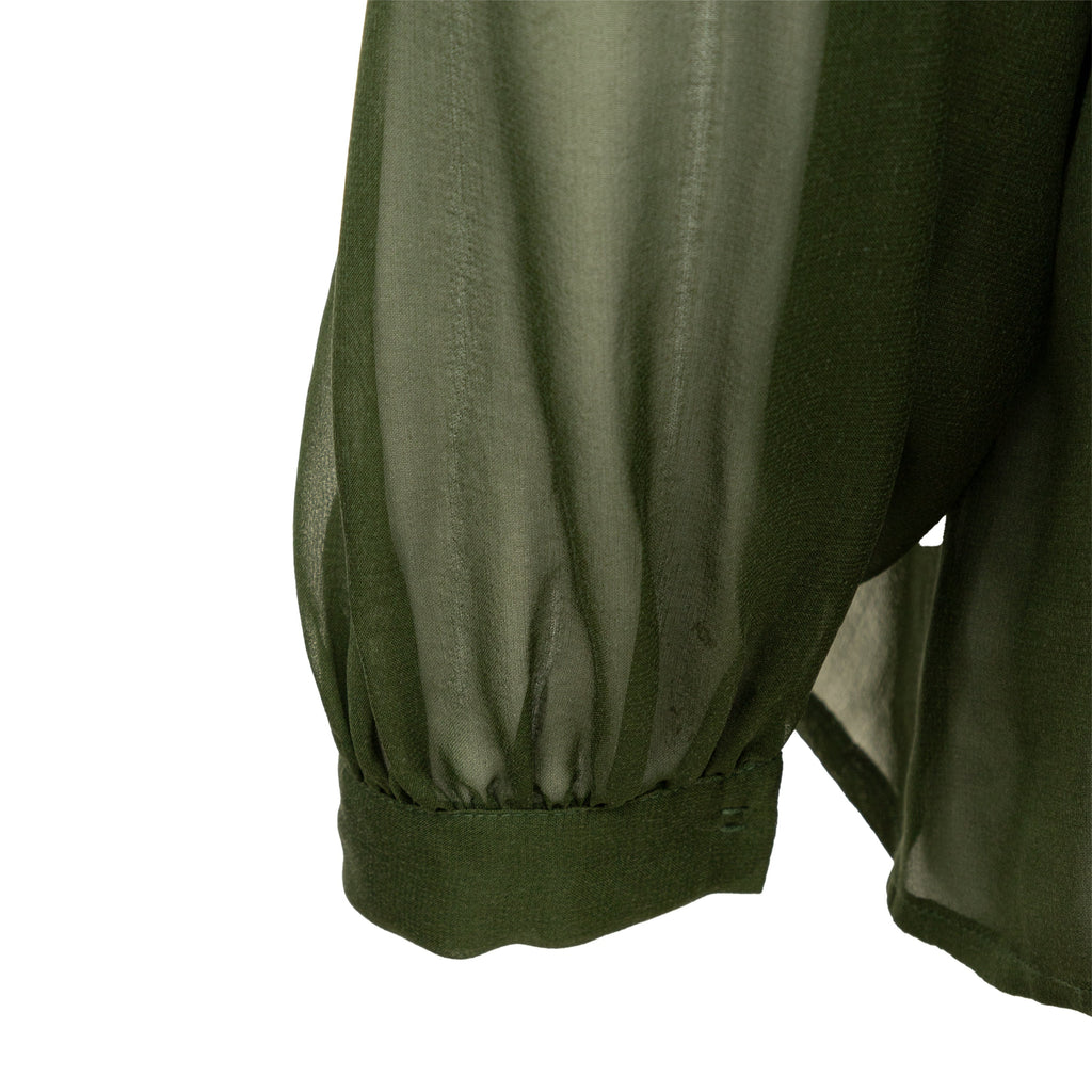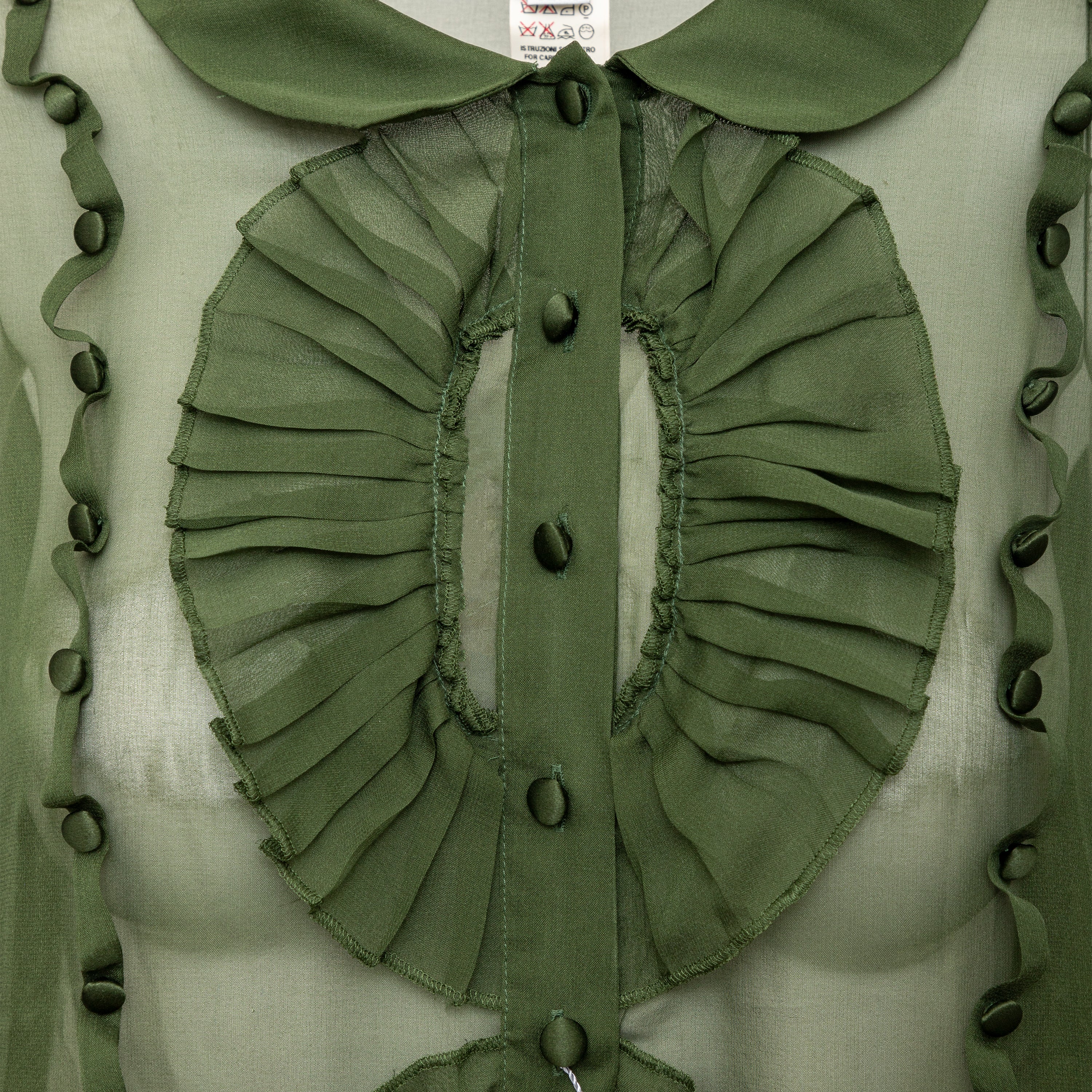 Semi sheer silk shirt in a moss green color from Philosophy di Alberta Ferretti label. Round pleated fans adorn the front of this beautiful design. Fabric covered buttons and gathering at the sleeve hem add a touch of elegance.