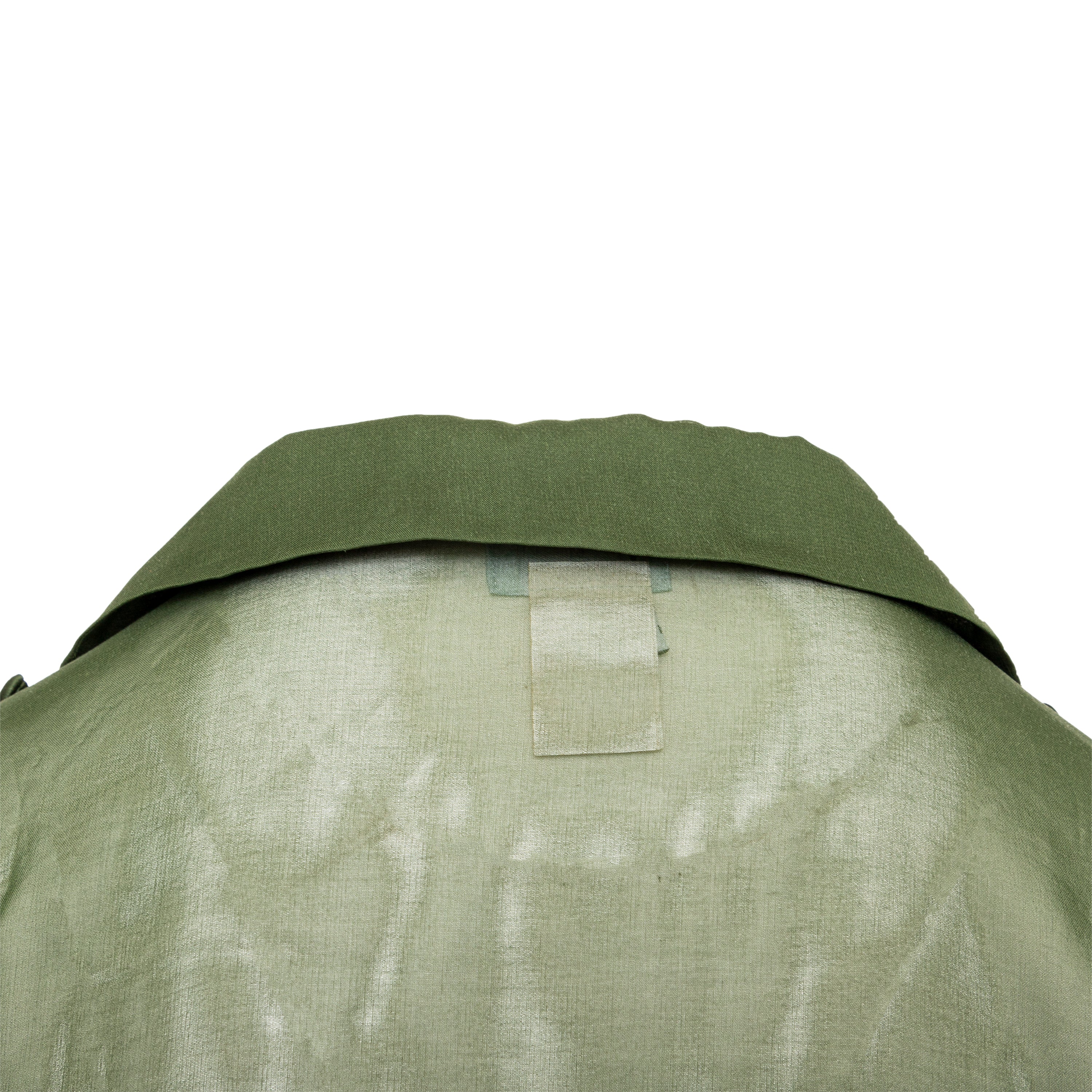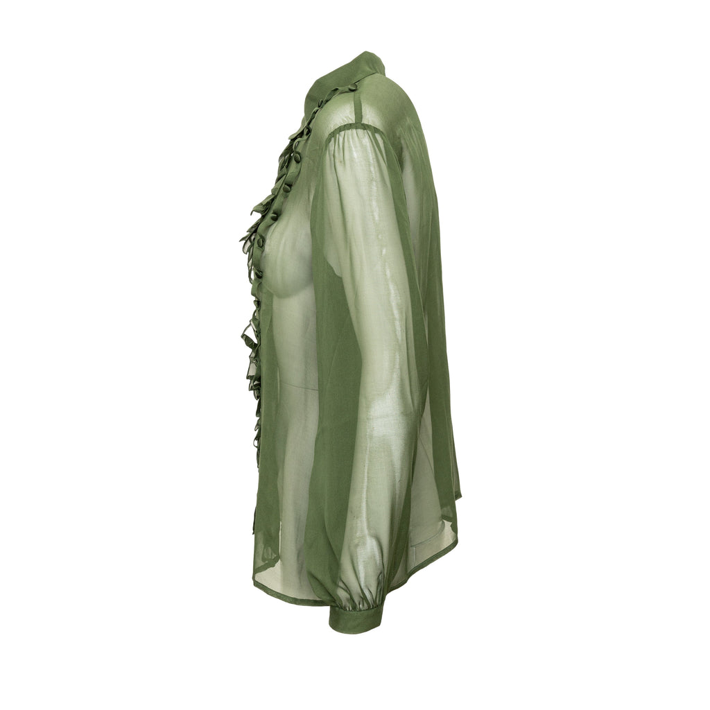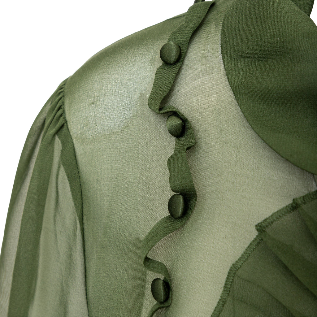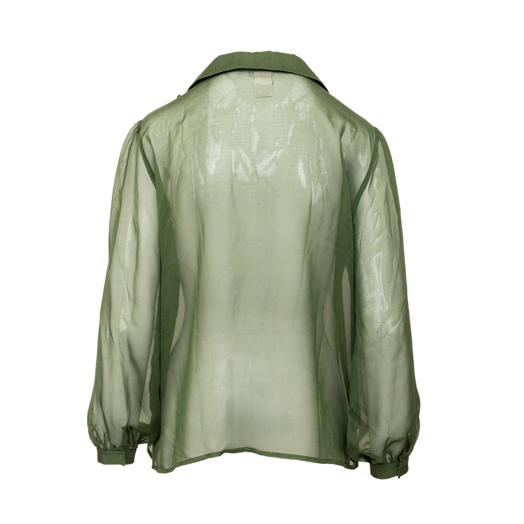 Semi sheer silk shirt in a moss green color from Philosophy di Alberta Ferretti label. Round pleated fans adorn the front of this beautiful design. Fabric covered buttons and gathering at the sleeve hem add a touch of elegance.