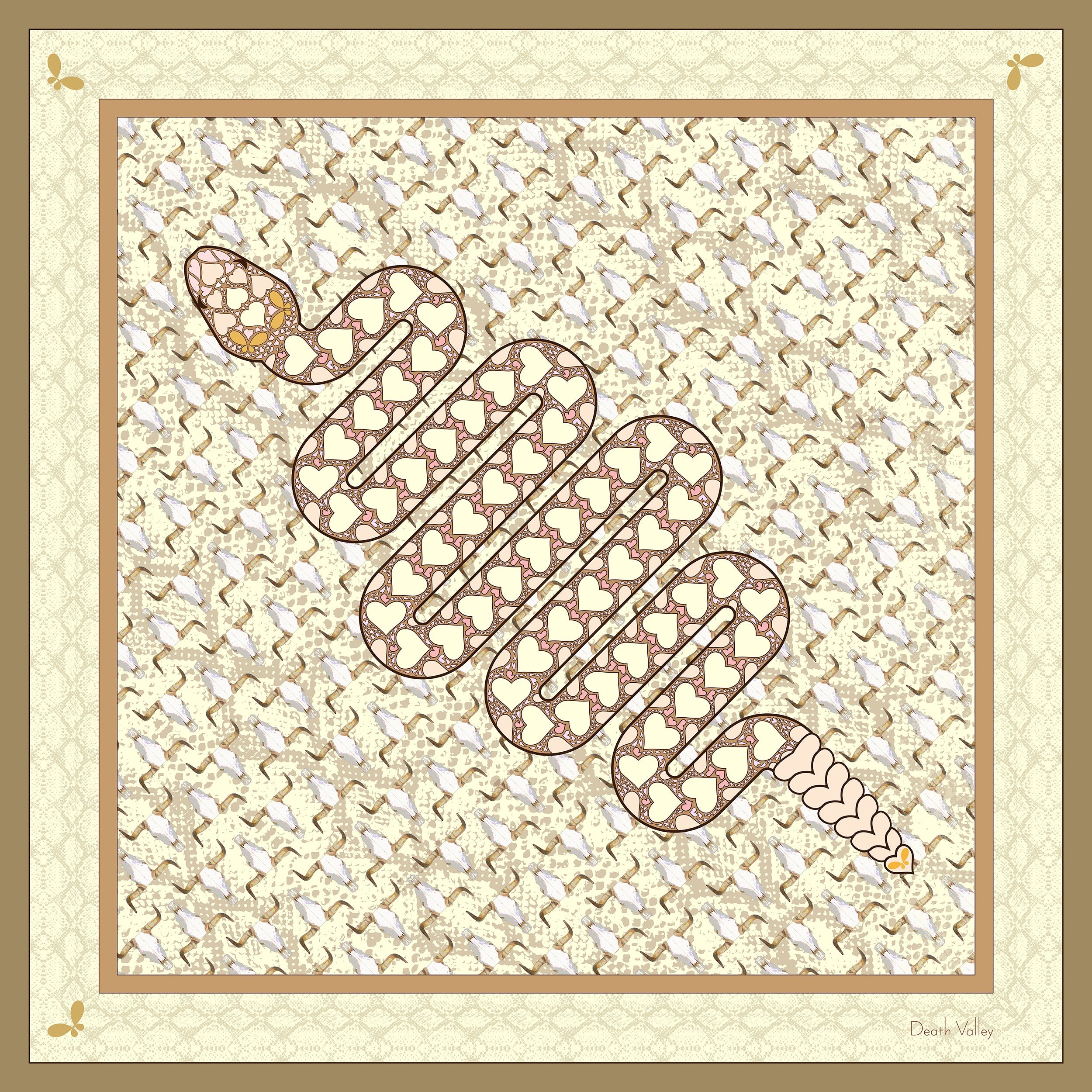 A swirl of snakeskin and goats skulls. Inspired by the extreme, barren and mysterious desert landscapes of Death Valley. Sheer, floaty and lightweight. Cream, ivory, sand and caramel shades.