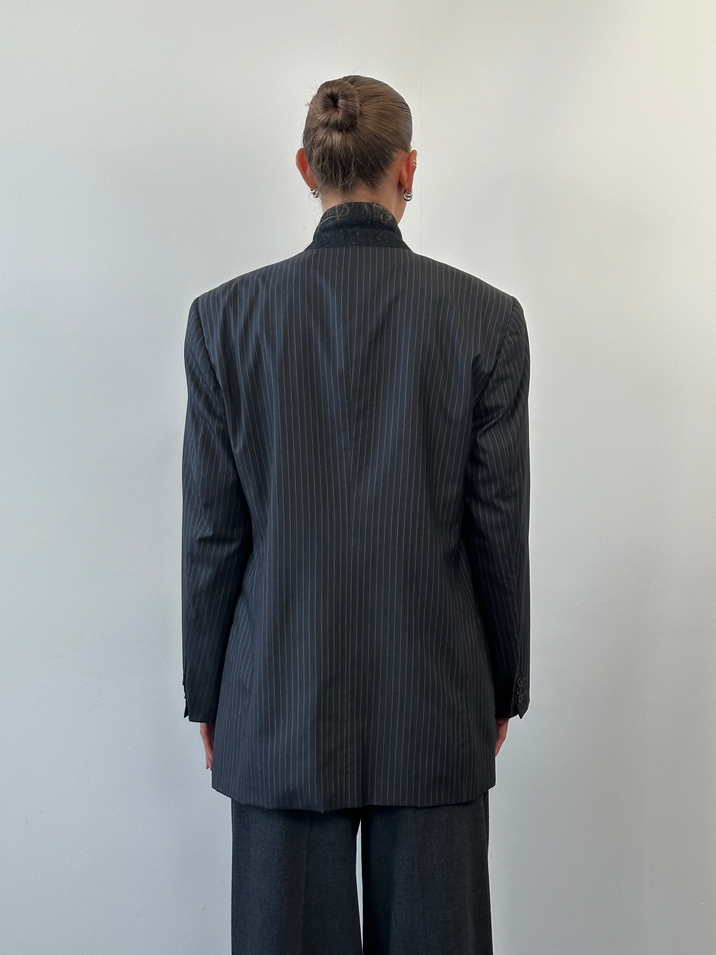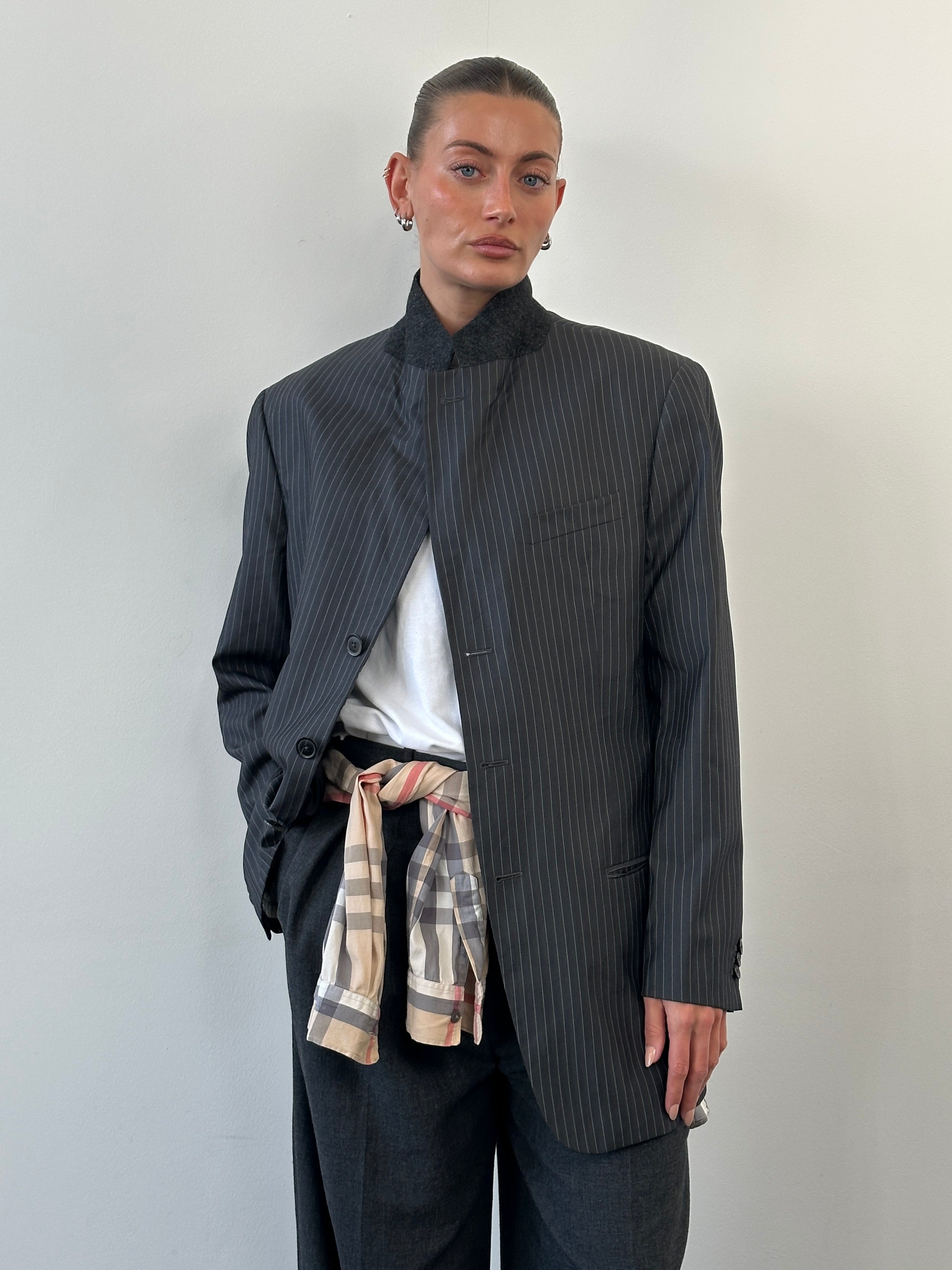 Vintage Armani Collezioni blazer in grey with a fine pinstripe, tailored in a classic single breasted silhouette with structured shoulders and a clean, elongated line. Crafted in Italy with a smooth bemberg cupro lining, this piece reflects refined 1990s Armani menswear tailoring.