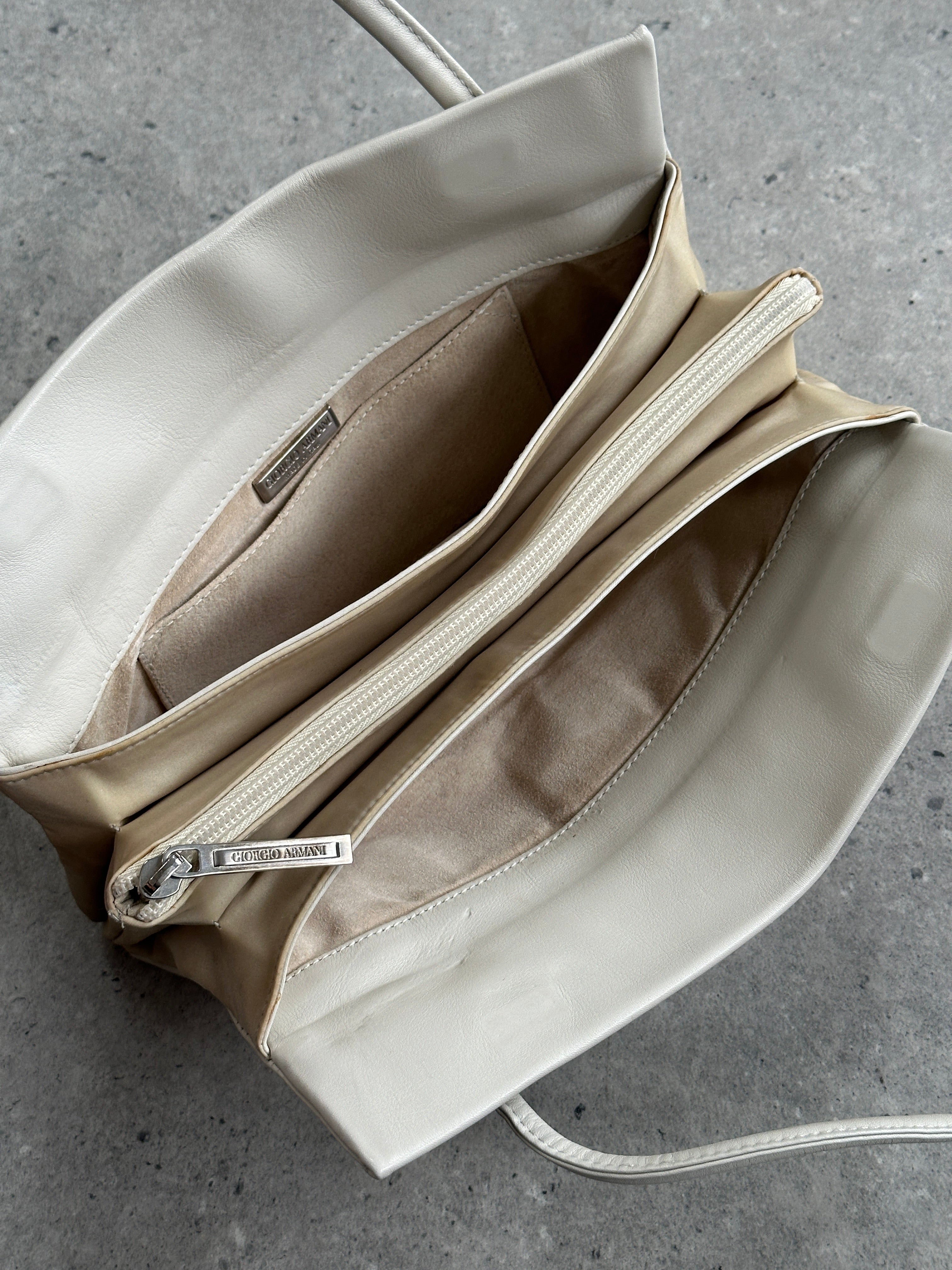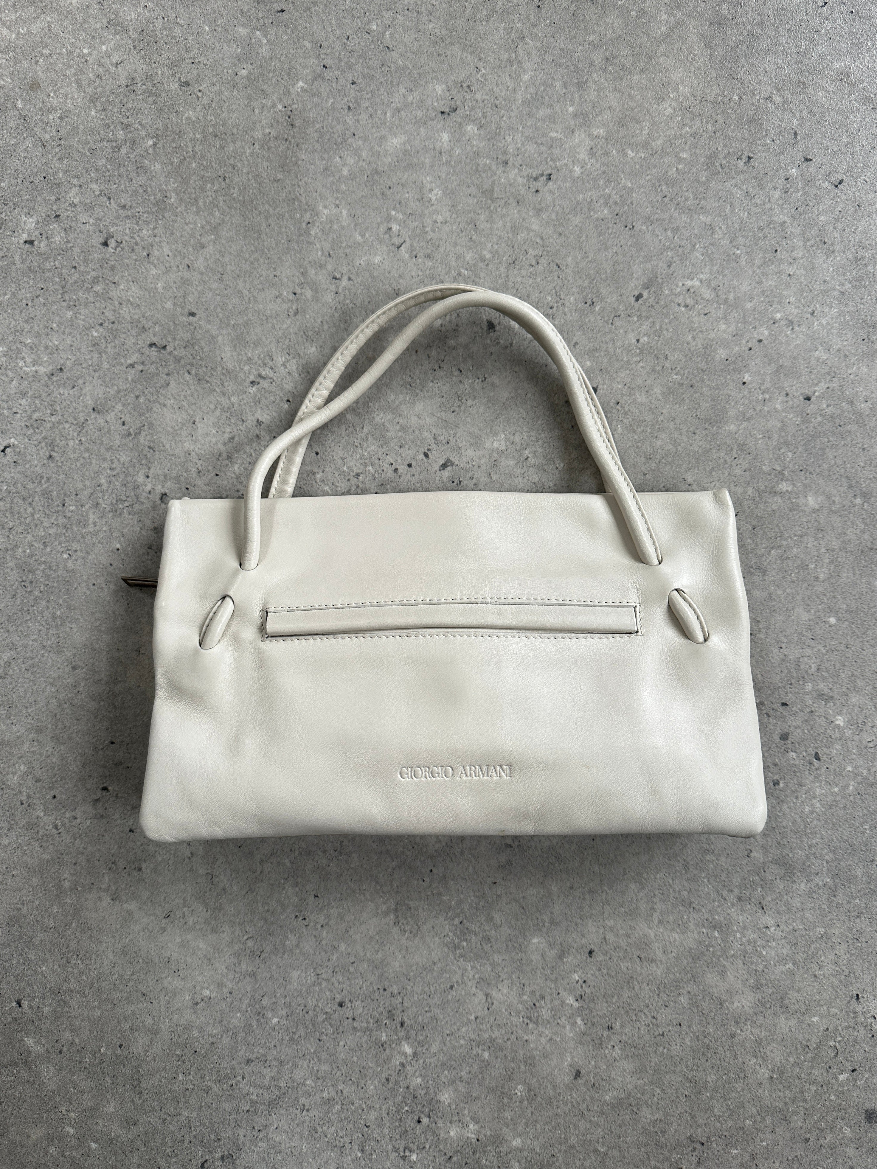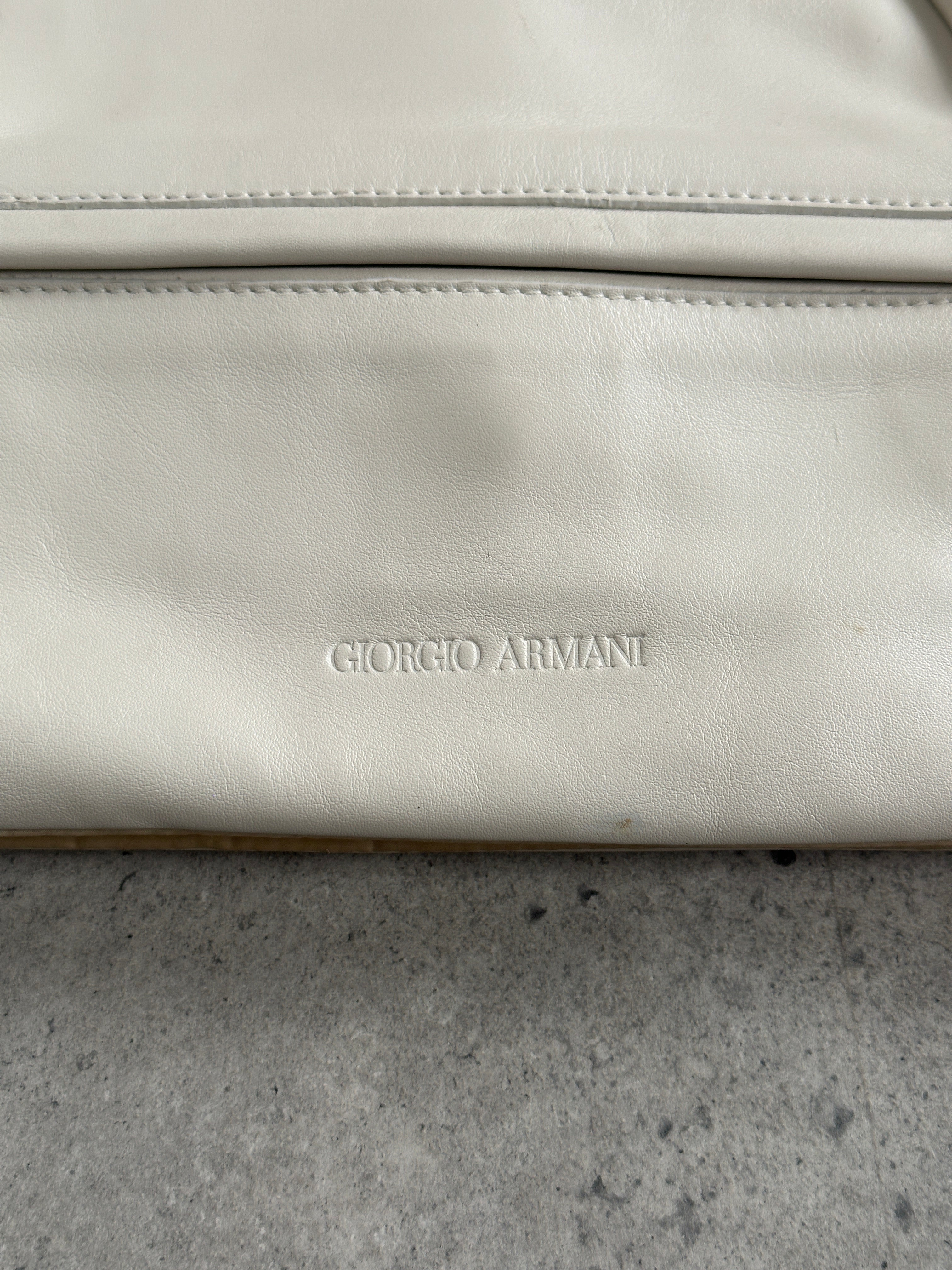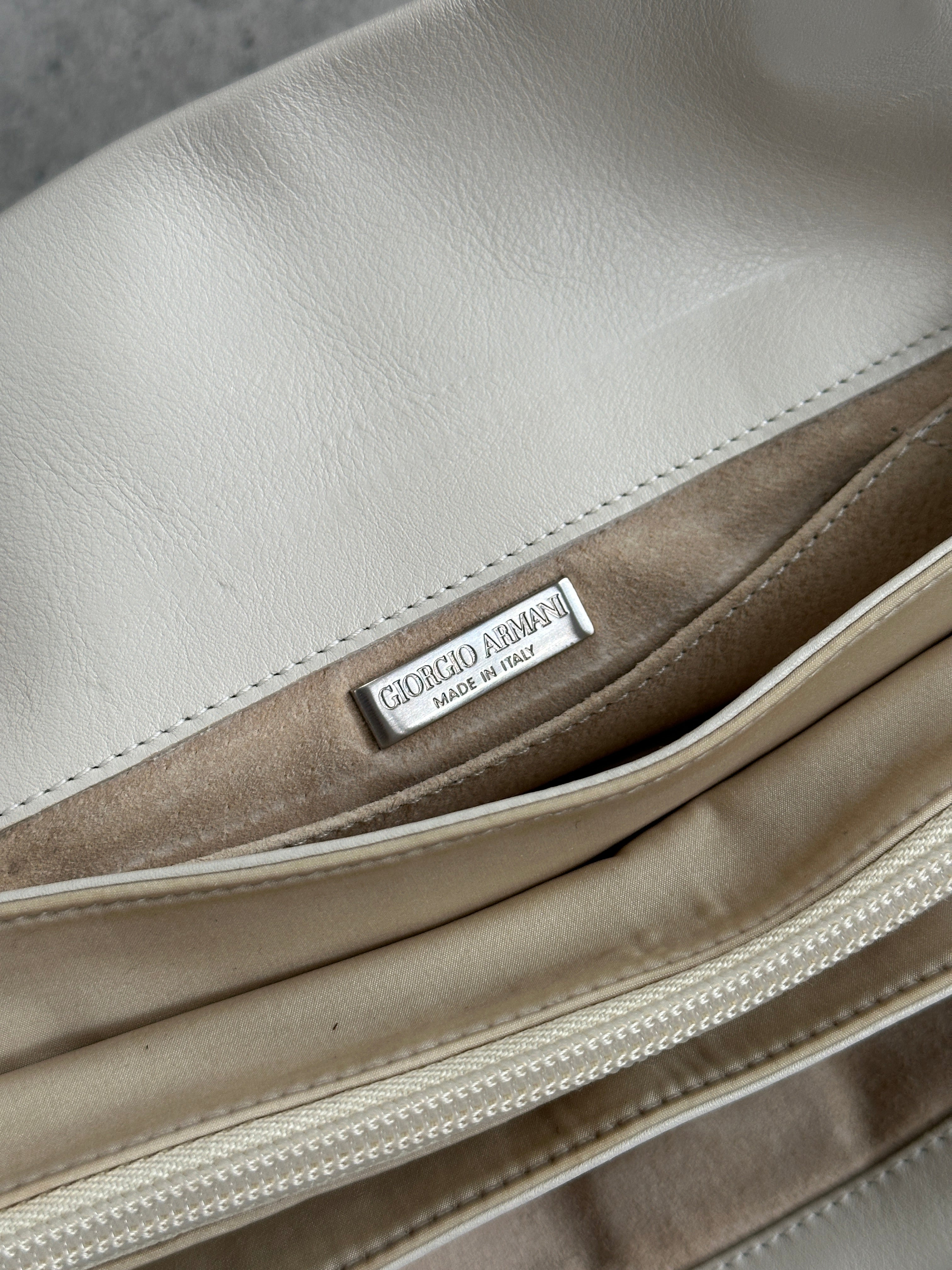 Vintage Giorgio Armani Le Collezioni 2000s ivory rectangular handbag crafted in supple Italian calf leather. Designed with integrated tubular handles, a suede-finish interior and subtle embossed branding. Includes a dust bag.