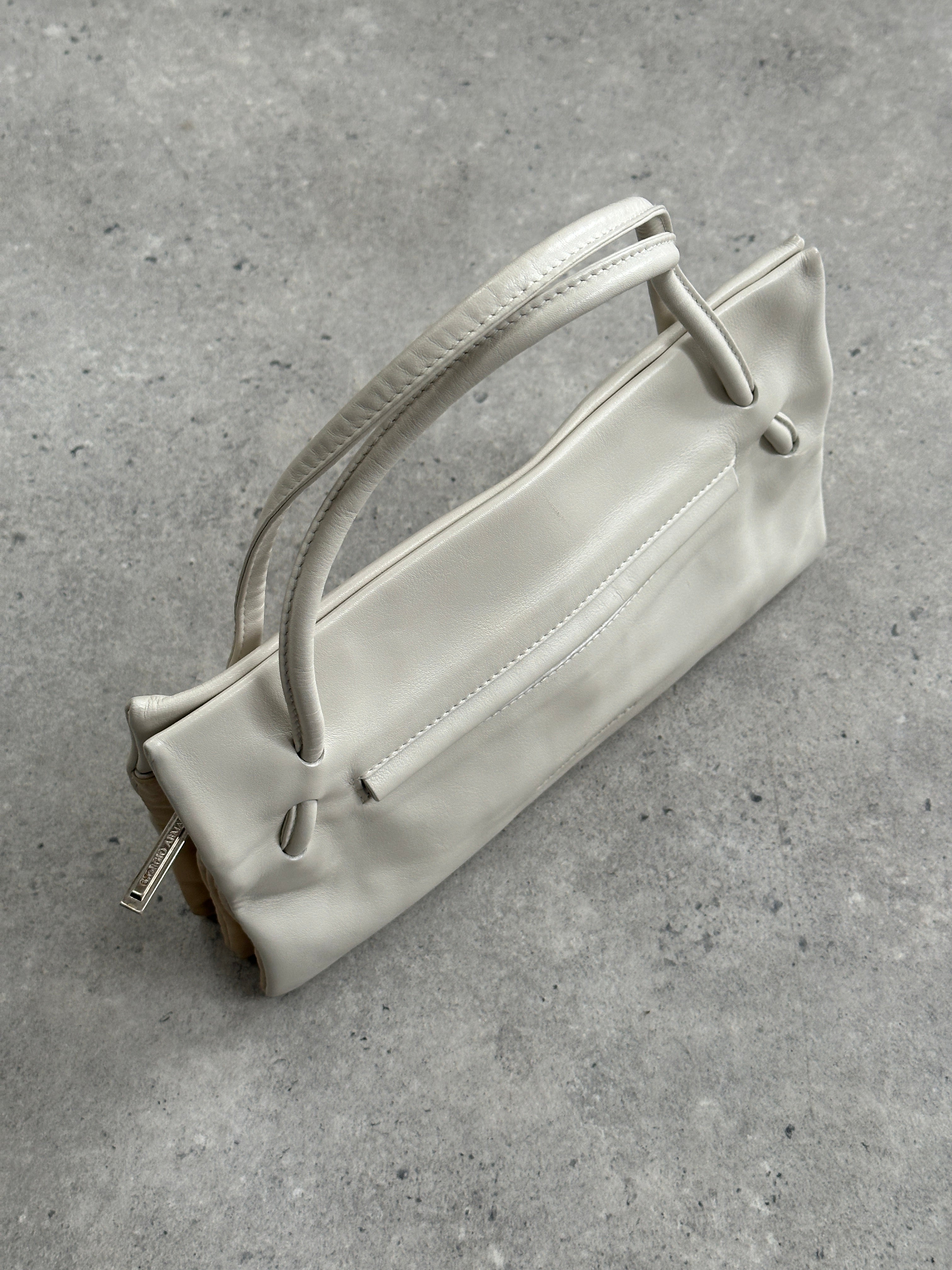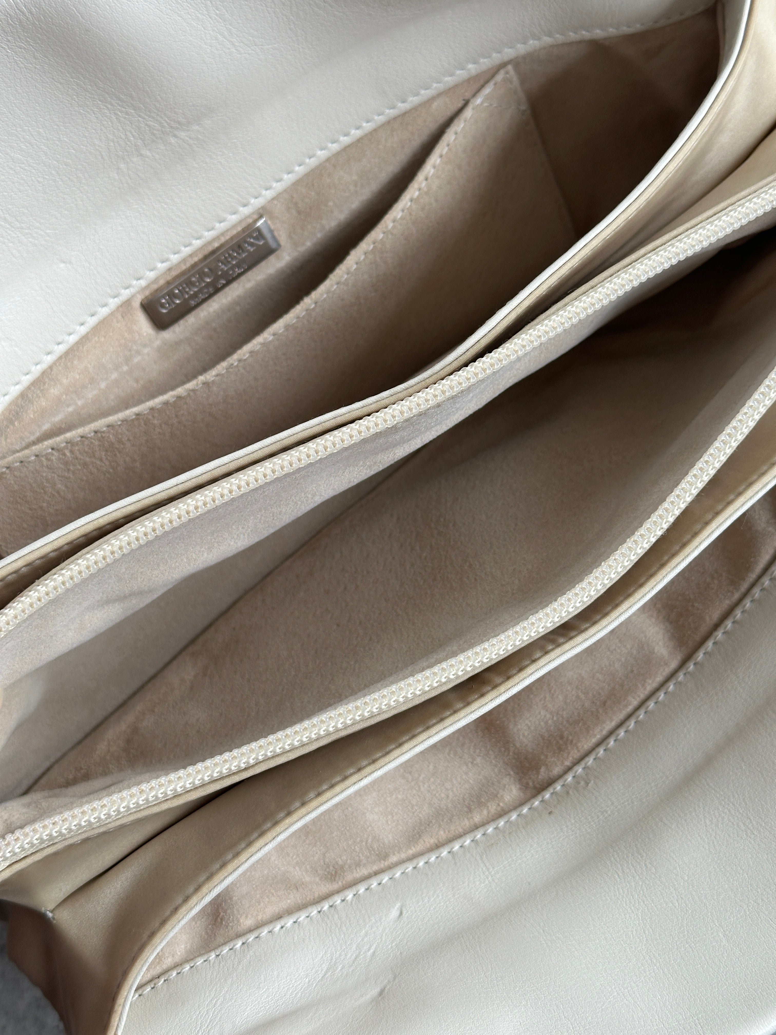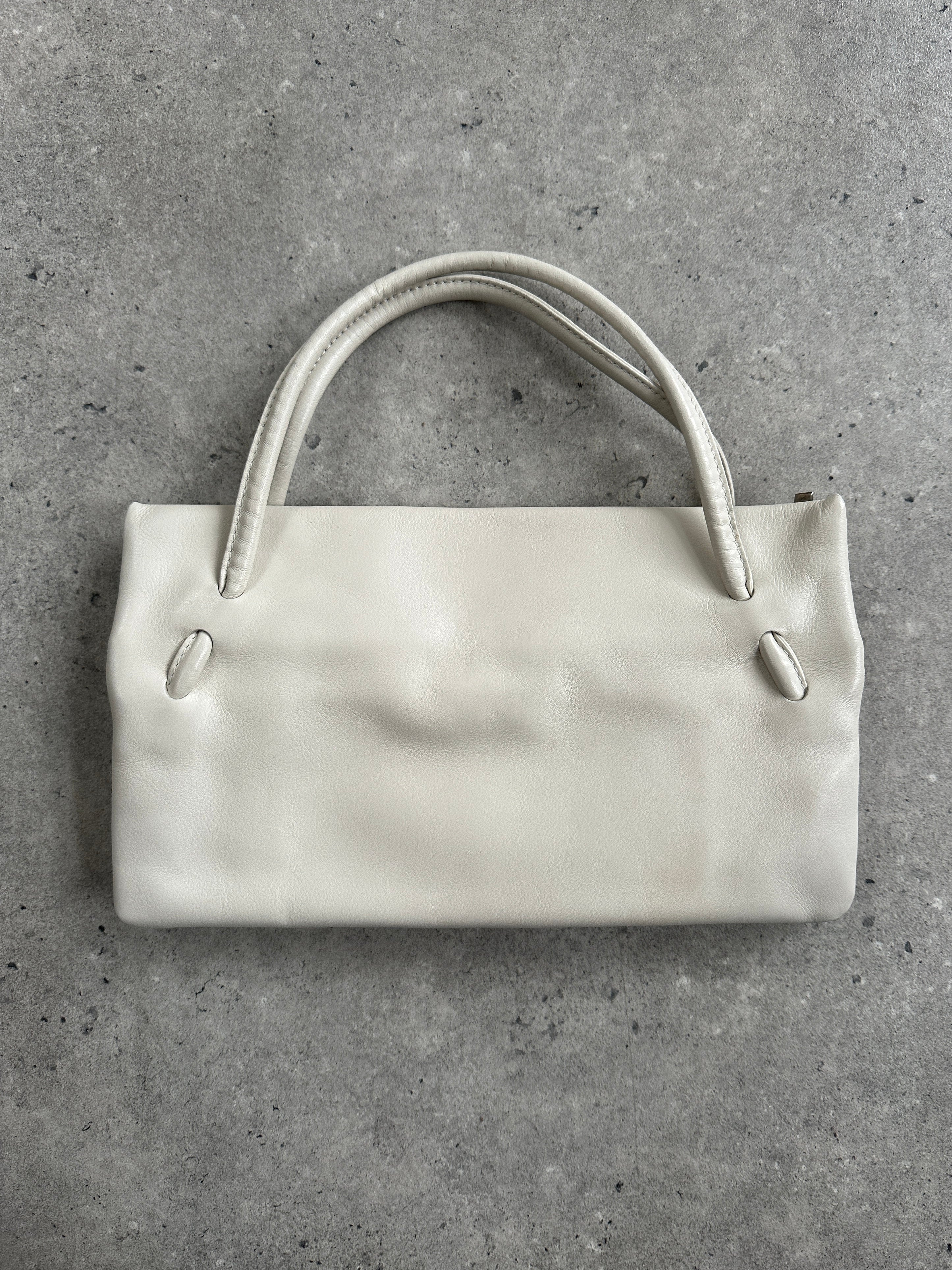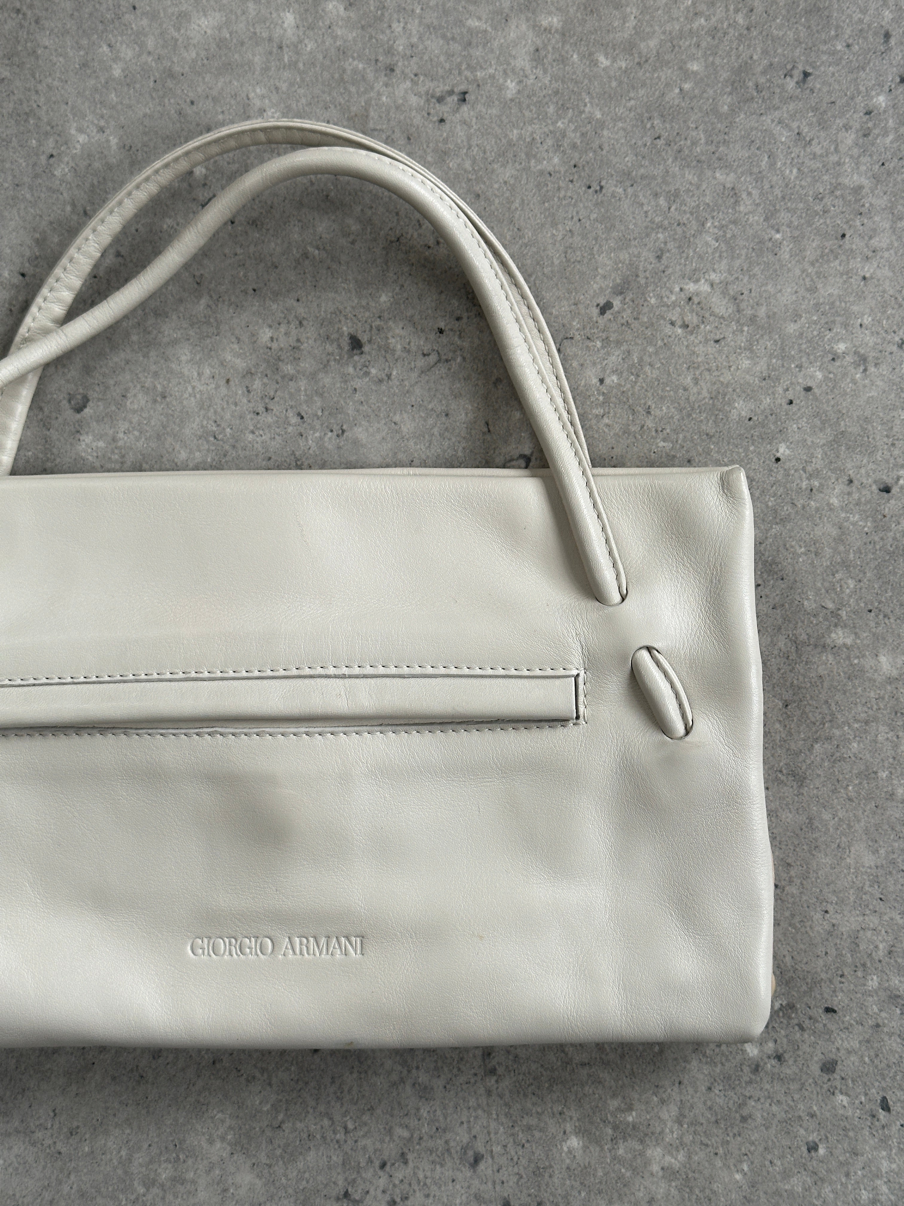 Vintage Giorgio Armani Le Collezioni 2000s ivory rectangular handbag crafted in supple Italian calf leather. Designed with integrated tubular handles, a suede-finish interior and subtle embossed branding. Includes a dust bag.