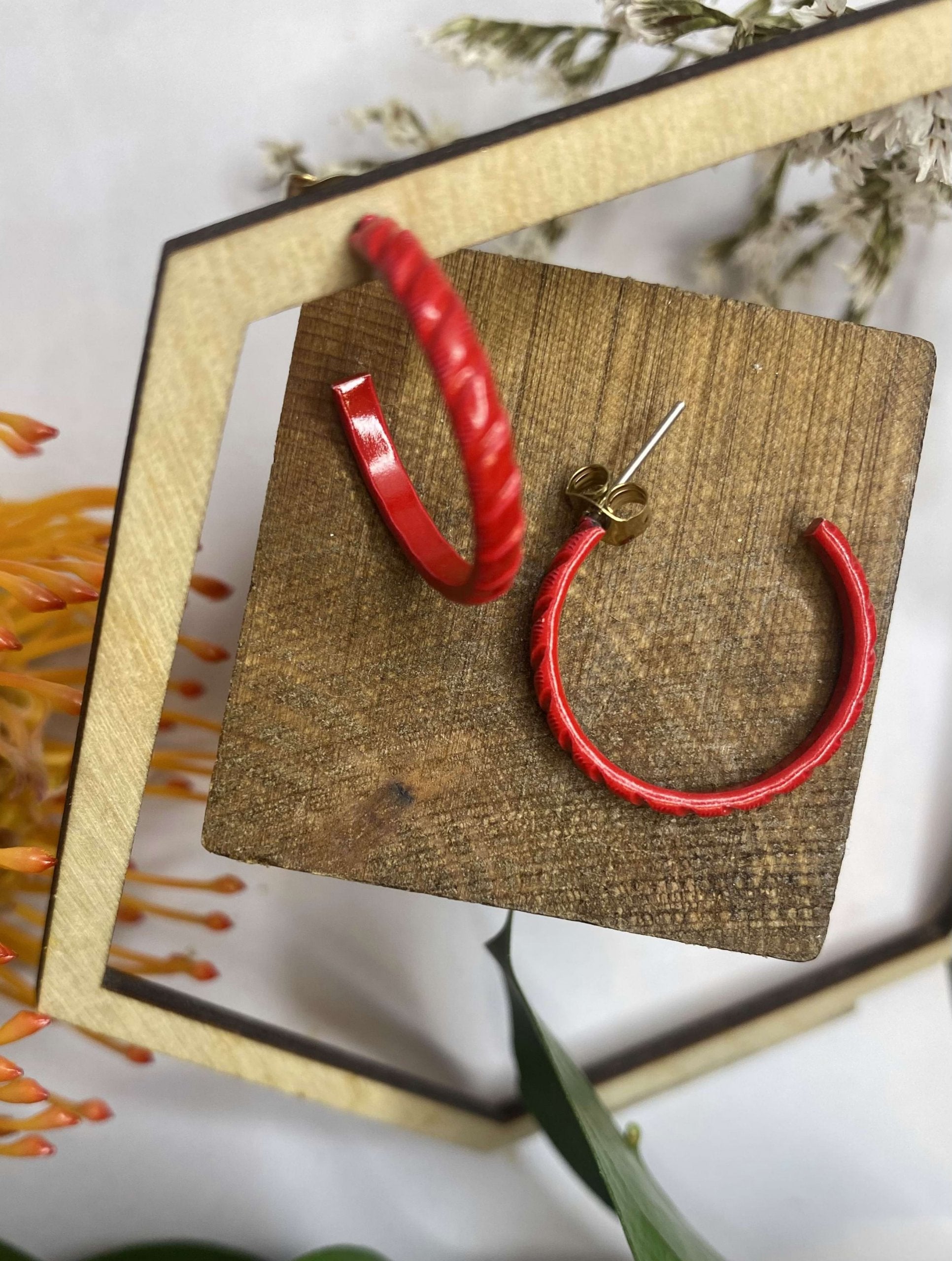 Intricate Patterned Design: These hoops feature a beautifully detailed pattern, adding texture and visual interest to the rich red enamel.
