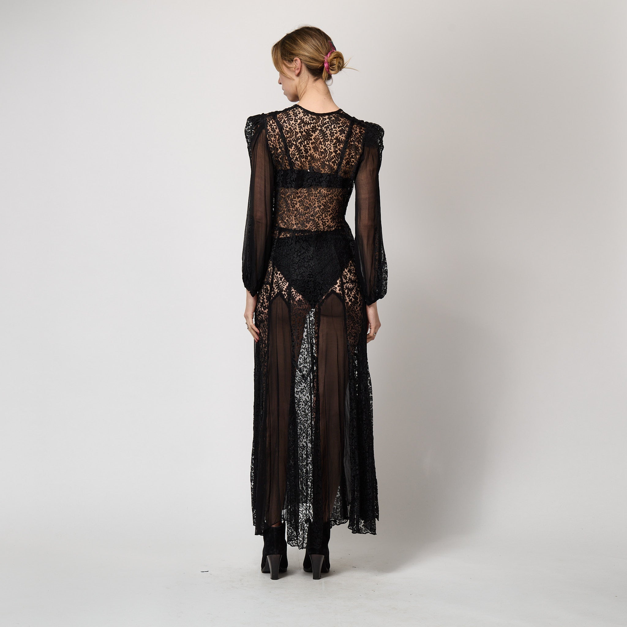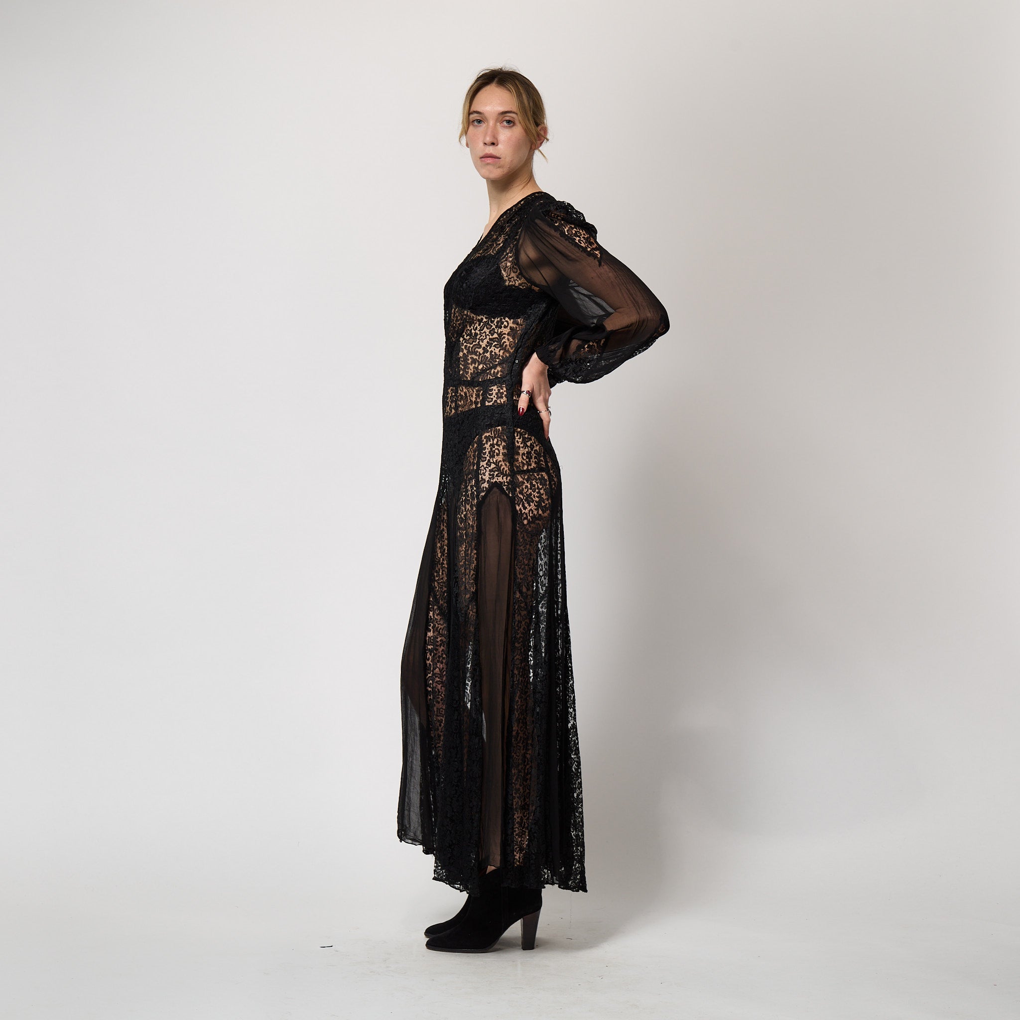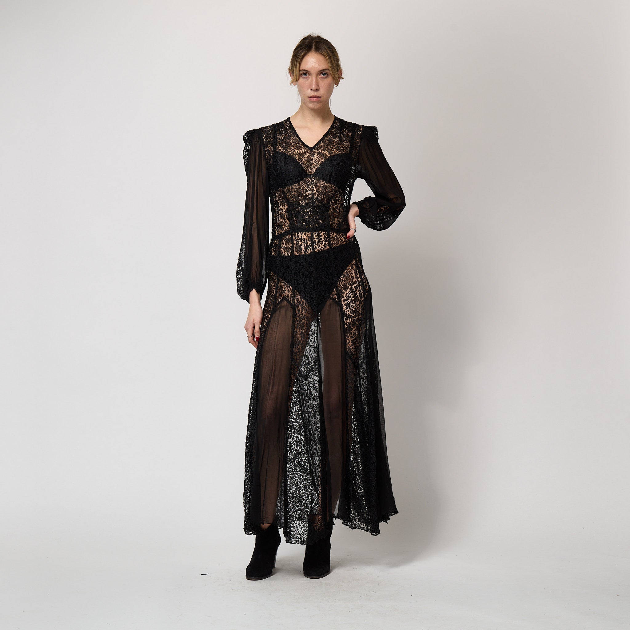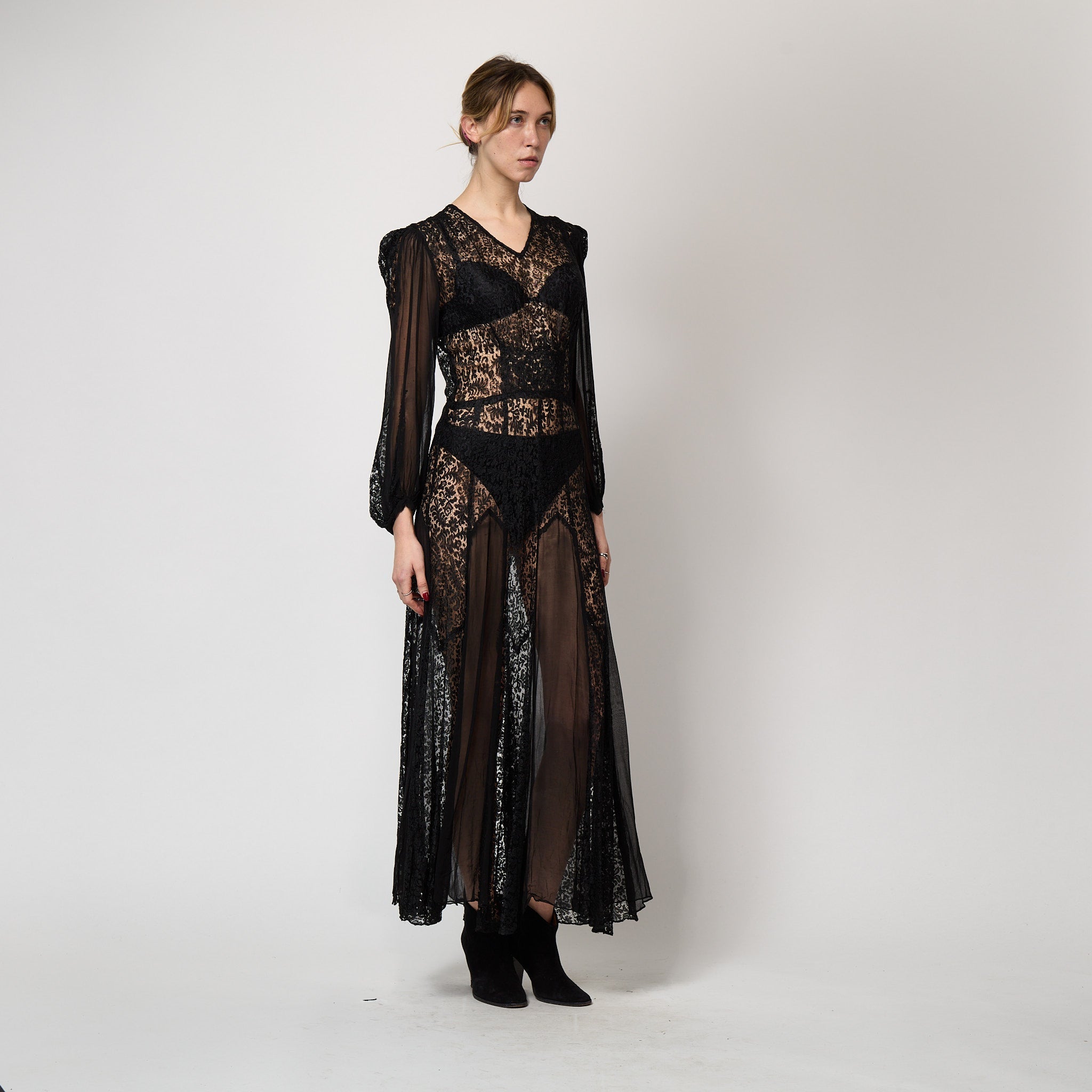 This highly romantic dress was made in the late 1930s and is breathtaking quality. Evening gowns of this era are highly sought after, particularly when they’re in such rare, excellent condition. Of a floor-skimming length, this piece is crafted from inky black lace cut through with panels of sheer chiffon. The neckline is cut to a high V-shape that hints at the décolletage. Tiny snap closures in tonal black close the gathered cuffs and the side opening to aid access. The swirling, flared skirt is formed from alternating panels of lace and chiffon which create a zig-zag hemline below the hips and recall graphic motifs made popular by the Art Deco movement at the time. The theatrical bell-sleeves, puff-shoulders and peekaboo cloth make it an extremely relevant piece among today’s trends. This couture quality gown was made nearly a century ago. With current day's designers drawing on these vintage silhouettes, why not grab an original? A good fit for up to a size UK 8 or US 4. Our model is a UK 6 US 0-2 and 5'11" and this was a good fit on her.