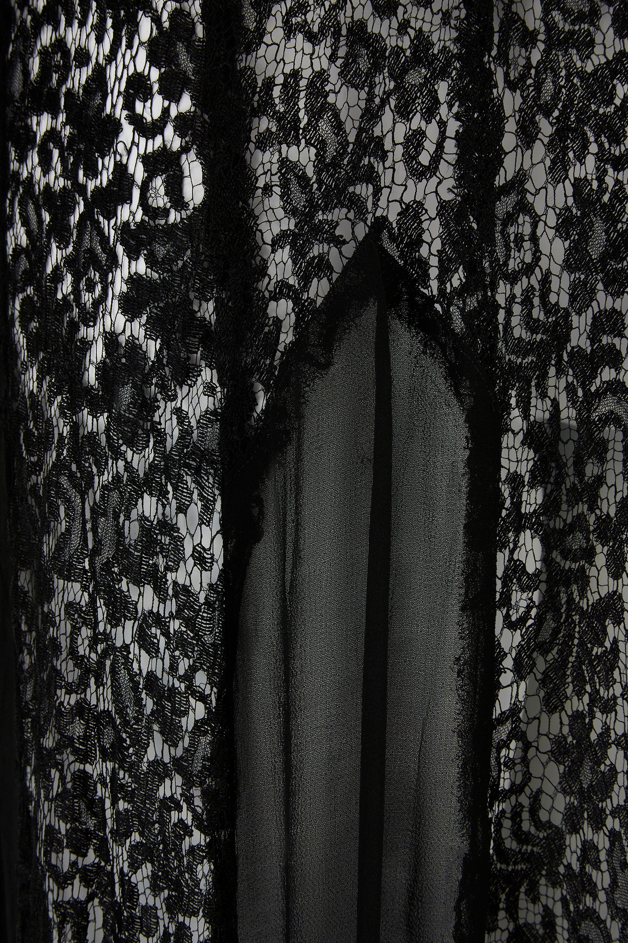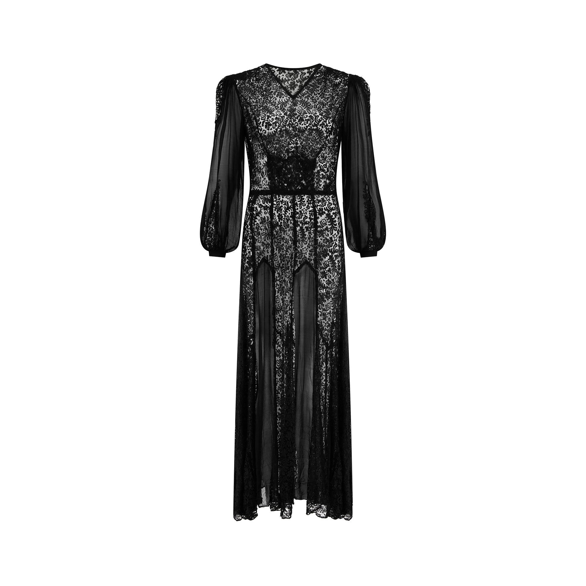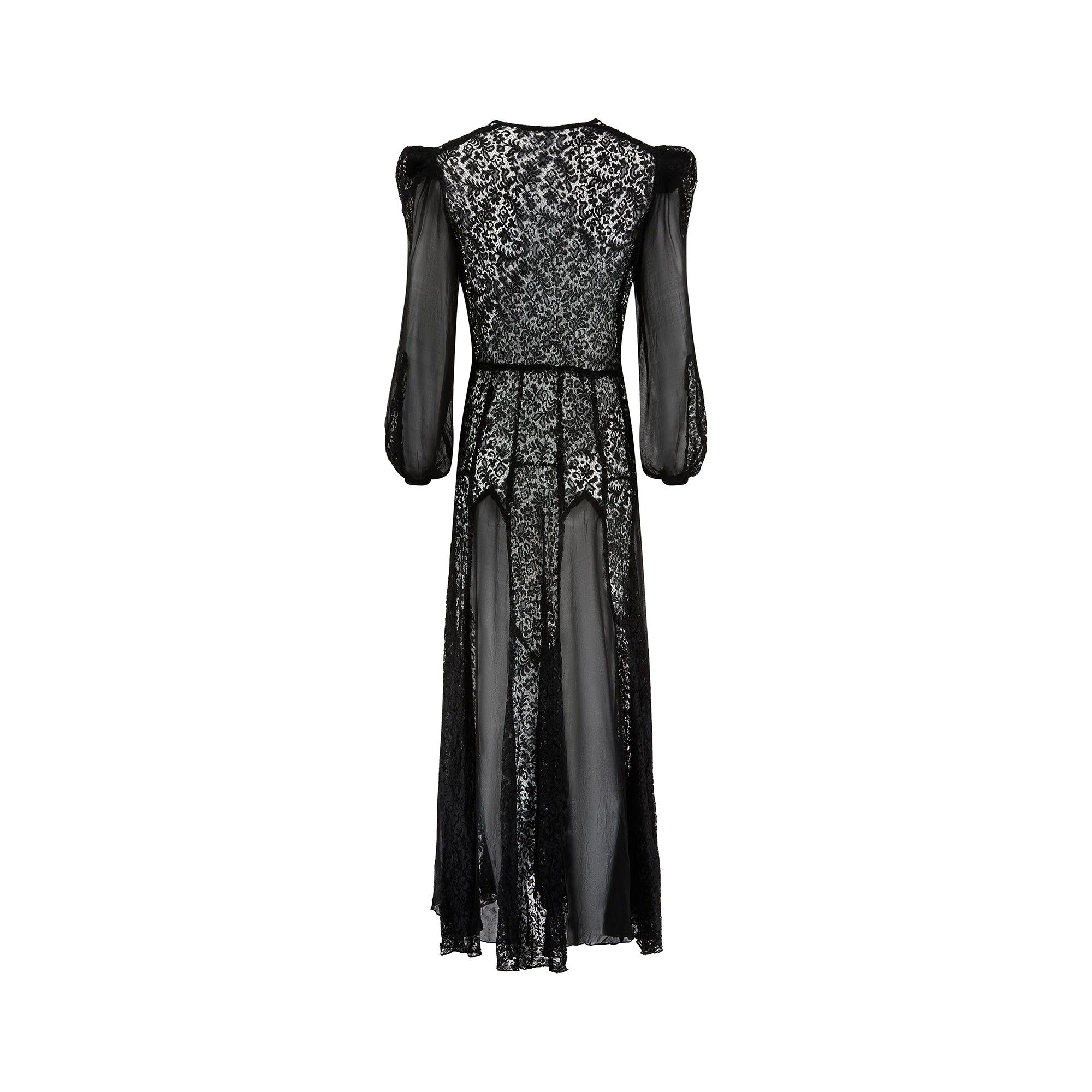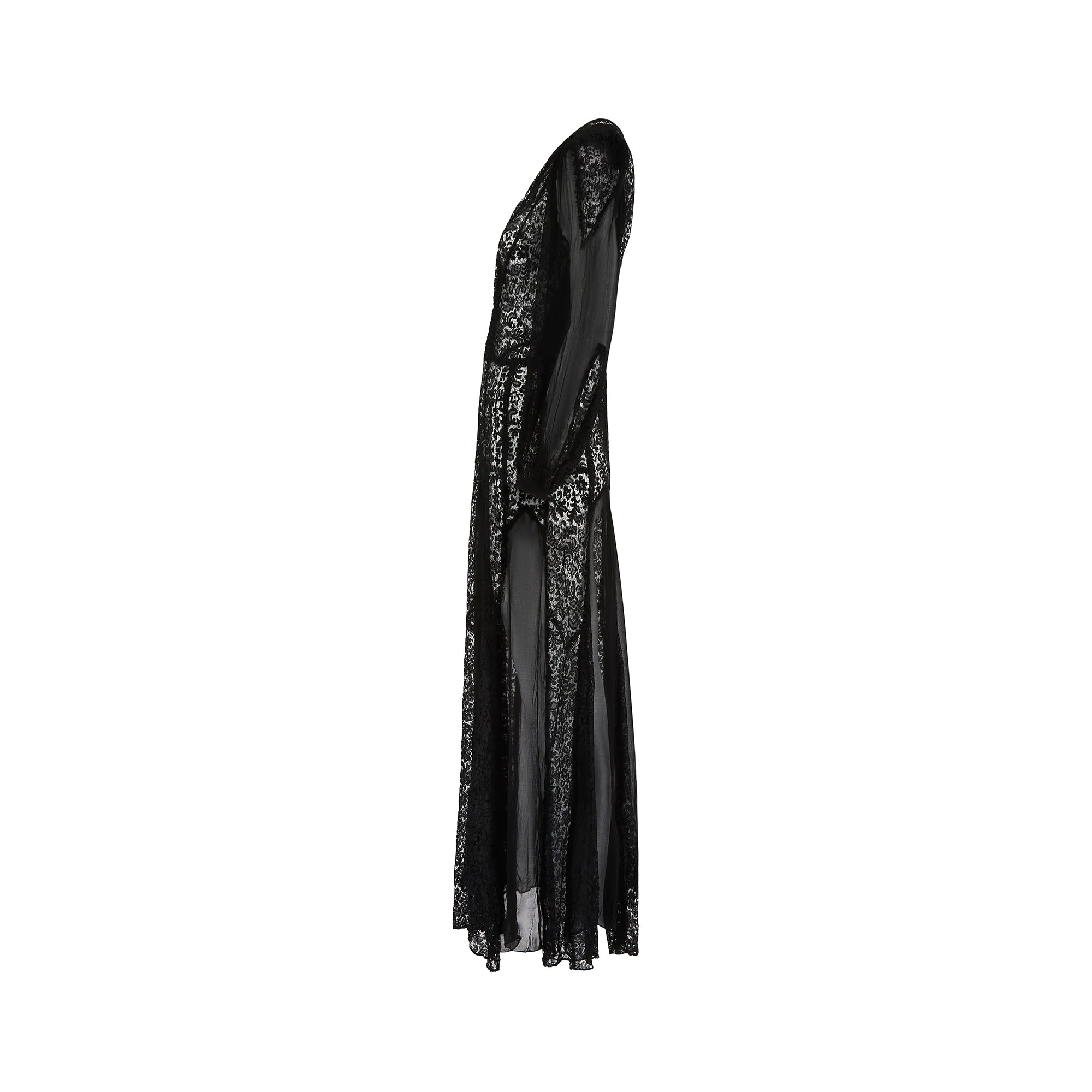 This highly romantic dress was made in the late 1930s and is breathtaking quality. Evening gowns of this era are highly sought after, particularly when they’re in such rare, excellent condition. Of a floor-skimming length, this piece is crafted from inky black lace cut through with panels of sheer chiffon. The neckline is cut to a high V-shape that hints at the décolletage. Tiny snap closures in tonal black close the gathered cuffs and the side opening to aid access. The swirling, flared skirt is formed from alternating panels of lace and chiffon which create a zig-zag hemline below the hips and recall graphic motifs made popular by the Art Deco movement at the time. The theatrical bell-sleeves, puff-shoulders and peekaboo cloth make it an extremely relevant piece among today’s trends. This couture quality gown was made nearly a century ago. With current day's designers drawing on these vintage silhouettes, why not grab an original? A good fit for up to a size UK 8 or US 4. Our model is a UK 6 US 0-2 and 5'11" and this was a good fit on her.