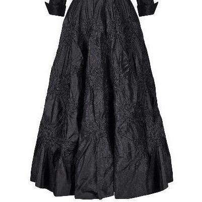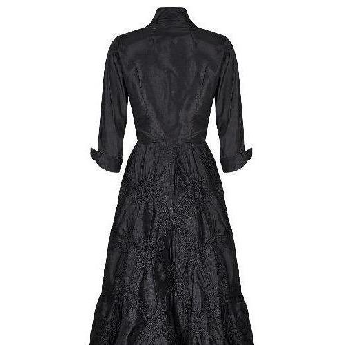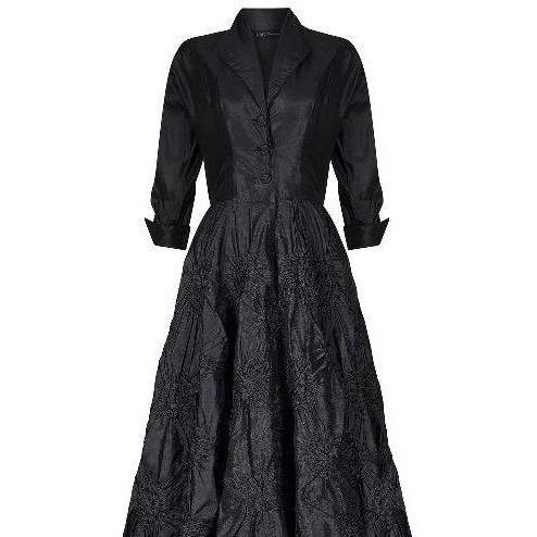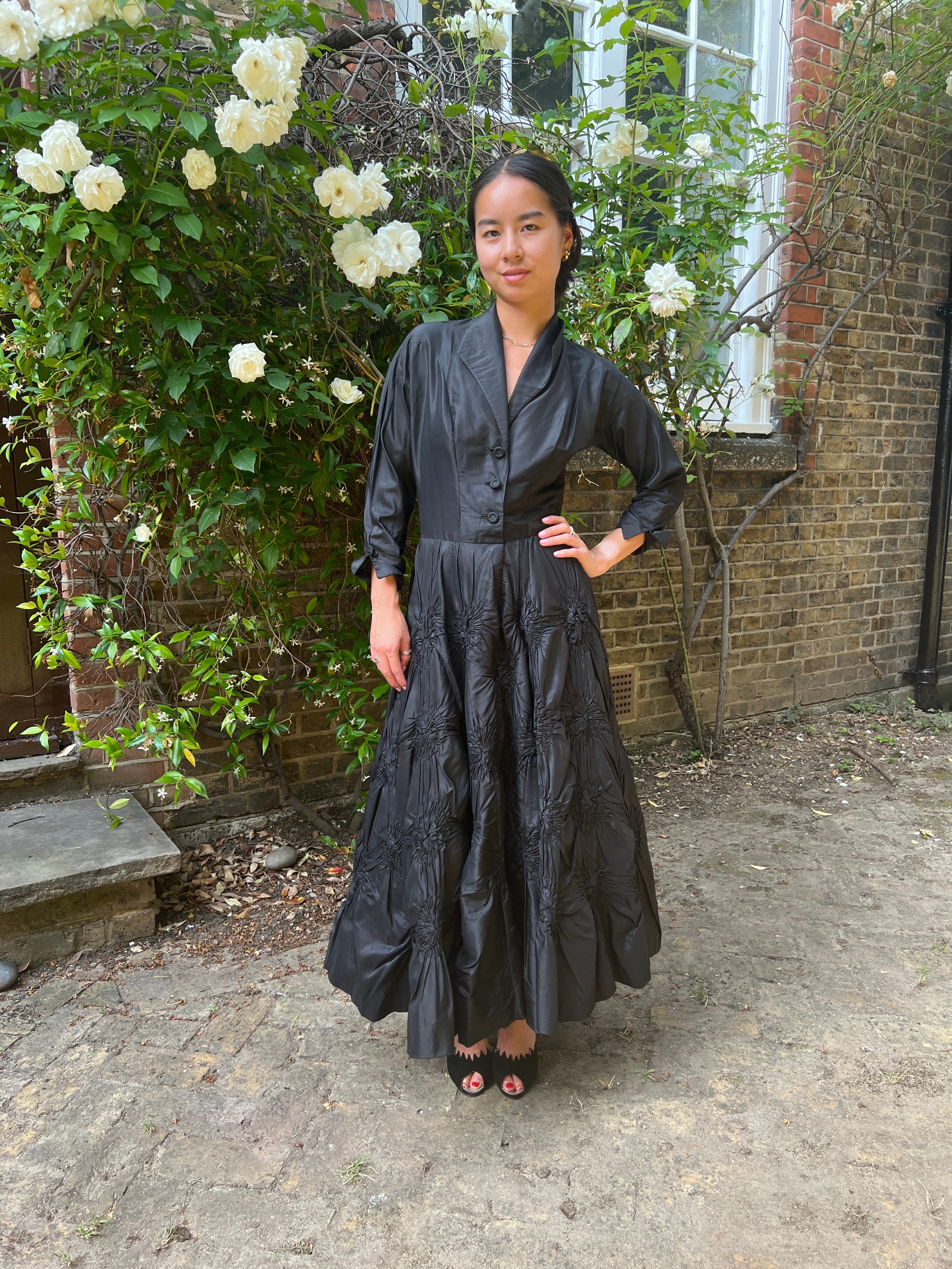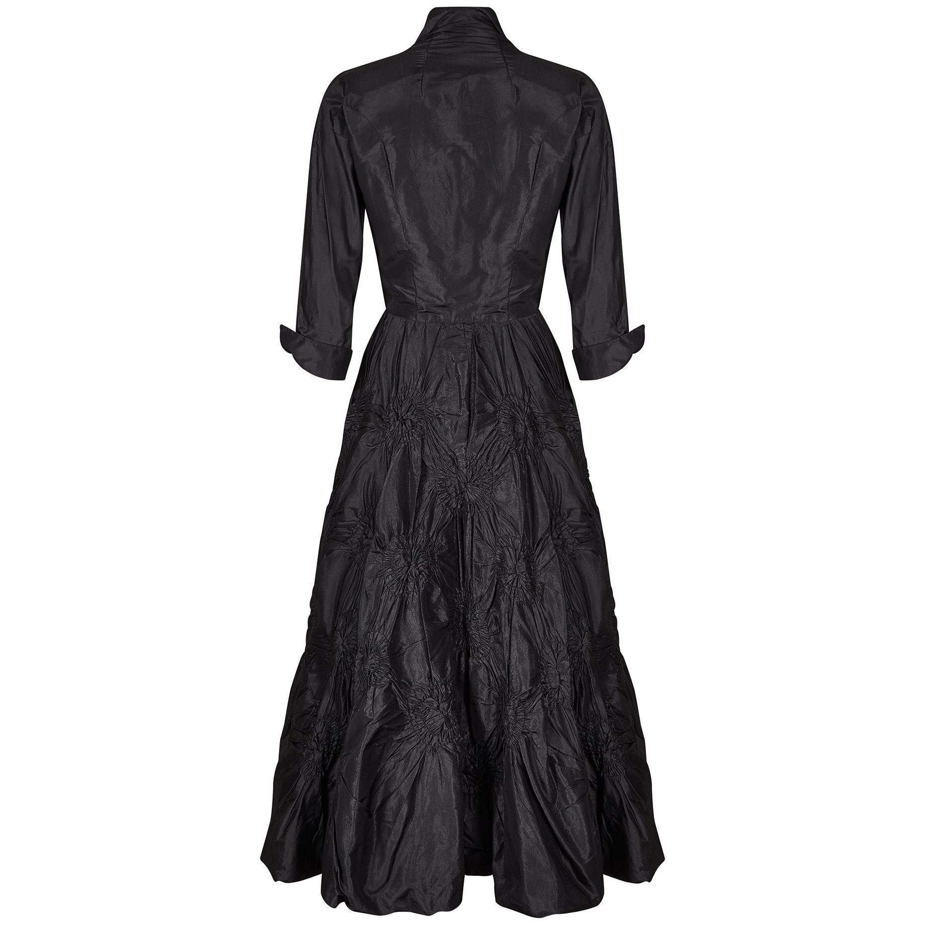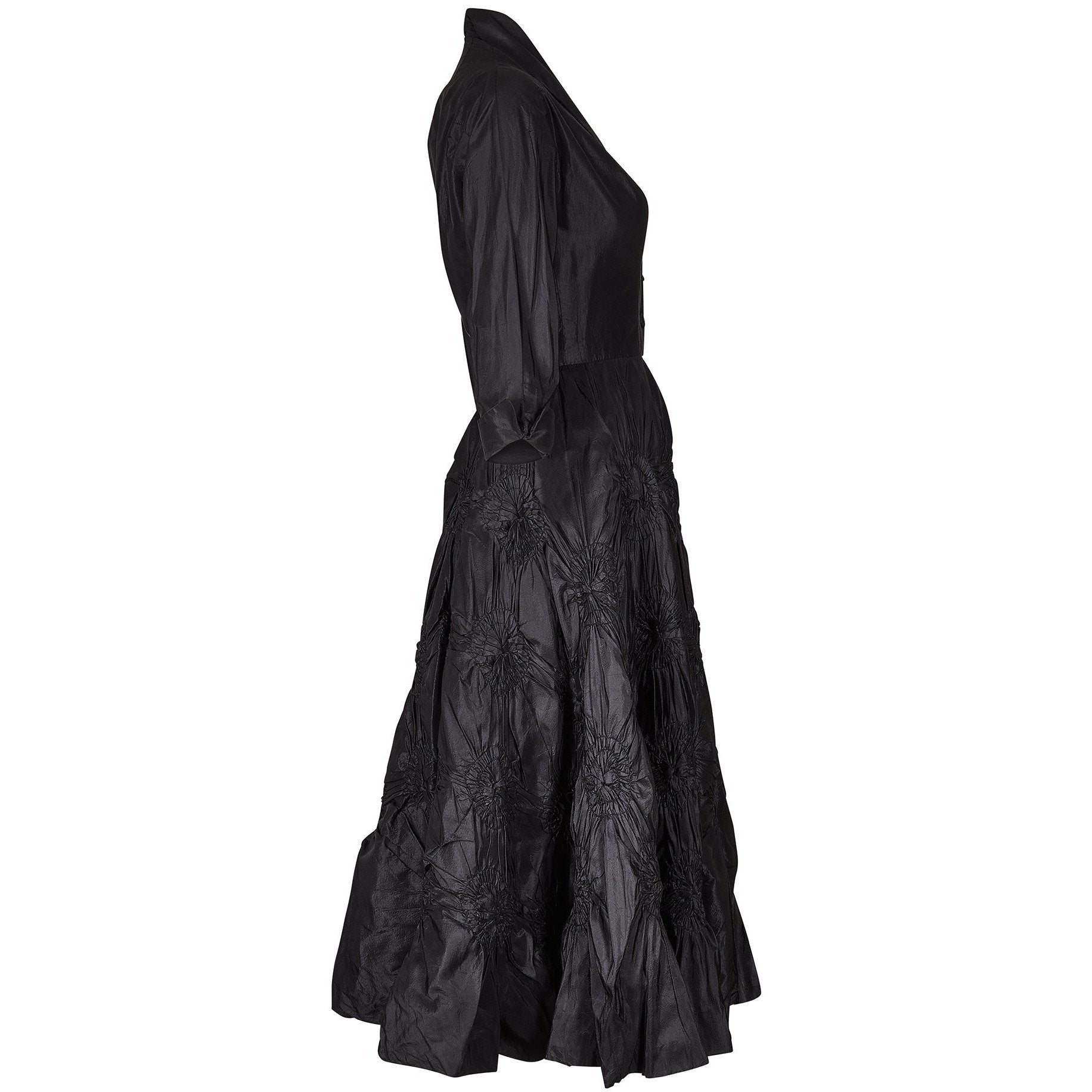 This is a brilliant example of Ceil Chapman's early work from the late 1940s to early 1950s and the black taffeta silk design is exquisite. Its the first thing you notice about this dress which has the most unusual construction. The skirt's textured element from a distance looks like a floral design but its actually a large number of circular pleated stitched designs. The way the fabric is pulled and stitched creates an almost 3D effect. We have never seen this work before but it would have taken a very skilled seamstress and an incredible amount of time to do it. The dress style is a classic shirt-waister design with three taffeta covered buttons to fasten the bodice which is beautifully shaped and Princess seamed. The sleeves are three quarter length and feature a folded cuff. The skirt element is lined with a stiffed tulle net which gives structure whilst the bodice is unlined. It is labelled with the early Ceil Chapman label in black with white scroll.